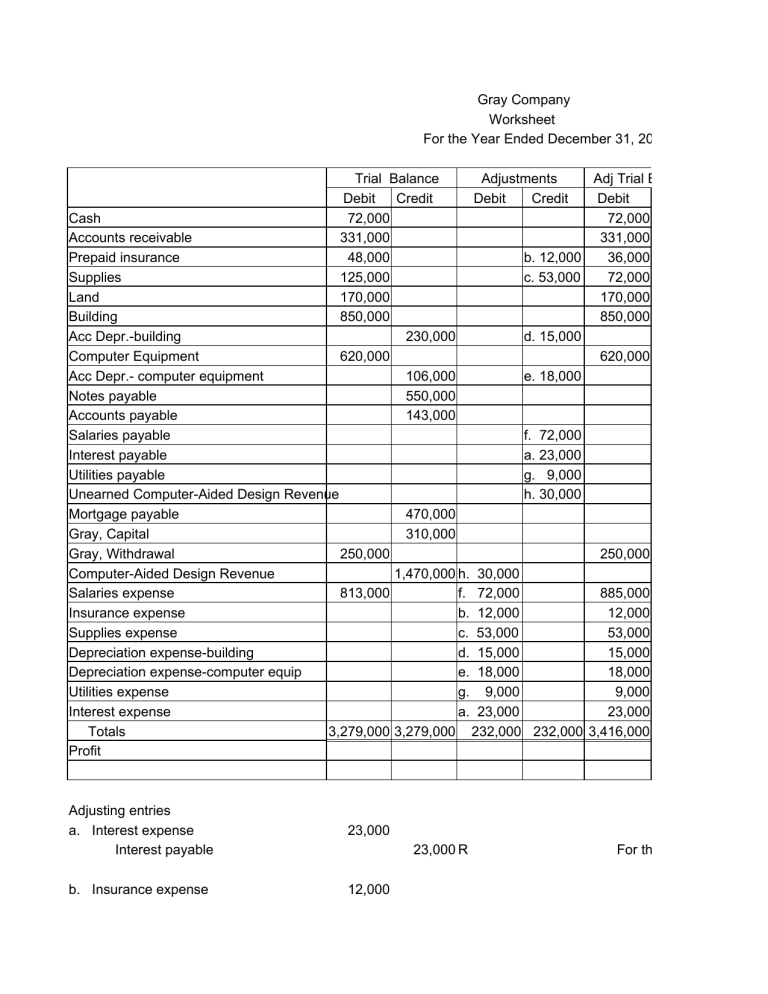 Gray Company Worksheet For the Year Ended December 31, 2019 Trial Balance Debit Credit 72,000 331,000 48,000 125,000 170,000 850,000 230,000 620,000 106,000 550,000 143,000 Adjustments Debit Credit Adj Trial Balance Debit 72,000 331,000 b. 12,000 36,000 c. 53,000 72,000 170,000 850,000 d. 15,000 620,000 e. 18,000 Cash Accounts receivable Prepaid insurance Supplies Land Building Acc Depr.-building Computer Equipment Acc Depr.- computer equipment Notes payable Accounts payable Salaries payable f. 72,000 Interest payable a. 23,000 Utilities payable g. 9,000 Unearned Computer-Aided Design Revenue h. 30,000 Mortgage payable 470,000 Gray, Capital 310,000 Gray, Withdrawal 250,000 250,000 Computer-Aided Design Revenue 1,470,000 h. 30,000 Salaries expense 813,000 f. 72,000 885,000 Insurance expense b. 12,000 12,000 Supplies expense c. 53,000 53,000 Depreciation expense-building d. 15,000 15,000 Depreciation expense-computer equip e. 18,000 18,000 Utilities expense g. 9,000 9,000 Interest expense a. 23,000 23,000 Totals 3,279,000 3,279,000 232,000 232,000 3,416,000 Profit Adjusting entries a. Interest expense Interest payable 23,000 b. Insurance expense 12,000 23,000 R For the Year Ended Dece Prepaid insurance 12,000 c. Supplies expense Supplies 53,000 d. Depreciation expense-building Acc depr-building 15,000 Depreciation expense-Comp. Equip Acc depr - Com Equip 18,000 Salaries expense Salaries payable 72,000 e. f. g. h. Utilities expense Utilities payable 53,000 15,000 18,000 72,000 R Statement of Changes in For the Year Ended Dece 9,000 Computer-Aided Design Revenue 30,000 Unearned Computer-Aided Design Rev 8 pts adjusting entries 1 Work sheet trial balance total 1 Worksheet adjustment total 1 Worksheet adjusted trial balance total 1 Worksheet Profit of 425,000 1 Worksheet Balance sheet total 5 Income statement, Presentation 5 Statement of Changes in Equity 5 Balance sheet 28 points total Computer-Aided Design Revenue Less Expenses: Salaries expense Insurance expense Supplies expense Depreciation expense-building Depreciation expense-comput Utilities expense Interest expense Total Profit 9,000 R 30,000 R Gray Capital Jan 1, 2019 Add: Profit Total Less Withdrawal Gray Capital Dec. 31, 2019 mber 31, 2019 Adj Trial Balance Credit Income Statement Debit Credit 245,000 124,000 550,000 143,000 72,000 23,000 9,000 30,000 470,000 310,000 Balance Sheet Debit Credit 72,000 331,000 36,000 72,000 170,000 850,000 245,000 620,000 124,000 550,000 143,000 72,000 23,000 9,000 30,000 470,000 310,000 250,000 1,440,000 ### 885,000 12,000 53,000 15,000 18,000 9,000 23,000 3,416,000 ### 425,000 ### ### 2,401,000 1,976,000 425,000 ### 2,401,000 2,401,000 Gray Company Income Statement For the Year Ended December 31, 2019 1 pt r-Aided Design Revenue Salaries expense Insurance expense Supplies expense Depreciation expense-building Depreciation expense-computer equip Utilities expense Interest expense 1,440,000 1 pt 885,000 12,000 53,000 15,000 18,000 9,000 23,000 1,015,000 1 pt 425,000 2 pts Gray Company Statement of Changes in Equity 1 pt For the Year Ended December 31, 2019 ital Jan 1, 2019 ital Dec. 31, 2019 310,000 425,000 735,000 1 pt 250,000 1 pt 485,000 2 pts Gray Company Balance Sheet December 31,, 2019 1 pt Assets Current Assets Cash Accounts receivable Prepaid insurance Supplies Total Current Assets Non-Current Assets Land Building Acc Depr.-building Computer Equipment Acc Depr.- computer equipment Total Non-current Assets Total Assets Closing entries 2019 Dec 31 72,000 331,000 36,000 72,000 511,000 1 pt 170,000 850,000 245,000 620,000 124,000 605,000 496,000 1,271,000 1 pt 1,782,000 Liabilities Current Liabilities Notes payable Accounts payable Salaries payable Interest payable Utilities payable Unearned Computer-Aided Design Revenue Total Current Liabilities Long-term Liability Mortgage payable Total Liabilities 550,000 143,000 72,000 23,000 9,000 30,000 827,000 1 pt 470,000 1,297,000 Owner"s Equity Total Liabilities and Owner's Equity 485,000 1,782,000 1 pt Closing entries Computer-Aided Design Revenue Income Summary 1,440,000 1,440,000 Income Summary 1,015,000 Salaries expense Insurance expense Supplies expense Depreciation expense-building Depreciation expense-comp equip Utilities expense Interest expense 885,000 12,000 53,000 15,000 18,000 9,000 23,000 Income Summary Gray, Capital 425,000 425,000 Gray, Capital Gray Withdrawal 250,000 250,000 Gray Company Post-Closing Trial Balance December 31, 2019 Cash Accounts receivable Prepaid insurance Supplies Land Building Acc Depr.-building Computer Equipment Acc Depr.- computer equipment Notes payable Accounts payable Salaries payable Interest payable Utilities payable Unearned Computer-Aided Design Revenue Mortgage payable Gray, Capital 72,000 331,000 36,000 72,000 170,000 850,000 245,000 620,000 2,151,000 124,000 550,000 143,000 72,000 23,000 9,000 30,000 470,000 485,000 2,151,000