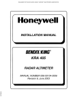 RELEASED FOR THE EXCLUSIVE USE BY: AIRCRAFT ELECTRONICS ASSOCIATION h INSTALLATION MANUAL KRA 405 RADAR ALTIMETER UP536434 MANUAL NUMBER 006-00104-0006 Revision 6, June 2003 RELEASED FOR THE EXCLUSIVE USE BY: AIRCRAFT ELECTRONICS ASSOCIATION WARNING THE ENCLOSED TECHNICAL DATA IS ELIGIBLE FOR EXPORT UNDER LICENSE DESIGNATION NLR AND IS TO BE USED SOLELY BY THE INDIVIDUAL/ ORGANIZATION TO WHOM IT IS ADDRESSED. DIVERSION CONTRARY TO U.S. LAW IS PROHIBITED. COPYRIGHT NOTICE © 1994, 2003 HONEYWELL INTERNATIONAL INC. UP536434 REPRODUCTION OF THIS PUBLICATION OR ANY PORTION THEREOF BY ANY MEANS WITHOUT THE EXPRESS WRITTEN PERMISSION OF HONEYWELL IS PROHIBITED. FOR FURTHER INFORMATION CONTACT THE MANAGER, TECHNICAL PUBLICATIONS, HONEYWELL, ONE TECHNOLOGY CENTER, 23500 WEST 105TH STREET OLATHE KS 66061 TELEPHONE: (913) 782-0400. RELEASED FOR THE EXCLUSIVE USE BY: AIRCRAFT ELECTRONICS ASSOCIATION B KRA 405 REVISION HISTORY INSTALLATION MANUAL BENDIX/KING KRA 405 Radar Altimeter PART NUMBER REV DATE DESCRIPTION --------------------------------------------------------------------------------------------------------------------006-00104-0006 6 June/2003 UP536434 006-00104-0005 Rev 6, June 2003 5 Oct/1994 IM 006-00104-0006.dwd RH-1 RELEASED FOR THE EXCLUSIVE USE BY: AIRCRAFT ELECTRONICS ASSOCIATION B KRA 405 UP536434 THIS PAGE RESERVED Rev 6, June 2003 IM 006-00104-0006.dwd RH-2 RELEASED FOR THE EXCLUSIVE USE BY: AIRCRAFT ELECTRONICS ASSOCIATION B TABLE OF CONTENTS KRA 405 SECTION I GENERAL INFORMATION Paragraph Page 1.1 Introduction .............................................................................................. 1-1 1.2 Description of Equipment......................................................................... 1-1 1.3 Technical Characteristics......................................................................... 1-1 1.4 Units and Accessories Supplied .............................................................. 1-6 1.5 Accessories Required But Not Supplied.................................................. 1-8 1.6 License Requirements ............................................................................. 1-8 1.7 Continued Airworthiness.......................................................................... 1-8 LIST OF TABLES Table 1-1 1-2 1-3 1-4 Page KRA 405 Radar Altimeter Technical Characteristics ............................... 1-1 KNI 415, KNI 416 Indicator Technical Characteristics............................. 1-4 KA 54 Antenna Technical Characteristics ...............................................1-5 KA 54A Antenna Technical Characteristics ............................................. 1-6 SECTION II INSTALLATION Paragraph Page 2.1 General Information ................................................................................. 2-1 2.2 Avionics Cooling Requirements for Panel Mounted Equipment ..............2-1 2.3 Altitude Trip Adjustment...........................................................................2-1 2.4 KRA 405 System Installation ................................................................... 2-3 2.5 Post Installation Tests.............................................................................. 2-8 LIST OF TABLES Table 2-1 2-2 2-3 2-4 2-5 2-6 Page Altitude Trip Set Test Equipment (Audio Generator) ............................... 2-2 Approved Antennas ................................................................................. 2-4 RF Leakage Test Equipment (Microwave Absorber)............................... 2-9 RF Output Test Equipment (Delay Line)................................................ 2-11 IF and Altitude Processor Test Equipment (Audio Generator) .............. 2-12 Indicated KNI 415, KNI 416 Altitude (+/- 7%) ........................................2-13 UP536434 LIST OF ILLUSTRATIONS Figure 2-1 Page KNI 415, KNI 416 Installation Drawing ........ (Dwg 155-05160-0000).... 2-15 Rev 6, June 2003 IM 006-00104-0006.dwd TOC-1 RELEASED FOR THE EXCLUSIVE USE BY: AIRCRAFT ELECTRONICS ASSOCIATION B 2-2 2-3 2-4 2-5 2-6 2-7 2-8 2-9 2-10 2-11 2-12 2-13 2-14 TABLE OF CONTENTS KRA 405 KRA 405 Installation Drawing ...................... (Dwg 155-05153-0000).... 2-17 Typical Antenna Installation For a Dual Radar Altimeter System .......... 2-19 KA 54 (Dorne Margolin Type DMPN 3-3/A) Antenna ................................... Outline and Mounting................................... (Dwg 155-05159-0000).... 2-21 UBC (Type AD 43013-1) and Comant (Type 01-34-04531).......................... Antenna Outline and Mounting .................... (Dwg 155-05166-0000).... 2-23 Dorne Margolin (Type DMPN 3-4/A) Antenna .............................................. Outline and Mounting................................... (Dwg 155-05167-0000).... 2-25 KA 54A (Sensor Systems Type S67-2002) Antenna..................................... Outline and Mounting................................... (Dwg 071-01501-0000).... 2-27 Aircraft Installation Delay (AID) and Installation Cable Length Chart .... 2-29 TNC Coax/ Connector Assembly (RG393/U) ........................................2-30 Connector Pin Locations.............................. ......................................... 2-31 KRA 405 Altitude Trip Test Point and Adjustment Locations.................2-32 KRA 405 Test Equipment Setup.................. ......................................... 2-33 External Sonalert w/15 Second DH Audio Fader................................... 2-34 KRA 405 Radar Altimeter System Interconnect(Dwg 155-01153-0000) 2-35 SECTION III OPERATION Paragraph Page 3.1 General .................................................................................................... 3-1 3.2 Normal Operation ....................................................................................3-1 3.3 Emergency Operation.............................................................................. 3-3 LIST OF ILLUSTRATIONS UP536434 Figure 3-1 3-2 Page KNI 415 Control Functions..........