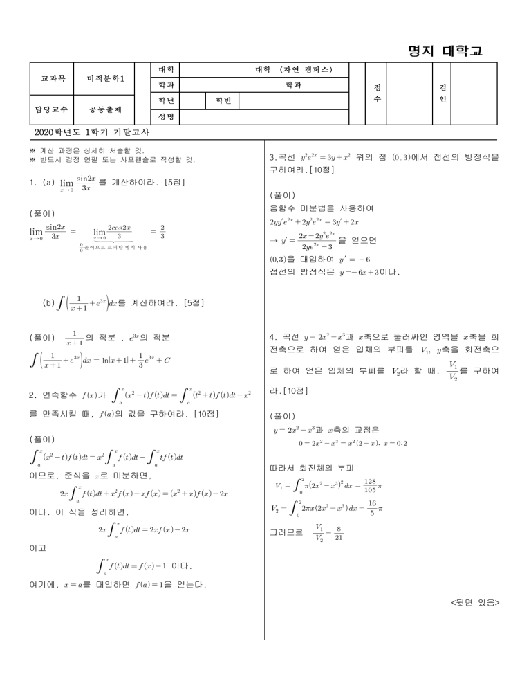 교과목 미적분학1 담당교수 공동출제 대학 학과 학년 성명 2020학년도 1학기 기말고사 대학 (자연 캠퍼스) 학과 학번 ※ 계산 과정은 상세히 서술할 것. ※ 반드시 검정 연필 또는 샤프펜슬로 작성할 것. 점 수 검 인 3.곡선 위의 점 에서 접선의 방정식을 구하여라.[10점] sin 1. (a) lim 를 계산하여라. [5점] → (풀이) 음함수 미분법을 사용하여 (풀이) sin lim → cos lim → ′ ′ → ′ 을 얻으면 꼴이므로 로피탈 법칙 사용 을 대입하여 ′ 접선의 방정식은 이다. (b) (풀이) 를 계산하여라. [5점] 의 적분 , 의 적분 4. 곡선 과 축으로 둘러싸인 영역을 축을 회 전축으로 하여 얻은 입체의 부피를 축을 회전축으 ln 로 하여 얻은 입체의 부피를 라 할 때, 를 구하여 2. 연속함수 가 라.[10점] 를 만족시킬 때, 의 값을 구하여라. [10점] (풀이) 과 축의 교점은 (풀이) 이므로, 준식을 로 미분하면, 따라서 회전체의 부피 이다. 이 식을 정리하면, 그러므로 이고 이다. 여기에, 를 대입하면 을 얻는다. <뒷면 있음> 를 구하여라.[10점] 5. (풀이) [방법 1] (부분적분법) , 로 놓으면 , 이므로, 부분적분법을 적용하면 이고, 문제 조건에 의해 , 이므로 tan [방법 2] (삼각치환법} tan 로 놓으면 sec ⇒ 이고 이고, , 일 때, 이다. tan sec 따라서 tan sin ⋅sec ⋅cos sin sec cos 7. 아래와 같은 등변사다리꼴의 넓이가 최대가 될 때 밑변의 길이를 구하여라.[15점] 즉 6 sin 6 cos sin 6 sincos 오른쪽 직각삼각형에서 cos sin 이고 tan 이므로 ∴ (풀이) [방법 1] 밑변의 길이는 이고 높이는 피타고라스 이다. 따라서 사다리꼴의 넓이를 정리에 의해 라 하면 6 sincos tan 6 6. 좌표평면 위에 아래 그림과 같이 직선 위를 움 직이는 점 와 직선 위를 움직이는 점 가 있다. 6 6 점 는 축의 양의 방향으로 초속 의 비율로 위로 이 동하고, 삼각형 의 넓이는 초속 의 비율로 증가 이다. 의 도함수를 구하면 할 때, , 일 때의 점 의 축의 방향으로 이동하는 변화율을 구하여라.[15점] ′ · (풀이) 시간 일 때의 점 의 좌표와 의 좌표를 각각 , 이라 하자. 그러면 삼각형 의 넓이 가 ′ 이 되는 값은 이차방정식 의 해이고 이어 야 하므로 이다. 의 왼쪽 부분에서 ′ 이 고 의 오른쪽 부분에서 ′ 이므로 사다리꼴의 넓이 는 에서 최대가 된다. 그러므로 밑변의 길이는 · 이다. [방법 2] 등변 사다리꼴을 아래와 같이 나타내면 6 6 6 sin 6 밑변의 길이는 이고 높이는 사인 함수의 정의를 이 용하면 sin 이다. 코사인 함수의 정의에 의해 cos 이므로 사다리꼴의 넓이를 라 하면 × cos × sin sincos 이다. 의 도함수를 구하면 ′ coscos sin sin cos cos sin cos cos cos cos cos cos cos ′ 이 되는 값은 cos 이고 이어 야 하므로 이다. 의 왼쪽 부분에서 ′ 이고 의 오른쪽 부분에서 ′ 이므로 사다리 꼴의 넓이 는 에서 최대가 된다. 그러므로 밑변의 길이는 · cos 이다. 수고 하셨습니다.