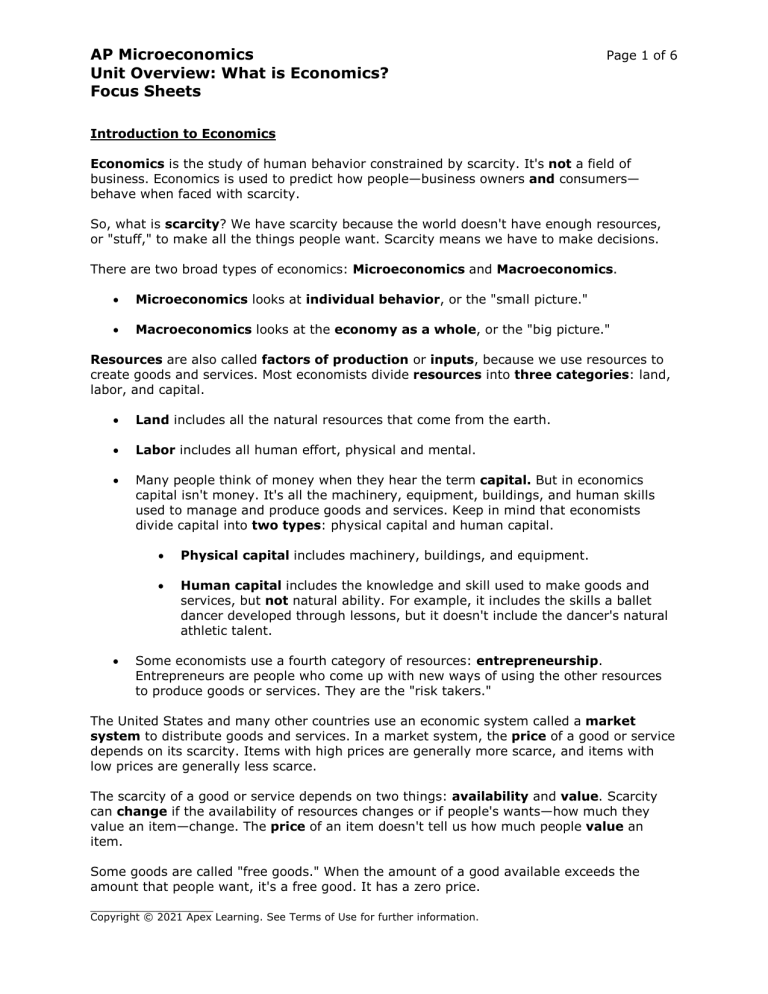 AP Microeconomics Unit Overview: What is Economics? Focus Sheets Page 1 of 6 Introduction to Economics Economics is the study of human behavior constrained by scarcity. It's not a field of business. Economics is used to predict how peoplebusiness owners and consumers behave when faced with scarcity. So, what is scarcity? We have scarcity because the world doesn't have enough resources, or "stuff," to make all the things people want. Scarcity means we have to make decisions. There are two broad types of economics: Microeconomics and Macroeconomics. • Microeconomics looks at individual behavior, or the "small picture." • Macroeconomics looks at the economy as a whole, or the "big picture." Resources are also called factors of production or inputs, because we use resources to create goods and services. Most economists divide resources into three categories: land, labor, and capital. • Land includes all the natural resources that come from the earth. • Labor includes all human effort, physical and mental. • Many people think of money when they hear the term capital. But in economics capital isn't money. It's all the machinery, equipment, buildings, and human skills used to manage and produce goods and services. Keep in mind that economists divide capital into two types: physical capital and human capital. • • Physical capital includes machinery, buildings, and equipment. • Human capital includes the knowledge and skill used to make goods and services, but not natural ability. For example, it includes the skills a ballet dancer developed through lessons, but it doesn't include the dancer's natural athletic talent. Some economists use a fourth category of resources: entrepreneurship. Entrepreneurs are people who come up with new ways of using the other resources to produce goods or services. They are the "risk takers." The United States and many other countries use an economic system called a market system to distribute goods and services. In a market system, the price of a good or service depends on its scarcity. Items with high prices are generally more scarce, and items with low prices are generally less scarce. The scarcity of a good or service depends on two things: availability and value. Scarcity can change if the availability of resources changes or if people's wantshow much they value an itemchange. The price of an item doesn't tell us how much people value an item. Some goods are called "free goods." When the amount of a good available exceeds the amount that people want, it's a free good. It has a zero price. ___________________ Copyright © 2021 Apex Learning. See Terms of Use for further information. AP Microeconomics Unit Overview: What is Economics? Focus Sheets Page 2 of 6 The economist's definition of a market is "a place where buyers and sellers exchange goods or services for a price they agree on." For economists, a market exists whenever and wherever an exchange takes place. Markets fall into two large categories: factor markets and product markets. Resources and semi-finished products are exchanged in the factor market. It's also called the resource market. Goods and services are exchanged in the product market. In the factor market, resource owners receive rent for their land, wages for their labor, and interest for their capital. These are the prices for each factor. In the product market, sellers receive the selling price for goods and services. Generally, sellers (or producers) take these factors of production and make something (it can be a good or service) then sell it to a buyer (or consumer) in a product market. Hopefully, the price the buyer pays is more than the cost to the seller in making the product. The difference between the price a seller receives and the cost a seller faces is profit. Profit is the total revenue of sales received minus the total cost of the resources used. The combined economic activity in factor and product markets is known as the circular flow of economic activity. Resource owners sell their resources to business owners in the factor market. In exchange they get rent, wages, or interest. The business owners then use the resources they bought to make goods or services. Finally, they sell these goods and services in the product market, to the resource owners. ___________________ Copyright © 2021 Apex Learning. See Terms of Use for further information. AP Microeconomics Unit Overview: What is Economics? Focus Sheets Page 3 of 6 Economic Tools: Graphs and Equations There are three main types of graphs: Pie Chart Line Graph Bar Chart Shows differences in relative size • Illustrates the statistical relationship between variables • Demand and Supply curves are line graphs • Shows trends over time (also called a time series graph) • Lets the reader quickly assess changes in a variable, such as inflation, over time. • Convenient when comparing different values of a single variable • Unemployment rates for each state are well represented on a bar chart. • Can also be used to compare the values of a single variable over time. You'll use line graphs most often in this course. The line graph called the supply curve helps economists study supply, whereas the line graph called the demand curve helps economists study demand. Price Independent Variable S (Supply) D (Demand) Quantity Dependent Variable A supply curve is a direct relationship between price and quantity. This means the variables both move in the same way. So, when price goes up, quantity supplied goes up. And when price goes down, quantity supplied goes down. A demand curve is an indirect relationship between price and quantity. This means the variables move in the opposite way. So, when price goes up, quantity supplied goes down. And when price goes down, quantity supplied goes up. Price is the independent variable, and quantity supplied is the dependent variable. It means that the dependent variable reacts to or is responsive to the independent variable. ___