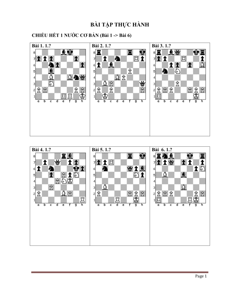 BÀI TẬP THỰC HÀNH CHIẾU HẾT 1 NƯỚC CƠ BẢN (Bài 1 -> Bài 6) Bài 1. 1.? Bài 2. 1.? Bài 3. 1.? Bài 4. 1.? Bài 5. 1.? Bài 6. 1.? Page 1 GIÀNH ƯU THẾ ( LỜI QUÂN) (Bài 7 -> Bài 15) Bài 7. 1.? Bài 8. 1.? Bài 9. 1.? XABCDEFGHY 8rsnl+k+-tr( 7zppzpp+pzpp' 6-+-+-sn-wq& 5+-vl-zp-+-% 4-+L+P+-+$ 3+-sN-+N+-# 2PzPPzP-zPPzP" 1tR-vLQmK-+R! xabcdefghy XABCDEFGHY 8r+-+q+-mk( 7+-+-+-zpp' 6-+-+N+-+& 5+-+-+-zp-% 4-+-+-+-+$ 3+-+-+QzP-# 2-+-+PzP-mK" 1+-+-+-+-! xabcdefghy XABCDEFGHY 8-+-+-tr-mk( 7+-+-+pzp-' 6-+-+-+-zp& 5+-+-+-+-% 4-+n+-+-+$ 3zP-+-+P+P# 2-zP-+-+PmK" 1+-+-+-wQ-! xabcdefghy Bài 10. 1.? Bài 11. 1.? Bài 12. 1.? XABCDEFGHY 8-+-+-+-+( 7+-wq-+k+-' 6-+-trpzp-zp& 5+-+-+-+-% 4-+-+-+-+$ 3+-+-+-+P# 2-+-+-+P+" 1+Q+-+-tRK! xabcdefghy XABCDEFGHY 8-+R+-+-+( 7+-+-+-+-' 6-+-+-+-+& 5+-+-+-+-% 4r+-+-+-+$ 3+-+-+-+-# 2-+K+-+-+" 1mk-+-+-+-! xabcdefghy XABCDEFGHY 8-+-+-+q+( 7+-+-+-+-' 6-+-+k+-+& 5zp-+-+-+-% 4-+-+-+-+$ 3zP-+-+-+-# 2-+-+-+-wQ" 1+-+-mK-+-! xabcdefghy Page 2 Bài 13. 1.? Bài 14. 1.? Bài 15. 1.? XABCDEFGHY 8-+-+-+-+( 7+-zp-+-+q' 6k+-+-+-+& 5+-+-+-+-% 4-+-+-+-zp$ 3zP-+R+-+-# 2-+L+-+PzP" 1+-+K+-+-! xabcdefghy XABCDEFGHY 8-+-+-+qmk( 7tr-zp-+l+-' 6-+-+-+-zp& 5+-+-+-+-% 4-+-+-+-+$ 3+-+-+-+P# 2P+-+-+PvL" 1+-+Q+-tRK! xabcdefghy XABCDEFGHY 8-+-+-+-+( 7zp-+-+-+-' 6-zp-+-+-+& 5+-zp-+k+-% 4-+P+-+-+$ 3+P+-+-+-# 2q+-+-+PtR" 1+-+-+-mK-! xabcdefghy CHIẾU HẾT 2 NƯỚC (Bài 16 –> Bài 66) Bài 16. 1.? Bài 17. 1.? Bài 18. 1…? Page 3 Bài 19. 1.? Bài 20. 1.? Bài 21. 1.? Bài 22. 1.? Bài 23. 1…? Bài 24. 1.? Page 4 Bài 25. 1.? Bài 26. 1.? Bài 27. 1.? XABCDEFGHY 8-+-+-trk+( 7wq-+-+p+p' 6-+-+-zPp+& 5+-+-+-+-% 4-wQ-+-+-+$ 3+-+-+-+P# 2-+-+-+P+" 1+-+R+-+K! xabcdefghy XABCDEFGHY 8-+-+-+r+( 7zppvl-+-+k' 6-+l+-zp-zp& 5+-zP-+-+-% 4-+-+R+-+$ 3+-+-+-zPq# 2P+L+-zP-zP" 1+-+-+-mK-! xabcdefghy XABCDEFGHY 8k+-tr-+-+( 7zppzpN+-+q' 6-+-+-+-+& 5+-+-+-+-% 4-+-+-+-+$ 3+P+-+-+-# 2-mKP+-wQ-+" 1+-+R+-+-! xabcdefghy Bài 28. 1...? Bài 29. 1.? Bài 30. 1.? XABCDEFGHY 8-+ktr-+-+( 7wqlvl-+Q+-' 6-+-+-+-+& 5+L+-+-+p% 4-+-+-zP-+$ 3+-zppvL-+-# 2-+P+-mKPzP" 1+-+-+-tR-! xabcdefghy XABCDEFGHY 8-+-+r+-mk( 7+-zp-trp+p' 6P+-zp-+-+& 5+-zp-+Q+-% 4-+-wqP+-+$ 3+-+P+-+-# 2-zPP+-+R+" 1+K+-tR-+-! xabcdefghy XABCDEFGHY 8r+-+-trk+( 7zppzp-+-zp-' 6-+-zp-+Q+& 5+l+-+p+L% 4-+-+-+-tR$ 3+-+-+-zP-# 2PzP-+-zPKzP" 1+-+-wq-+-! xabcdefghy Page 5 Bài 31. 1.? Bài 32. 1.? Bài 33. 1...? XABCDEFGHY 8r+-+-sN-mk( 7zpp+-+-zp-' 6-+p+-sn-zp& 5+-+-+-+-% 4-+Lwq-zP-+$ 3+-+-+-zP-# 2PzPQtr-zP-+" 1+-+-+-mK-! xabcdefghy XABCDEFGHY 8rsn-+kvl-tr( 7zpp+-+pzpp' 6-+-+p+qsn& 5+p+-+-vL-% 4-+L+-+-+$ 3+-+P+-wQP# 2PzPP+-zPP+" 1tR-+-mK-+R! xabcdefghy XABCDEFGHY 8-+-+-+-+( 7+-+-+-+p' 6-+-+R+pmk& 5+-+-+ptr-% 4-+-+PwQ-mK$ 3zP-+-+-+P# 2-zP-+-+q+" 1+-+-+-+-! xabcdefghy Bài 34. 1.? Bài 35. 1.? Bài 36. 1.? XABCDEFGHY 8-+-+-trk+( 7+-wQ-+pzpp' 6p+-+-+-+& 5+-zP-+-+-% 4-zp-+-+-+$ 3+L+-+-+P# 2Pwq-+nzPP+" 1+-+R+K+-! xabcdefghy XABCDEFGHY 8r+l+kwq-tr( 7+pzp-+-zpp' 6-zpn+-+-+& 5+-+-zp-vL-% 4-+L+-+-+$ 3+-+Q+-+-# 2P+-+-zPPzP" 1+-+R+-mK-! xabcdefghy XABCDEFGHY 8Q+-+-snk+( 7+pwq-+p+p' 6-+-zp-vLp+& 5+L+P+-+-% 4-+-+-+-+$ 3+-zP-+l+-# 2P+-+-zPrzP" 1+-+-tRK+-! xabcdefghy Page 6 Bài 37. 1.? Bài 38. 1.? Bài 39. 1.? XABCDEFGHY 8-+-+-+rmk( 7zp-+l+ptrp' 6-+-zp-sN-+& 5+-+-zpP+-% 4-+-+P+-wQ$ 3+-zP-+-tRP# 2-+q+-+PmK" 1+-+-+-+-! xabcdefghy XABCDEFGHY 8-+l+-+r+( 7+r+-+p+p' 6-+-wQp+-mk& 5zp-+-+-tR-% 4-+PvL-zP-+$ 3+-+-+-+-# 2PzPq+-+PzP" 1+-+R+-mK-! xabcdefghy XABCDEFGHY 8-+-tr-+-mk( 7zplzp-+-zpp' 6-+-wq-+n+& 5+-zp-+R+-% 4-+L+-+-wQ$ 3zP-+-zP-+-# 2-zPP+-+PzP" 1+-mK-+-+-! xabcdefghy Bài 40. 1.? Bài 41. 1.? Bài 42. 1.? XABCDEFGHY 8rtr-+k+-+( 7zppzpq+p+-' 6-vl-zpNvLnwQ& 5+l+-zp-sN-% 4-+-+P+-+$ 3+-zPP+-+P# 2PzP-+-zPP+" 1tR-+-+RmK-! xabcdefghy XABCDEFGHY 8rsn-wqkvl-+( 7zppzp-zp-+r' 6-+-+-+-+& 5+-+-sNpvLp% 4-+LzPp+-+$ 3+-+-+-+-# 2PzPP+-+PzP" 1tR-+Q+-mK-! xabcdefghy XABCDEFGHY 8-tRrmk-vl-tr( 7+-+-zp-+-' 6p+-zpP+-zp& 5+-+-+-zpQ% 4-+-+-+-+$ 3zP-+-+-zPP# 2-+-+KzP-+" 1+-+-+-+q! xabcdefghy Page 7 Bài 43. 1.? Bài 44. 1.? Bài 45. 1.? XABCDEFGHY 8-+-+-+-+( 7+-+-+-+-' 6-+-+-+-+& 5+-+-+-+-% 4-sNl+-+-+$ 3zp-+-+-+-# 2-+-+-+R+" 1mk-mK-+-+-! xabcdefghy XABCDEFGHY 8r+lwq-+rmk( 7zpp+-+pvlp' 6-+p+p+pwQ& 5+-+-+-+P% 4-+-zP-+-+$ 3+-zPL+N+-# 2PzP-+-zPPtR" 1+-mKR+-+-! xabcdefghy XABCDEFGHY 8r+-+kvlr+( 7+pzP-+p+p' 6-+-+lvLq+& 5+-zPp+-+-% 4-+-+-wQP+$ 3+-+-+-+P# 2-+-+R+-+" 1+-+-+-mK-! xabcdefghy Bài 46. 1.? Bài 47. 1.? Bài 48. 1…? Page 8 Bài 49. 1.? Bài 50. 1.? Bài 51. 1.? Bài 52. 1…? Bài 53. 1…? Bài 54. 1…? Page 9 Bài 55. 1.? Bài 56. 1.? Bài 57. 1.? Bài 58. 1.? Bài 59. 1.? Bài 60. 1.? Page 10 Bài 61. 1.? Bài 62. 1.? Bài 63. 1.? Bài 64. 1.? Bài 65. 1.? Bài 66. 1.? Page 11 BÀI TẬP HÒA CỜ (Bài 67 -> Bài 75) Bài 67. 1.? Bài 68. 1.? Bài 69. 1…? XABCDEFGHY 8-+-+-+K+( 7+-+-+-+-' 6-+-+-+kwq& 5+-+-+-+-% 4-+-+-+-+$ 3+-+-+-+-# 2-+-+-+-+" 1+-+-+R+-! xabcdefghy XABCDEFGHY 8-+-+-+-+( 7+-+-+-+-' 6-mkp+-+-+& 5zp-wq-+-+-% 4P+-+-+-+$ 3+-+-+-+-# 2-+-+-vLK+" 1+-+-+-+-! xabcdefghy XABCDEFGHY 8-+-+-+-+( 7+-+-+-+-' 6-zP-+-+-+& 5+-+-+-+-% 4-+-+-+p+$ 3+-+-trkzP-# 2-+-+-+-zP" 1+R+-+-mK-! xabcdefghy Bài 70. 1.? Bài 71. 1.? Bài 72. 1.? XABCDEFGHY 8-+-+-mk-+( 7+-+R+-+-' 6-+-+-sN-+& 5trr+-+-+-% 4q+-+-+-+$ 3+-+-+-+-# 2P+-+-+-+" 1mK-+-+-+-! xabcdefghy XABCDEFGHY 8-+-+-+-+( 7+-+-+-+-' 6-+-+-+-+& 5+-+-+-+-% 4-+-+-+-+$ 3mk-+-+-+-# 2-+q+-+-+" 1mKR+-+-+-! xabcdefghy XABCDEFGHY 8-+-+-+-+( 7+-+-+-+-' 6-+k+-+-+& 5mK-+-+-+-% 4-+-+-+-tR$ 3+-+-+-+-# 2-+-+-+-+" 1+-wq-+-+-! xabcdefghy Page 12 Bài 73. 1…? Bài 74. 1…? Bài 75. 1.? XABCDEFGHY 8-+-+qmk-+( 7+-+-+-+-' 6Q+-+-zP-+& 5+p+-zp-+-% 4-zP-+P+-vL$ 3zP-+-+-+K# 2-+-+-zP-+" 1+-+-+-+-! xabcdefghy XABCDEFGHY 8-+-+-+-+( 7+-+-+-+-' 6-+-+-+-+& 5+-+-+-+-% 4-+-+-+-+$ 3mK-+-+-+-# 2-+-wQ-+-+" 1mkq+-+-+-! xabcdefghy XABCDEFGHY 8-+-+-+-+( 7+-+-+-wqk' 6-+-+-wQr+& 5+-+-+-+K% 4-+-+-+pzP$ 3+-+-+-zP-# 2-+-+-+-+" 1+-+-+-+-! xabcdefghy BÀI TẬP ĐÒN PHỐI HỢP (GIÀNH ƯU THẾ) (Bài 76 -> Bài 95) Bài 76. 1…? Bài 77. 1.? Bài 78. 1.? XABCDEFGHY 8-+-+-+k+( 7+