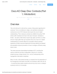 2/5/25, 1:38 PM Cisco ACI Deep Dive: Contracts (Part 1, Introduction) · Joshua Morgan's Blog ←Home Archive Tags About Subscribe Cisco ACI Deep Dive: Contracts (Part 1, Introduction) Feb 14, 2017 20:07 · 2164 words · 11 minutes read ACI Overview This is the first part in what will be a series of blog posts regarding ACI contracts. From an architecture, design, and operations standpoint, contracts are one of ACI’s features that require the most in-depth understanding. This is because contracts are distilled into policy CAM entries within hardware and due to the laws of physics, hardware is limited – the policy CAM entries require logic gates and there is a finite amount of logic gates that can be placed onto a die. Such an in-depth understanding is currently difficult to accomplish without practical experience (mostly real-world deployment but also labbing) as detailed documentation (beyond procedure on how to configure contracts) really doesn’t exist. This series assumes intermediate knowledge of ACI, including the various constructs and their configuration using the UI: contracts, endpoint groups, bridge domains, etc.; and an understanding of the management information model/tree. Most, if not all, of this series focuses on contracts from the perspective of the management information tree (MIT) and hardware rather than the UI – it’s assumed that readers already well and truly know how to configure contracts via the UI, for example. https://blog.joshuamorgan.com.au/post/cisco-aci-deep-dive-contracts-part-1-introduction/ 1/13 2/5/25, 1:38 PM Cisco ACI Deep Dive: Contracts (Part 1, Introduction) · Joshua Morgan's Blog Some of this series should be taken with a grain of salt, some content is the work of reverse engineering for client projects and may not be 100% accurate. Series Parts Introduction Zoning Rules Contract Scopes (future post) Labels (future post) Quality of Service (future post) External Network Instance Profiles (future post) Service Graphs (future post) Optimisations (TCP EST) (future post) vzAny (future post) Global/Tenant Contracts and Route Leaking (future post) NorthStar/Donner[C] Programming (future post) Sugarbowl Programming (future post) Troubleshooting (future post) What are contracts? Contracts define the connectivity permitted (or denied, in the case of taboo contracts) between endpoint groups (EPGs). Specifically, contracts are currently implemented as stateless packet filters within the ASIC of the leaf switches of the ACI fabric. EPGs can provide, consume or both provide and consume contracts. A contract provider is typically the provider of a service, such as a web service. A contract consumer is typically the consumer of a service provided by someone else. Thus, the provider is the server and the consumer is the client. A contract is a managed object (MO) of class vz:BrCP. These managed objects are children of a tenant. This MO itself has few configurable properties: name Name of the contract. prio QoS priority of the contract; discussed in a future post. targetDscp Target codepoint of the contract; discussed in a future post. scope Scope of the contract; discussed in a future post. https://blog.joshuamorgan.com.au/post/cisco-aci-deep-dive-contracts-part-1-introduction/ 2/13 2/5/25, 1:38 PM Cisco ACI Deep Dive: Contracts (Part 1, Introduction) · Joshua Morgan's Blog descr Description of the contract. The figure below depicts the managed object classes we will be discussing in this part, their relationships and the properties we are considering. If the figure looks familiar, we have used the same tool used by Cisco to generate the class diagrams within the Management Information Model Reference – PlantUML. https://blog.joshuamorgan.com.au/post/cisco-aci-deep-dive-contracts-part-1-introduction/ 3/13 2/5/25, 1:38 PM Cisco ACI Deep Dive: Contracts (Part 1, Introduction) · Joshua Morgan's Blog https://blog.joshuamorgan.com.au/post/cisco-aci-deep-dive-contracts-part-1-introduction/ 4/13 2/5/25, 1:38 PM Cisco ACI Deep Dive: Contracts (Part 1, Introduction) · Joshua Morgan's Blog Class Naming Convention Managed object classes are named package:class. The list of packages defined is available in the Management Information Model Reference: https://developer.cisco.com/media/mim-ref/mim_help.html in the Package Descriptions table. This table does not appear to have been updated since perhaps v1.2 – some packages, such as ‘bfd’, are absent from the table. Looking at the table we see that the ‘vz’ package name in the class discussed so far denotes ‘virtual zones’ – reportedly the initial name for the contract functionality. Contracts may be configured in the common tenant, where they can be consumed/provided by EPGs from that and any other tenant. In the case that an EPG within a tenant other than common consumes/provides a contract configured in the common tenant, then scoping (discussed in another part) comes into effect. Contained within a contract MO are multiple non-configurable (some defined later in this series, as they’re useful for troubleshooting) MOs and zero or more subject MOs of class vz:Subj. Okay, so what are subjects? https://blog.joshuamorgan.com.au/post/cisco-aci-deep-dive-contracts-part-1-introduction/ 5/13 2/5/25, 1:38 PM Cisco ACI Deep Dive: Contracts (Part 1, Introduction) · Joshua Morgan's Blog Subject MOs define the connectivity to be permitted or denied by relating to filters, and can include consumer and provider subject labels. Labels are discussed in a future part. Within the subject MO, the connectivity that is to be permitted or denied is specified via zero or more MOs of class vz:RsSubjFiltAtt. Managed objects of this class define a named relationship to a filter MO of class vz:Filter. Relationship Managed Objects The cool thing about relationship managed objects is that they have a source and target pairing. Perhaps somewhat obviously, the source defines where the relationship is from and the target sp