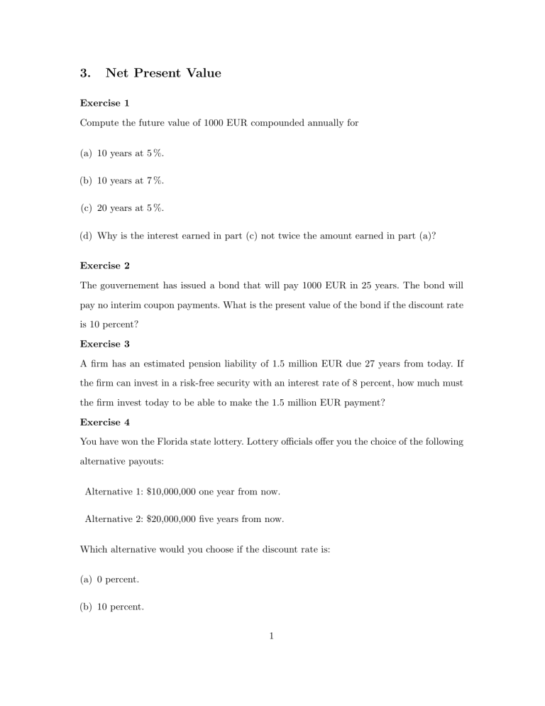 3. Net Present Value Exercise 1 Compute the future value of 1000 EUR compounded annually for (a) 10 years at 5 %. (b) 10 years at 7 %. (c) 20 years at 5 %. (d) Why is the interest earned in part (c) not twice the amount earned in part (a)? Exercise 2 The gouvernement has issued a bond that will pay 1000 EUR in 25 years. The bond will pay no interim coupon payments. What is the present value of the bond if the discount rate is 10 percent? Exercise 3 A firm has an estimated pension liability of 1.5 million EUR due 27 years from today. If the firm can invest in a risk-free security with an interest rate of 8 percent, how much must the firm invest today to be able to make the 1.5 million EUR payment? Exercise 4 You have won the Florida state lottery. Lottery officials offer you the choice of the following alternative payouts: Alternative 1: $10,000,000 one year from now. Alternative 2: $20,000,000 five years from now. Which alternative would you choose if the discount rate is: (a) 0 percent. (b) 10 percent. 1 (c) 20 percent. Which discount rate makes the two alternatives equally attractive to you? Exercise 5 Ann Woodhouse wants to invest in raw land. She expects to own the property for 10 years and to sell it at the end of the 10th year for $5 million. There are no other cash flows. What is the most she would be willing to pay for the property if the appropriate discount rate is 12 percent? Exercise 6 Your aunt owns an auto dealership. She promised to pay you $3,000 for your car when you graduate one year from now. However, your roommate offered you $3,500 for the car right now. The prevailing interest rate is 12 percent. If the future value of the benefit from owning the car for one additional year is $1,000, should you accept your aunt’s offer? You are not planning to buy another car and will not need the car after you graduate. Exercise 7 You wish to purchase a new convertible 12 years from today. At that time, the car will cost $80,000. You currently have $10,000 to invest. What rate of interest must your investment earn so that you can pay for the car? Exercise 8 Suppose you deposit $1,000 in an account at the end of each of the next four years. If the account earns 12 percent annually, how much will be in the account at the end of seven years? Exercise 9 What is the future value three years from now of $1,000 invested in an account with a stated annual interest rate of 8 percent? (a) compounded annually? (b) compounded semi-annually? (c) compounded monthly? 2 (d) compounded continuously? (e) Why does the future value increase as the compounding period shortens? Exercise 10 Bank of America offers a stated annual interest rate of of 4.1 percent, compounded quarterly while Bank USA offers a stated annual interest rate of 4.05 percent, compounded monthly. In which bank should you deposit your money? Exercise 11 Given an interest rate of 10 percent per year, what is the value at the end of year 5 of of a perpetual stream of $120 annual payments starting at the end of year 9? Exercise 12 Harris, Inc. paid a $3 dividend yesterday. If the firm raises its dividend 5 percent every year and the appropriate discount rate is 12 percent, what is the price of the Harris stock? Exercise 13 World Transportation, Inc., is expected to initiate its quarterly dividend of $1 five years from today and the dividend is expected to remain constant, forever. What is the price of World Transportation stock if the stated annual interest rate is 15 percent, compounded quarterly? Exercise 14 Should you buy an asset that will generate income of $1,200 at the end of each year for eight years? The price of the asset is $6,200, and the annual interest rate is 10 percent. Exercise 15 What is the value today of a 15-year annuity that pays $500 a year? The annuity’s first payment occurs at the end of year 6. The annual interest rate is 12 percent per year for years 1 through 5, and 15 percent thereafter. 3 Exercise 16 You are saving for the college education (4 years of college) of your two children. They are two years apart in age; one will begin college 15 years from now and the other will begin 17 years from today. You estimate your children’s college expense to be $21,000 per year per child payable at the end of each school year. The annual interest rate is 15 percent. How much money must you deposit in an account each year to fund your children’s education? Your deposits begin one year from today. You will make your last deposit when your oldest child enters college. Exercise 17 Your job pays only once a year for all the work you did over the previous 12 months. Today, December 31, you just received your salary of $50,000 and you plan to spend all of it. However you want to start saving for retirement beginning next year. You have decided that one year from today you will begin depositing 2 percent of your salary in an account that will earn 8 percent per year. Your salary will increase at 4 percent per year throughout your career. How much money will you have on the day of your retirement 40 years from today? Exercise 19 Tom Adams has received a job offer from a large investment bank as a clerk to an associate banker. His base salary will be $35,000. He will receive his first annual salary payment one year from the day he begins to work. In addition, he will get an immediate $10,000 bonus for joining the company. His salary will grow at 4 percent each year. Each year he will receive a bonus equal to 10 percent of his salary. Mr. Adams is expected to work for 25 years. What is the present value of the offer if the discount rate is 12 percent? Exercise 20 Southern California Publishing Company is trying to decide whether or not to revise its popular textbook, Financial Psychoanalysis Made Simple. They have estimated that the revision will cost $40,000. Cash flows from increased sales will be $10,000 the first year. These cash flows will increase by 7 percent per year. The book will go out of print five years 4 
