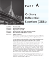 PART A Ordinary Differential Equations (ODEs) CHAPTER 1 CHAPTER 2 CHAPTER 3 CHAPTER 4 CHAPTER 5 CHAPTER 6 First-Order ODEs Second-Order Linear ODEs Higher Order Linear ODEs Systems of ODEs. Phase Plane. Qualitative Methods Series Solutions of ODEs. Special Functions Laplace Transforms Many physical laws and relations can be expressed mathematically in the form of differential equations. Thus it is natural that this book opens with the study of differential equations and their solutions. Indeed, many engineering problems appear as differential equations. The main objectives of Part A are twofold: the study of ordinary differential equations and their most important methods for solving them and the study of modeling. Ordinary differential equations (ODEs) are differential equations that depend on a single variable. The more difficult study of partial differential equations (PDEs), that is, differential equations that depend on several variables, is covered in Part C. Modeling is a crucial general process in engineering, physics, computer science, biology, medicine, environmental science, chemistry, economics, and other fields that translates a physical situation or some other observations into a “mathematical model.” Numerous examples from engineering (e.g., mixing problem), physics (e.g., Newton’s law of cooling), biology (e.g., Gompertz model), chemistry (e.g., radiocarbon dating), environmental science (e.g., population control), etc. shall be given, whereby this process is explained in detail, that is, how to set up the problems correctly in terms of differential equations. For those interested in solving ODEs numerically on the computer, look at Secs. 21.1–21.3 of Chapter 21 of Part F, that is, numeric methods for ODEs. These sections are kept independent by design of the other sections on numerics. This allows for the study of numerics for ODEs directly after Chap. 1 or 2. 1 CHAPTER 1 First-Order ODEs Chapter 1 begins the study of ordinary differential equations (ODEs) by deriving them from physical or other problems (modeling), solving them by standard mathematical methods, and interpreting solutions and their graphs in terms of a given problem. The simplest ODEs to be discussed are ODEs of the first order because they involve only the first derivative of the unknown function and no higher derivatives. These unknown functions will usually be denoted by y1x2 or y1t2 when the independent variable denotes time t. The chapter ends with a study of the existence and uniqueness of solutions of ODEs in Sec. 1.7. Understanding the basics of ODEs requires solving problems by hand (paper and pencil, or typing on your computer, but first without the aid of a CAS). In doing so, you will gain an important conceptual understanding and feel for the basic terms, such as ODEs, direction field, and initial value problem. If you wish, you can use your Computer Algebra System (CAS) for checking solutions. COMMENT. Numerics for first-order ODEs can be studied immediately after this chapter. See Secs. 21.1–21.2, which are independent of other sections on numerics. Prerequisite: Integral calculus. Sections that may be omitted in a shorter course: 1.6, 1.7. References and Answers to Problems: App. 1 Part A, and App. 2. 1.1 Basic Concepts. Modeling Physical System Mathematical Model Mathematical Solution Physical Interpretation Fig. 1. Modeling, solving, interpreting 2 If we want to solve an engineering problem (usually of a physical nature), we first have to formulate the problem as a mathematical expression in terms of variables, functions, and equations. Such an expression is known as a mathematical model of the given problem. The process of setting up a model, solving it mathematically, and interpreting the result in physical or other terms is called mathematical modeling or, briefly, modeling. Modeling needs experience, which we shall gain by discussing various examples and problems. (Your computer may often help you in solving but rarely in setting up models.) Now many physical concepts, such as velocity and acceleration, are derivatives. Hence a model is very often an equation containing derivatives of an unknown function. Such a model is called a differential equation. Of course, we then want to find a solution (a function that satisfies the equation), explore its properties, graph it, find values of it, and interpret it in physical terms so that we can understand the behavior of the physical system in our given problem. However, before we can turn to methods of solution, we must first define some basic concepts needed throughout this chapter. 3 SEC. 1.1 Basic Concepts. Modeling y h Velocity v Water level h Falling stone Parachutist y″ = g = const. (Sec. 1.1) mv′ = mg – bv (Sec. 1.2) Outflowing water h′ = –k h (Sec. 1.3) 2 y R (k) C E t L y m Displacement y Vibrating mass on a spring my″ + ky = 0 (Secs. 2.4, 2.8) Beats of a vibrating system 2 y″ + ω w0 y = cos ω wt, ω w0 ≈ ω w (Sec. 2.8) Current I in an RLC circuit LI″ + RI′ + 1 I = E′ C (Sec. 2.9) L θ y Lotka–Volterra predator–prey model Pendulum y′1 = ay1 – by1 y2 EIy = f(x) Lθ″ + g sin θθ = 0 y′2 = ky1 y2 – ly2 (Sec. 3.3) (Sec. 4.5) (Sec. 4.5) Deformation of a beam iv Fig. 2. Some applications of differential equations An ordinary differential equation (ODE) is an equation that contains one or several derivatives of an unknown function, which we usually call y(x) (or sometimes y(t) if the independent variable is time t). The equation may also contain y itself, known functions of x (or t), and constants. For example, (1) y r 5 cos x (2) y s 1 9y 5 e22x (3) y r y t 2 32 y r 2 5 0 4 CHAP. 1 First-Order ODEs are ordinary differential equations (ODEs). Here, as in calculus, y r denotes dy>dx, y s 5 d 2y>dx 2, etc. The term ordinary distinguishes them from partial differential equations (PDEs), which involve partial derivatives of an unknown function of two or more variables. For instance, a PDE with