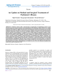 Volume 12, Number 4; 1021-1035, July 2021 http://dx.doi.org/10.14336/AD.2020.1225 Review An Update on Medical and Surgical Treatments of Parkinson’s Disease Dipali Nemade1, Thyagarajan Subramanian2, Vikram Shivkumar1* 1 Department of Neurology, Marshall University School of Medicine, Huntington, WV 25701, USA Department of Neurology and Neural and Behavioral Sciences, Penn State University College of Medicine, Hershey, PA 17033, USA 2 [Received November 30, 2020; Revised December 25, 2020; Accepted December 25, 2020] ABSTRACT: Parkinson’s disease (PD) is characterized by degeneration of dopaminergic neurons in the substantia nigra pars compacta and other neuronal populations. The worldwide prevalence of PD is over 7 million and has been increasing more rapidly than many other neurodegenerative disorders. PD symptoms can be broadly divided into motor (slowness, stiffness, tremor) and non-motor symptoms (such as depression, dementia, psychosis, orthostatic hypotension). Patients can also have prodromal symptoms of rapid eye movement sleep behavior disorder, hyposmia, and constipation. The diagnosis of PD is mainly clinical, but dopamine transporter singlephoton emission computed tomography can improve the accuracy of the diagnosis. Dopamine based therapies are used for the treatment of motor symptoms. Non-motor symptoms are treated with other medications such as selective serotonin reuptake inhibitors (depression/anxiety), acetylcholinesterase inhibitors (dementia), and atypical antipsychotics (psychosis). Patients with motor fluctuations or uncontrolled tremor, benefit from deep brain stimulation. Levodopa-carbidopa intestinal gel is an alternative to deep brain stimulation for uncontrolled motor fluctuations. Rehabilitative therapies such as physical, occupational, and speech therapy are important during all stages of the disease. Management of PD is complex but there have been significant advancements in the treatment of motor and non-motor symptoms over the past few years. This review discusses the updates in the medical and surgical management of PD. Key words: Parkinson, therapies, diagnosis, motor fluctuations Introduction Parkinson’s disease (PD) was first described by Dr. James Parkinson in 1817 in his paper titled ‘Essay on the shaking palsy’ [1]. The prevalence of PD has been increasing more rapidly than many other neurodegenerative disorders [2]. The worldwide prevalence is projected to double from 7 million in 2015 to 14 million in 2040 highlighting the enormous burden it poses [3]. The prevalence increases with age and is more common in males than females (1.4:1). About 5-10% of patients with PD have a monogenic form with Mendelian inheritance [4]. The majority of PD cases are sporadic with unknown etiology, possibly caused by an association of genetic and environmental risk factors [4-6]. Among the genetic risk factors for sporadic PD, the most robust and replicable associations have been found for LRRK2, GBA and MAPT [6]. Management of PD is complicated but there have been significant advancements in its treatment. This review discusses the updates in medical and surgical management in PD. Methods A literature search for systematic reviews, national guidelines, and additional articles regarding diagnosis and *Correspondence should be addressed to: Dr. Vikram Shivkumar, Department of Neurology, Marshall University School of Medicine, Huntington, WV 25701, USA. Email: shivkumar@marshall.edu. Copyright: © 2020 Nemade D et al. This is an open-access article distributed under the terms of the Creative Commons Attribution License, which permits unrestricted use, distribution, and reproduction in any medium, provided the original author and source are credited. ISSN: 2152-5250 1021 Nemade D., et al Update on treatment of Parkinson disease treatment of PD was performed using PubMed and Cochrane database up to November 2020. We used the search terms “Parkinson’s disease”, “diagnosis”, “treatment”. The searches were focused more on the medical and surgical therapies for PD. Reviews performed within the last 5 years were assigned a higher priority for inclusion. Pathophysiology Parkinson’s disease is characterized by degeneration of dopaminergic neurons in the substantia nigra pars compacta and other neuronal populations [7]. In addition to dopaminergic dysfunction, other neurotransmitters such as acetylcholine, serotonin, and norepinephrine are affected as well [8, 9]. The pathological hallmark of PD is the presence of Lewy Bodies within the degenerating neurons, composed primarily of misfolded alphasynuclein (α-syn) protein aggregates [10]. A range of nonmotor symptoms precede the motor phase of PD including severe constipation [11, 12], delayed gastric emptying, rapid eye movement sleep behavior disorder (RBD) [13] and olfactory dysfunction. Studies show that pathological α-syn is present in the enteric mucosa in early untreated PD [14, 15]. These findings support the Braak hypothesis based upon autopsy studies, that predicted GI symptoms in the pre-motor phase, and that PD spreads in a rostrocaudal manner from the enteric nervous system (ENS) to the central nervous system (CNS) via vagal pathways [16, 17]. Since its publication, Braak’s hypothesis has received critiques (summarized in [18]), and some more recent data to argue that the disease originates in the brain [19] along with a large body of supportive evidence [20-26]. A recent review of autopsy studies from a large series has confirmed the predictions of the Braak hypothesis [27] and also the notion that there could be 2 different subtypes of PD, one that is body-first subtype and another that is brain-first subtype [28]. The consensus in the present literature appears to support the notion that a good majority of ~66% of PD patients present as the body-first subtype with RBD and constipation. Further, a recent study found that constipation and RBD are strongly associated with future decline 