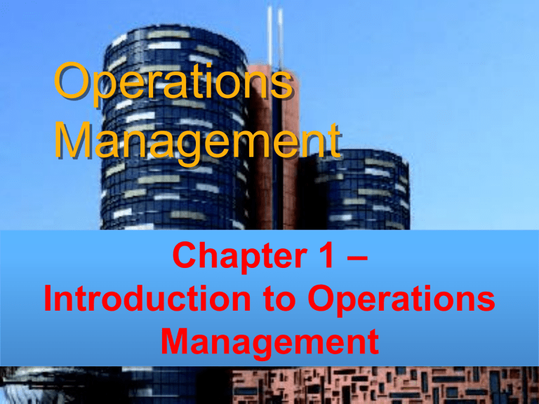 Operations Management Chapter 1 – Introduction to Operations Management © 2006 Prentice Hall, Inc. 1–1 Outline Nature of operations management, scope and structure of Operations, Historical Evolution of operations management, Manufacturing Vs. Service Operations, Operations and process management, operations and process decisions © 2006 Prentice Hall, Inc. 1–2 What Is Operations Management? Production is the creation of goods and services Operations management (OM) is the set of activities that creates value in the form of goods and services by transforming inputs into outputs © 2006 Prentice Hall, Inc. 1–3 Why Study OM? OM is one of three major functions (marketing, finance, and operations) of any organization We want (and need) to know how goods and services are produced We want to understand what operations managers do OM is such a costly part of an organization © 2006 Prentice Hall, Inc. 1–4 Options for Increasing Contribution Marketing Option Current Sales Cost of Goods Gross Margin Finance Costs Subtotal Taxes at 25% Contribution © 2006 Prentice Hall, Inc. $100,000 – 80,000 20,000 – 6,000 14,000 – 3,500 $ 10,500 Finance/ Accounting Option Increase Reduce Sales Finance Revenue 50% Costs 50% $150,000 – 120,000 30,000 – 6,000 24,000 – 6,000 $ 18,000 $100,000 – 80,000 20,000 – 3,000 17,000 – 4,250 $ 12,750 OM Option Reduce Production Costs 20% $100,000 – 64,000 36,000 – 6,000 30,000 – 7,500 $ 22,500 1–5 Scope of operations Management What Operations Managers Do? Basic Management Functions Planning Organizing Staffing Leading Controlling © 2006 Prentice Hall, Inc. 1–6 scope … Ten Decision Areas Service and product design Quality management Process and capacity design Location Layout design Human resources, job design Supply-chain management Inventory management Scheduling Maintenance Table 1.2 © 2006 Prentice Hall, Inc. 1–7 The Critical Decisions Service and product design What good or service should we offer? How should we design these products and services? Quality management How do we define quality? Who is responsible for quality? Process and capacity design What process and what capacity will these products require? What equipment and technology is necessary for these processes? Location Where should we put the facility? On what criteria should we base the location decision? © 2006 Prentice Hall, Inc. 1–8 The Critical Decisions Layout design How should we arrange the facility and material flow? How large must the facility be to meet our plan? Human resources and job design How do we provide a reasonable work environment? How much can we expect our employees to produce? Supply-chain management Should we make or buy this component? Who are our suppliers and who can integrate into our ecommerce program? Inventory, material requirements planning, and JIT How much inventory of each item should we have? When do we re-order? © 2006 Prentice Hall, Inc. 1–9 The Critical Decisions scheduling Are we better off keeping people on the payroll during slowdowns? Which jobs do we perform next? Maintenance Who is responsible for maintenance? When do we do maintenance? © 2006 Prentice Hall, Inc. 1 – 10 Where are the OM Jobs? © 2006 Prentice Hall, Inc. 1 – 11 Assignment I analyze historical evolution of OM from the ten decision areas view point. © 2006 Prentice Hall, Inc. 1 – 12 Manufacturing vs. service operations © 2006 Prentice Hall, Inc. 1 – 13 Characteristics of Goods Tangible product Consistent product definition Production usually separate from consumption Can be inventoried Low customer interaction Low labor content © 2006 Prentice Hall, Inc. 1 – 14 Characteristics of Service Intangible product Produced and consumed at same time Often unique High customer interaction Inconsistent product definition Often knowledge-based High labor content © 2006 Prentice Hall, Inc. 1 – 15 Operations and process management, • All operations processes. are composed of • A process is an arrangement of resources and activities that transform inputs into outputs that satisfy (internal or external) customer needs. • The process technology is the methods, procedures, and equipment used to transform materials or inputs into products or services. © 2006 Prentice Hall, Inc. 1 – 16 • The difference between operations and processes is one of scale, and there fore complexity. • Both transform inputs into outputs but processes are the smaller version. They are the component parts – the building blocks – of an operation. • So, ‘operations and process management’, is the term we use to encompass the management of all types of operation, • The general truth is that processes are everywhere, and all managers have something to learn from studying operations and process management. © 2006 Prentice Hall, Inc. 1 – 17 operations and process decisions 1. Directing the overall strategy of the operation. A general understanding of operations and processes and their strategic purpose, together with an appreciation of how strategic purpose is translated into reality through how innovation is incorporated into products and services and how much of the total value-adding process should be kept in-house and how much outsourced. 2. Designing the operation’s processes. Design is the activity of determining the physical form, shape and composition of operations and processes, together with the type of resources they contain. © 2006 Prentice Hall, Inc. 1 – 18 Cont… 3. Planning and control process delivery. After being designed, the delivery of products and services from suppliers and through the total operation to customers must be planned and controlled. 4. Developing process performance. Increasingly, it is recognized that operations, or any process managers cannot simply routinely deliver products and services in the same way © 2006 Prentice Hall, Inc. 1 – 19 End of chapter one © 2006 Prentice Hall, Inc. 1 – 20