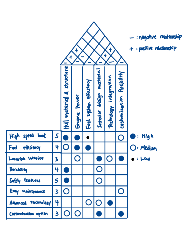 - t : +: + t : negative relationship positive relationship + - -& - - - · · High speed boat 5 Fuel 4 efficiency . Luxurious interior 3 Durability 4 Safety features 5 : High · : : Low g Easy maintenance Advanced technology 4 Customization option 3 g g Medium g