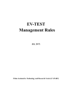 EV-TEST Management Rules (Ed. 2017) China Automotive Technology and Research Center (CATARC) Contents Foreword ...................................................................................................................................................................... 3 Chapter 1 General ..................................................................................................................................................... 4 1. Objectives ......................................................................................................................................................... 4 2. Management body............................................................................................................................................. 4 3. Notes on vehicle group classification ............................................................................................................... 5 4. EV-TEST test items........................................................................................................................................... 5 5. Assessment result .............................................................................................................................................. 9 6. Designated website ........................................................................................................................................... 9 7. Proprietary marking of EV-TEST ..................................................................................................................... 9 8. Declaration ...................................................................................................................................................... 10 Chapter 2 Operation Management ...........................................................................................................................11 1. Selection of vehicle type for assessment ..........................................................................................................11 2. Vehicle purchase ..............................................................................................................................................11 3. Test ...................................................................................................................................................................11 4. Issuance of assessment results .........................................................................................................................11 5. Fund ................................................................................................................................................................ 12 6. Management of external persons and related affairs in the test process ......................................................... 12 7. Treatment of objection and complaint against the assessment result .............................................................. 13 8. Treatment of test data ...................................................................................................................................... 13 9. Use of EV-TEST assessment results and related marking .............................................................................. 13 10. Technical exchanges ....................................................................................................................................... 13 11. Exchange and public propaganda events ........................................................................................................ 13 Chapter 3 Assessment Procedures .......................................................................................................................... 14 1. Micro EV group scoring method..................................................................................................................... 14 2. Conventional EV group scoring method ......................................................................................................... 20 3 Resultant score and star level rating................................................................................................................ 27 Chapter 4 Test Methods .......................................................................................................................................... 28 1 Scope............................................................................................................................................................... 28 2 Normative References ..................................................................................................................................... 28 3 Terms and Definitions ..................................................................................................................................... 28 4 Test Procedures for Range and Reference Energy Consumption .................................................................... 29 5 Test Method for Vehicle vs. Charge Spot Compatibility (Conductive charge) ............................................... 35 6 Test Method for Charging Rate and Charging Time ....................................................................................... 37 1 7 Test method for immunity in charge ............................................................................................................... 38 8 Test Method for Electrical Safety in Fording .................................................................................................. 39 9 Test Method for Electromagnetic protection of persons ................................................................................. 39 10 Test Method for Electromagnetic Immunity (EMI) ........................................................................................ 39 11 Test Methods of Power Performance ......................................................................................