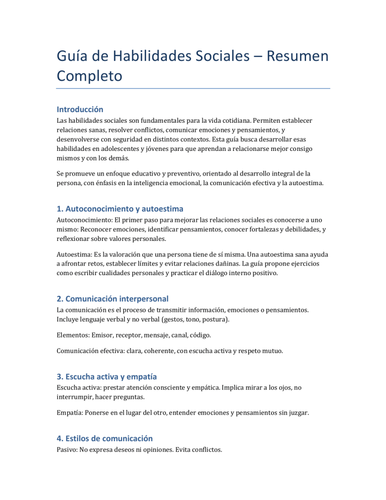Guía de Habilidades Sociales – Resumen Completo Introducción Las habilidades sociales son fundamentales para la vida cotidiana. Permiten establecer relaciones sanas, resolver conflictos, comunicar emociones y pensamientos, y desenvolverse con seguridad en distintos contextos. Esta guía busca desarrollar esas habilidades en adolescentes y jóvenes para que aprendan a relacionarse mejor consigo mismos y con los demás. Se promueve un enfoque educativo y preventivo, orientado al desarrollo integral de la persona, con énfasis en la inteligencia emocional, la comunicación efectiva y la autoestima. 1. Autoconocimiento y autoestima Autoconocimiento: El primer paso para mejorar las relaciones sociales es conocerse a uno mismo: Reconocer emociones, identificar pensamientos, conocer fortalezas y debilidades, y reflexionar sobre valores personales. Autoestima: Es la valoración que una persona tiene de sí misma. Una autoestima sana ayuda a afrontar retos, establecer límites y evitar relaciones dañinas. La guía propone ejercicios como escribir cualidades personales y practicar el diálogo interno positivo. 2. Comunicación interpersonal La comunicación es el proceso de transmitir información, emociones o pensamientos. Incluye lenguaje verbal y no verbal (gestos, tono, postura). Elementos: Emisor, receptor, mensaje, canal, código. Comunicación efectiva: clara, coherente, con escucha activa y respeto mutuo. 3. Escucha activa y empatía Escucha activa: prestar atención consciente y empática. Implica mirar a los ojos, no interrumpir, hacer preguntas. Empatía: Ponerse en el lugar del otro, entender emociones y pensamientos sin juzgar. 4. Estilos de comunicación Pasivo: No expresa deseos ni opiniones. Evita conflictos. Agresivo: Impone ideas y desvaloriza al otro. Asertivo: Expresa pensamientos con claridad y respeto. Defiende derechos sin agredir ni someterse. 5. Habilidades sociales específicas Básicas: iniciar conversación, saludar, preguntar, presentarse. Avanzadas: pedir ayuda, negociar, resolver conflictos, dar y recibir cumplidos. Son útiles para hacer amigos, integrarse en grupos, participar en actividades y defender derechos personales. 6. Manejo de emociones y conflictos Reconocer y expresar emociones: Saber qué se siente, por qué y cómo expresarlo. Estrategias: respiración profunda, escribir, hablar con alguien. Resolución de conflictos: Identificar el problema, escuchar, buscar acuerdos, proponer soluciones, llegar a compromisos y evaluar resultados. 7. Actividades y dinámicas Juegos de rol, dinámicas de grupo, autoevaluaciones y análisis de casos. Permiten practicar habilidades en contextos seguros. Conclusión Esta guía promueve el desarrollo emocional y social, ayudando a los jóvenes a mejorar sus relaciones, confiar en sí mismos, resolver conflictos sin violencia y vivir con bienestar emocional.