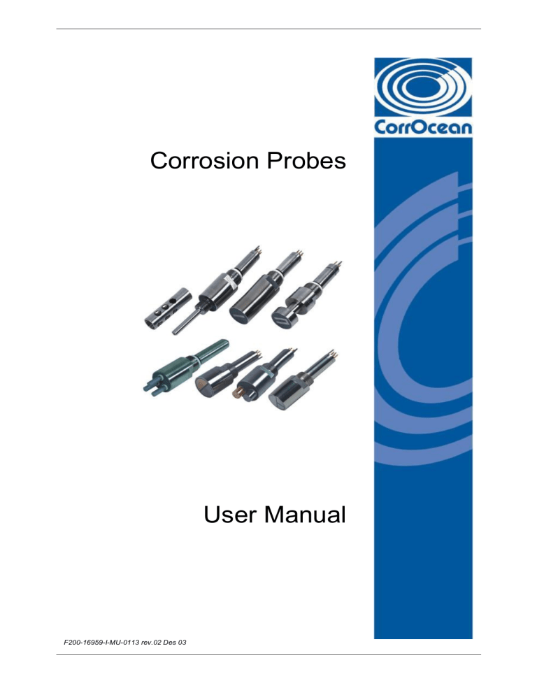 Corrosion Probes User Manual F200-16959-I-MU-0113 rev.02 Des 03 CorrOcean ASA Document Title: USER MANUAL FOR CORROSION PROBES Document No.: F200-16959-I-MU-0113 Rev: Page: Date: 02 2 of 66 09.12.03 Contents Chapter 1 1.1 1.2 1.3 1.4 Chapter 2 2.1 2.2 2.3 Chapter 3 3.1 3.2 3.3 Chapter 4 4.1 INTRODUCTION ....................................................................................................4 How to use this manual ..........................................................................................5 Normative references .............................................................................................6 Conformity to the Pressure Equipment Directive (PED) ..........................................6 Assistance..............................................................................................................7 MAIN DATA ...........................................................................................................8 Guarantee restrictions ............................................................................................8 Equipment Data - Probes .......................................................................................9 2.2.1 Standard ER-probes .................................................................................10 2.2.1.1 ER probe Type Repro A.................................................................11 2.2.1.2 ER probe Type Repro B.................................................................12 2.2.1.3 ER probe Type Repro C ................................................................13 2.2.1.4 ER probe Type Tubular..................................................................14 2.2.1.5 The High Sensitivity ER-probe .......................................................15 2.2.2 LPR-probes ..............................................................................................16 2.2.2.1 LPR probe Type Triple B ...............................................................17 2.2.2.2 LPR probe Type Two electrode B ..................................................18 2.2.2.3 LPR probe Type Two electrode C..................................................19 2.2.2.4 LPR probe Type Triple C ...............................................................20 2.2.3 Galvanic probes........................................................................................21 2.2.3.1 Galvanic probe Type Galvopro B ...................................................22 2.2.3.2 Galvanic probe Type Galvopro C...................................................23 Equipment data - Plugs ........................................................................................24 2.3.1 Hollow plugs .............................................................................................25 TECHNICAL DESCRIPTION................................................................................27 General information ..............................................................................................27 Probes..................................................................................................................28 3.2.1 ER-probes ................................................................................................29 3.2.2 LPR probes...............................................................................................31 3.2.3 Galvanic probes........................................................................................33 Plugs 34 PREPARATION AND INSTALLATION ................................................................35 Probes..................................................................................................................35 4.1.1 Preparation ...............................................................................................35 4.1.2 Tools/equipment .......................................................................................35 4.1.2.1 Operating a hydraulic access fitting system ...................................35 4.1.2.2 Operating a mechanical access fitting system................................37 4.1.3 Consumables/spare parts .........................................................................38 4.1.3.1 Operating a hydraulic access fitting system - ref. figures 28, 29 and 30 38 4.1.3.2 Operating a mechanical access fitting system - ref. figure 31.........39 4.1.4 Installation of corrosion probes and hollow plugs ......................................40 4.1.4.1 Installation of Probe with Hollow Plug - Hydraulic system ..............40 4.1.4.2 Installation of Hollow Plug only - Hydraulic system ........................41 4.1.4.3 Installation of Probe with Hollow Plug - Mechanical system ...........42 4.1.4.4 Installation of Hollow Plug only - Mechanical system .....................44 4.1.5 Inspection .................................................................................................45 4.1.5.1 Hydraulic system ...........................................................................45 CorrOcean ASA Document Title: USER MANUAL FOR CORROSION PROBES Document No.: F200-16959-I-MU-0113 5.3 5.4 Chapter 6 6.1 6.2 Chapter 7 7.1 7.2 Chapter 8 02 3 of 66 09.12.03 4.1.5.2 Mechanical system ........................................................................45 Testing......................................................................................................46 Commissioning .........................................................................................46 4.1.7.1 Hydraulic system ...........................................................................46 4.1.7.2 Mechanical system ........................................................................47 Plugs 47 OPERATING INSTRUCTIONS.............................................................................48 Replacement of equipment in Pressurised Systems .............................................48 Operation during normal service......