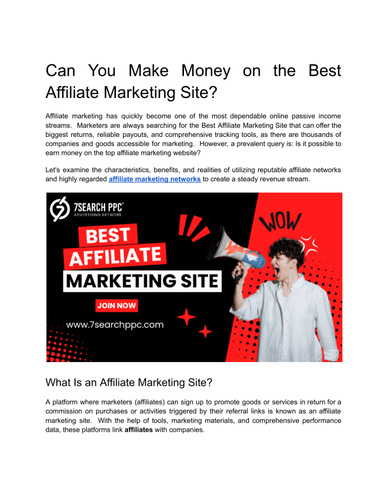 Can You Make Money on the Best Affiliate Marketing Site? Affiliate marketing has quickly become one of the most dependable online passive income streams. Marketers are always searching for the Best Affiliate Marketing Site that can offer the biggest returns, reliable payouts, and comprehensive tracking tools, as there are thousands of companies and goods accessible for marketing. However, a prevalent query is: Is it possible to earn money on the top affiliate marketing website? Let's examine the characteristics, benefits, and realities of utilizing reputable affiliate networks and highly regarded affiliate marketing networks to create a steady revenue stream. What Is an Affiliate Marketing Site? A platform where marketers (affiliates) can sign up to promote goods or services in return for a commission on purchases or activities triggered by their referral links is known as an affiliate marketing site. With the help of tools, marketing materials, and comprehensive performance data, these platforms link affiliates with companies. Boost Your Income Online! User-friendly dashboards, real-time tracking, different reward models (CPC, CPA, and CPS), and a large range of merchants from diverse niches are among features that the top affiliate marketing systems provide. They act as a link between bloggers, advertisers, influencers, and content producers looking to increase traffic and sales. How Do Affiliate Marketers Make Money? Although the method is simple, it requires commitment and planning. Depending on how the campaign is set up, affiliates get paid when a user clicks on their link and completes a certain action, such as making a purchase, signing up, downloading anything, or just going to a landing page. The top affiliate marketing websites often allow multiple earning models: ● Pay Per Sale (PPS): Commission based on sales. ● Pay Per Click (PPC): Earnings based on traffic. ● Pay Per Lead (PPL): Commissions for generating leads. To generate consistent income, marketers must: ● ● ● ● Choose the right niche Create valuable content Understand their audience Use SEO, email marketing, or paid advertising to drive traffic What Makes a Platform the Best Affiliate Marketing Site? Not all affiliate platforms are created equal. The best sites for affiliate marketing provide an ideal mix of high commission rates, brand variety, trustworthiness, and user experience. Here’s what sets them apart: Reputation and Trust Trusted affiliate networks are known for on-time payments, ethical practices, and strong support. Platforms like ShareASale, CJ Affiliate, and Impact have earned the trust of both marketers and advertisers alike. High-Paying Offers You must have access to high-paying affiliate marketing websites if you want to make a significant amount of money. These platforms frequently feature deals from profitable sectors including eCommerce, software, healthcare, and finance. SaaS platforms, for example, are a desirable option because they frequently provide recurring commissions. Niche Variety The top affiliate marketing website will serve your niche, whether you're a fashion influencer, tech reviewer, or food blogger. While some platforms, like ClickBank, concentrate primarily on digital goods, others, including Amazon Associates and 7Search PPC, offer a wider variety of products. Real-Time Tracking and Analytics The success of affiliate marketing depends on data. The best affiliate networks offer robust analytics tools that let you track clicks and conversions, enhance your campaigns, and make wise choices. Best Affiliate Marketing Sites to Explore After discussing the fundamentals, let's look at a few highly regarded affiliate marketing networks where both novices and experts can earn actual money. Amazon Associates – The Popular Choice for Beginners For newbies, Amazon Associates is arguably the best affiliate website. For those who are just starting out, its extensive product library, brand familiarity, and ease of use make it a great option. Depending on the product category, commissions might vary from 1% to 10%. Despite relatively lower commissions, its conversion rate is high because people already trust Amazon. CJ Affiliate – One of the Top Affiliate Marketing Websites Previously called Commission Junction, CJ Affiliate is one of the best networks for affiliate marketers looking for high-end brand partnerships. Among the network are well-known companies like Lowe's, TurboTax, and Barnes & Noble. CJ's customisable widgets, real-time reporting, and deep linking make it ideal for expanding revenue through data-driven decision-making. 7Search PPC Affiliate Program In the realm of affiliate marketing, 7Search PPC is a rising star, particularly for those who are considering Pay-Per-Click (PPC) strategies. By directing publishers and advertisers to the 7Search PPC affiliate network, users can receive commissions. 7Search PPC is a good option if you want to start affiliate marketing with little work and quick profits, particularly in Southeast Asia and Vietnam, where digital marketing is growing quickly. Rakuten Advertising – A Top-Rated Affiliate Marketing Network Rakuten is often listed among the top-rated affiliate marketing networks due to its long-standing reputation and advanced technology. The interface supports intuitive campaign management and strong brand collaborations. Though selective in its acceptance process, Rakuten is ideal for professional affiliates seeking premium partnerships. ClickBank – Perfect for Digital Product Affiliates ClickBank is an additional lucrative affiliate marketing platform that specializes in digital products. This platform is popular among individuals who promote software, eBooks, and courses because it offers affiliates commissions ranging from 50% to 75% on specific products. If you’re into email marketing or creating landing pages, ClickBank can deliver fast results. Impact – The Platform for Serious Marketers Impact is a powerf