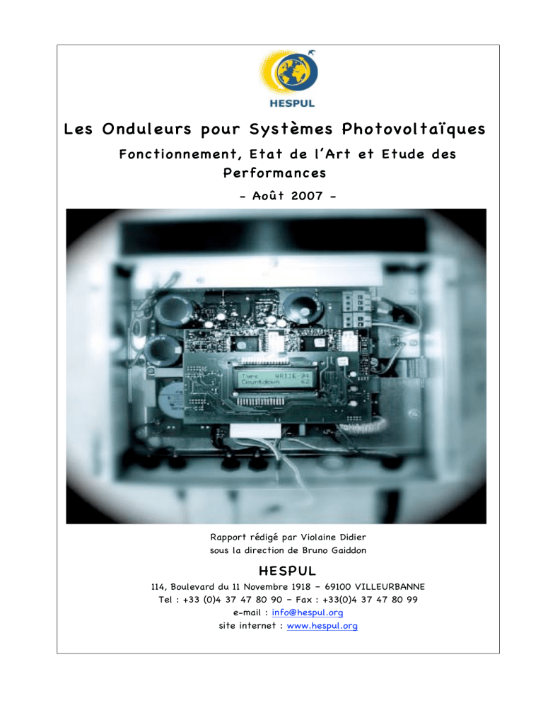 Les Onduleurs pour Systèmes Photovoltaïques Fonctio nnement , Etat de l’ Art et Et ude des Performa nces - Août 2007 - Rapport rédigé par Violaine Didier sous la direction de Bruno Gaiddon HESPUL 114, Boulevard du 11 Novembre 1918 – 69100 VILLEURBANNE Tel : +33 (0)4 37 47 80 90 – Fax : +33(0)4 37 47 80 99 e-mail : info@hespul.org site internet : www.hespul.org Ava nt-propo s Hespul est une association loi de 1901, dont l’objet social est le développement de l’efficacité énergétique et des énergies renouvelables. Elle est spécialisée depuis 1991 dans la promotion et les opérations de démonstration de la filière photovoltaïque, et plus spécialement dans sa version raccordée au réseau. Entre 1993 et 2001, Hespul a coordonné plusieurs projets de démonstration financés par la Commission Européenne (DG TREN) visant à l’installation de systèmes photovoltaïques raccordés au réseau de faible puissance. L’expérience acquise par Hespul au cours de ces projets de démonstration se traduit par une expertise à la fois technique, économique et juridique sur les conditions de mise en œuvre du photovoltaïque en France. Elle permet d’accompagner les maîtres d’ouvrage, les développeurs de projets ainsi que les pouvoirs publics. Par ailleurs, Hespul participe désormais à plusieurs groupes d’experts internationaux comme par exemple la Plate-forme Technologique Européenne du Photovoltaïque et l’Agence Internationale de l’Énergie. En parallèle de cette activité qui reste principale, Hespul a été intégrée à partir de 2000 dans le réseau des Espaces-Info-Energie mis en place par l’ADEME avec la responsabilité géographique du département du Rhône et une compétence multi-filières, énergies renouvelables et efficacité énergétique comprises. Cela a permis de mettre en pratique une approche territoriale parfaitement complémentaire des aspects purement techniques déjà bien maîtrisés. Le présent rapport, rédigé par Violaine DIDIER sous la direction de Bruno GAIDDON, constitue un travail de synthèse sur le fonctionnement des onduleurs des systèmes photovoltaïques et les différences des différents types d’appareils présents sur le marché actuel. Les onduleurs des systèmes photovoltaïques – avril 2007 2 SOMMAIRE A VA NT - PROP OS ......................................................................................... 2 S OMM AIR E ............................................................................................ 3 I NT ROD UCT IO N .......................................................................................... 4 A. GENER ALI TES ET P RI NC IP ES DE FONC TI ONNEM ENT ................................ 5 A.1. D EFIN IT IO N ..................................................................................... 5 A. 2. C A RACT ER IS T IQ UE S PR OPR ES A UN O ND UL E UR POUR SYS TE MES PHO TO VOL TA ÏQ UES (PV) 5 A. 3. D ETA ILS TEC HN OL OGIQ UE S .................................................................. 7 A.3. A A.3. B A.3. C PRINCIPAUX TYPES D’ONDULEURS RENCONTRES ........................................................................ 7 ROLE DU CONDENSATEUR D’ENTREE........................................................................................ 10 METHODES DE RECHERCHE DU POINT DE PUISSANCE MAXIMALE ...................................................11 B. ETA T DE L ’A RT DES ONDUL EUR S M ODUL A IRES P OUR INS TA L LA TI ONS PH OTOV OL TAÏ Q UES .................................................................................. 14 B. 1. R E NDEM E NT MA X IMAL : ...................................................................... 14 B. 2. G AMME DE T E NS IO NS D ’ E N TR EE ............................................................ 14 B. 3. L A D URE E D E VIE .............................................................................. 16 B. 4. L ES PRO BL EM ES D E VE N TILA TION .......................................................... 16 B. 5. G EST IO N DU R ES EA U ......................................................................... 17 B. 6. I NT ER R UPT EUR DC * .......................................................................... 18 B. 7. M ES URE S D ES C OURB ES CAR ACT ER IS TIQ UE S I V ......................................... 18 B. 8. M EM O IR E D E S TOCKAG E ...................................................................... 18 B. 9. E T HE R NE T ...................................................................................... 19 B. 10. O RIE NTA T IO N D ES PA N NE AUX ES T - OUES T ................................................ 19 B. 11. M OD UL ES A C OUCH ES M INCE S .............................................................. 20 C. ETUDE DES P ER FOR M ANC ES ................................................................. 21 C. 1. C. 2. A VA NT - PROP OS ................................................................................ 21 M E TH ODOL OGIE EMP LOY EE PO UR L ES TES TS ............................................. 21 C.2. A C.2. B C.2. C C. 3. CONDITIONS DE TESTS ........................................................................................................ 21 ÉQUIPEMENT DE MESURE .....................................................................................................22 MODELE DE FICHE METHODOLOGIQUE UTILISEE POUR LA SYNTHESE DES TESTS ..............................23 F ICH ES REC APITULA TIVE S D ES D IFFE RE N TS O ND ULE UR S T ES TES ...................... 26 C.3. A C.3. B C.3. C C.3. D C.3. E FICHE FRONIUS, ONDULEUR IG 30.....................................................................................26 FICHE SMA, ONDULEUR SUNNY BOY 3800.............................................................................29 FICHE SPUTNIK, ONDULEUR SOLARMAX 2000C ....................................................................32 FICHE SIEMENS, ONDULEUR SITOP SOLAR 1100 MASTER ....