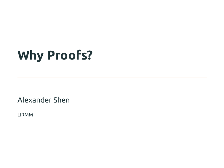 Why Proofs? Alexander Shen LIRMM Outline Proofs? Really? Proof by example Impossibility proof Impossibility Proof, II Conclusion Do We Need Proofs? • mathematicians: main tool Do We Need Proofs? • mathematicians: main tool • programmers: more skeptical Do We Need Proofs? • mathematicians: main tool • programmers: more skeptical • correctness proof of a video game? or search engine? Do We Need Proofs? • mathematicians: main tool • programmers: more skeptical • correctness proof of a video game? or search engine? • but real-time operating system or cryptographic protocol is a different thing What Is a Proof? What Is a Proof? • proof: a long formal meaningless manipulation What Is a Proof? • proof: a long formal meaningless manipulation • not at all: an argument that is so convincing that you are ready to use it to convince other people What Is a Proof? • proof: a long formal meaningless manipulation • not at all: an argument that is so convincing that you are ready to use it to convince other people • a by-product and a sign of understanding What Is a Proof? • proof: a long formal meaningless manipulation • not at all: an argument that is so convincing that you are ready to use it to convince other people • a by-product and a sign of understanding • believe or not: proofs are fun Course Objectives Course Objectives • learn by examples how to understand proofs Course Objectives • learn by examples how to understand proofs • how to invent proofs Course Objectives • learn by examples how to understand proofs • how to invent proofs • how to explain proofs Course Objectives • learn by examples how to understand proofs • how to invent proofs • how to explain proofs • how to enjoy proofs (most important and ambitious goal) Course Objectives • learn by examples how to understand proofs • how to invent proofs • how to explain proofs • how to enjoy proofs (most important and ambitious goal) Intended audience: beginners Course Objectives • learn by examples how to understand proofs • how to invent proofs • how to explain proofs • how to enjoy proofs (most important and ambitious goal) Intended audience: beginners Prerequsites: curiosity Paul Erdős and The Book [Google Books and Wikipedia images] To Begin With… Can a chessboard 8 × 8 be tiled (no overlaps or empty space) by domino 1 × 2-tiles? Outline Proofs? Really? Proof by example Impossibility proof Impossibility Proof, II Conclusion TIling a Chessboard Prove that a chessboard 8 × 8 can be tiled (no overlaps or empty space) by domino 1 × 2-tiles. TIling a Chessboard Prove that a chessboard 8 × 8 can be tiled (no overlaps or empty space) by domino 1 × 2-tiles. TIling a Chessboard Prove that a chessboard 8 × 8 can be tiled (no overlaps or empty space) by domino 1 × 2-tiles. Other Tilings One tiling is enough for the proof. But there are others: Can We Tile This Board? Can We Tile This Board? Can We Tile This Board? Can We Tile This Board? Can We Tile This Board? Can We Tile This Board? Can We Tile This Board? Can We Tile This Board? Can We Tile This Board? Can We Tile This Board? Can We Tile This Board? Can We Tile This Board? Trying Again Trying Again Trying Again Trying Again Trying Again Trying Again Trying Again Trying Again Trying Again Trying Again Trying Again Trying Again Trying Again Trying Again Trying Again Trying Again So What? So What? • did we find a tiling (and prove that it exists)? So What? • did we find a tiling (and prove that it exists)? No. So What? • did we find a tiling (and prove that it exists)? No. • did we prove that tiling does not exist? So What? • did we find a tiling (and prove that it exists)? No. • did we prove that tiling does not exist? No. So What? • did we find a tiling (and prove that it exists)? No. • did we prove that tiling does not exist? No. • can we do one of these two proofs? Outline Proofs? Really? Proof by example Impossibility proof Impossibility Proof, II Conclusion Can We Tile This Board? Proof of Impossibility • one cell will always remain, because… Proof of Impossibility • one cell will always remain, because… • there are 63 = 8 × 8 − 1 cells, an odd number Proof of Impossibility • one cell will always remain, because… • there are 63 = 8 × 8 − 1 cells, an odd number • 31 tiles cover 62 cells, one remains Proof of Impossibility • one cell will always remain, because… • there are 63 = 8 × 8 − 1 cells, an odd number • 31 tiles cover 62 cells, one remains • mission provably impossible Two Corners Cut Two Corners Cut 64 − 2 = 62 cells, 62/2 = 31 tiles. So the tiling is possible… Two Corners Cut 64 − 2 = 62 cells, 62/2 = 31 tiles. So the tiling is possible… is this argument OK? Trying… Trying… Trying… Trying… Trying… Trying… Trying… Trying… Trying… Trying… Trying… Trying… Trying… Trying… Trying… Trying… Trying… Trying… Trying… Trying… Trying… Trying… One More Attempt One More Attempt One More Attempt One More Attempt One More Attempt One More Attempt One More Attempt One More Attempt One More Attempt One More Attempt One More Attempt One More Attempt One More Attempt One More Attempt One More Attempt One More Attempt One More Attempt One More Attempt One More Attempt One More Attempt One More Attempt One More Attempt One More Attempt One More Attempt One More Attempt One More Attempt One More Attempt One More Attempt One More Attempt One More Attempt One More Attempt One More Attempt should we try harder? Outline Proofs? Really? Proof by example Impossibility proof Impossibility Proof, II Conclusion Can We Tile This Board? Spoiler Spoiler Spoiler Spoiler 32 white, 30 black Spoiler 32 white, 30 black ⇒ two whites remain Recap Theorem. A chess board 8 × 8 without two opposite corners cannot be tiled by 1 × 2 dominos. Recap Theorem. A chess board 8 × 8 without two opposite corners cannot be tiled by 1 × 2 domin