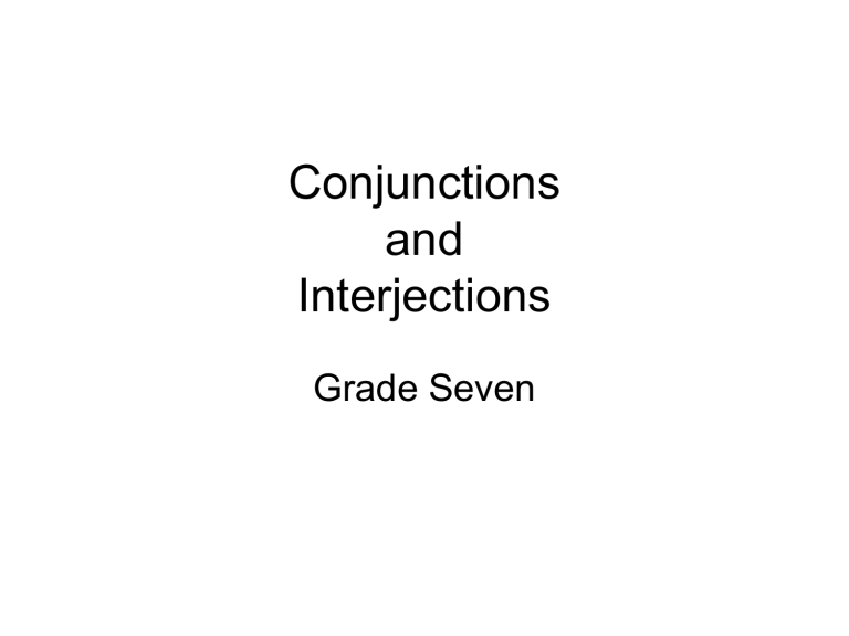 Conjunctions and Interjections Grade Seven What is a Conjunction? • A conjunction is like glue. It helps things to stick together. • A conjunction joins words, phrases, and sentences, which are called clauses. What is a Conjunction? • Conjunctions join two or more words. Example: I went to the store to buy eggs, milk, and bread. What is a Conjunction? • Conjunctions can join two prepositional phrases. Ex. I went skiing down the hill and past the trees. What is a Conjunction? • Conjunctions can connect two clauses or sentences. • When two sentences are joined, a comma MUST be placed before the conjunction. Ex. I played cards for awhile, but then I played chess. Types of Conjunctions • One type of conjunction is the coordinating conjunction. • They connect words, phrases, and clauses, which are sentences. • They connect things of equal value. (This means that they would connect a noun with another noun or a prepositional phrase with another prepositional phrase.) Types of Conjunctions • There are seven coordinating conjunctions: Use FANBOYS to remember for and or nor yet but so Types of Conjunctions • Coordinating conjunctions affect the meaning of your sentence. • “And” connects things that are alike or joined together. • Ex. I want popcorn and pizza. Types of Conjunctions • Coordinating conjunctions affect the meaning of your sentence. • “But” is used to connect things that are different or separated. • Ex. I want popcorn but not pizza. Types of Conjunctions • Coordinating conjunctions affect the meaning of your sentence. • “Or” is used to offer a choice. • Ex. Do I want popcorn or pizza? Types of Conjunctions • Coordinating conjunctions affect the meaning of your sentence. • “Nor” is used to offer a negative choice. • Ex. I do not want popcorn nor pizza. Types of Conjunctions • Coordinating conjunctions affect the meaning of your sentence. • “Yet” is used to show a change. When it is used to combine two sentences, you must put a comma before it. • Ex. I want popcorn, yet I also want pizza. Types of Conjunctions • Coordinating conjunctions affect the meaning of your sentence. • “So” is used to show a relationship between things. When it is used to combine two sentences, you must put a comma before it. • Ex. I want popcorn, so I made some. Types of Conjunctions • Coordinating conjunctions affect the meaning of your sentence. • “For” is also used to show a relationship between things. When it is used to combine two sentences, you must put a comma before it. • Ex. I ordered a pizza, for I was hungry. Types of Conjunctions • Another type of conjunction is called correlative conjunctions. • Correlative conjunctions connect words, phrases, and clauses, which are sentences. • Correlative conjunctions connect things of equal value. (This means that they will connect a verb with another verb or a sentence with another sentence.) Types of Conjunctions • Correlative Conjunctions are not single words. They work in pairs. • There are five pairs of correlative conjunctions: both….and whether….or not only….but also neither….nor either….or Examples of Correlative Conjunctions I saw both the Statue of Liberty and the Empire State Building. Examples of Correlative Conjunctions I don’t want neither pickles nor tomato on my hamburger. Examples of Correlative Conjunctions I don’t know whether to play baseball or to play basketball this year. Examples of Correlative Conjunctions Either the student or the teacher can answer the question. Examples of Correlative Conjunctions Not only do I play the flute, but I also play the clarinet. What is an Interjection? • An interjection is something that interrupts a sentence. • It is something that also expresses your emotions like happiness, fear, anger, or pain. • Some examples of interjections are: ouch, wow, uh oh, oh no, gosh, shhhh Punctuating Interjections • If an interjection is spoken calmly, simply put a comma after it and continue the sentence. Ex. Shhh, the baby is sleeping. Ex. Oh my, I dropped my pencil. Punctuating Interjections • If an interjection is spoken with more emotion, it is followed by an exclamation point. The next word is then capitalized. Ex. Ouch! I just cut my finger. Ex. He scored the winning touchdown. Wow!