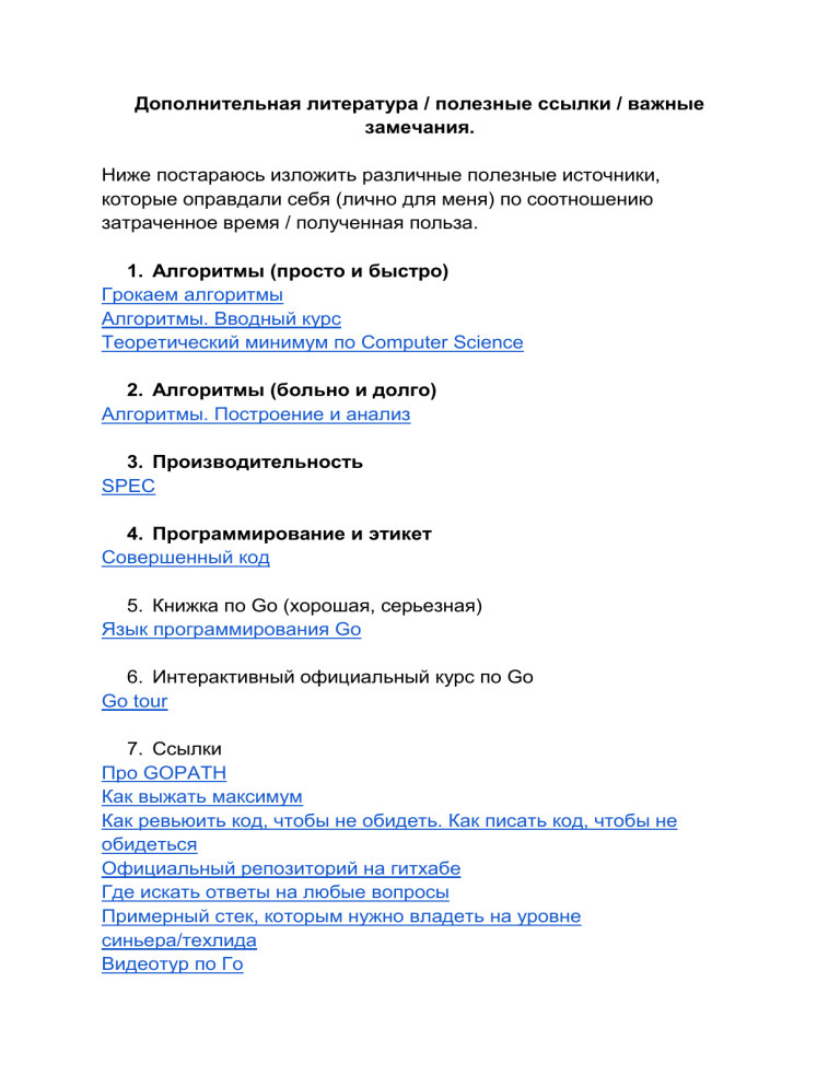 Дополнительная литература / полезные ссылки / важные замечания. Ниже постараюсь изложить различные полезные источники, которые оправдали себя (лично для меня) по соотношению затраченное время / полученная польза. 1. Алгоритмы (просто и быстро) Грокаем алгоритмы Алгоритмы. Вводный курс Теоретический минимум по Computer Science 2. Алгоритмы (больно и долго) Алгоритмы. Построение и анализ 3. Производительность SPEC 4. Программирование и этикет Совершенный код 5. Книжка по Go (хорошая, серьезная) Язык программирования Go 6. Интерактивный официальный курс по Go Go tour 7. Ссылки Про GOPATH Как выжать максимум Как ревьюить код, чтобы не обидеть. Как писать код, чтобы не обидеться Официальный репозиторий на гитхабе Где искать ответы на любые вопросы Примерный стек, которым нужно владеть на уровне синьера/техлида Видеотур по Го Спасительный пакет: структуры данных на Го