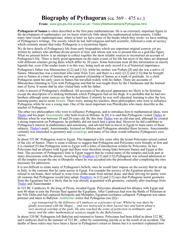 Biography of Pythagoras (ca. 569 – 475 B.C.) From: www-groups.dcs.st-and.ac.uk/ ~history/Mathematicians/Pythagoras.html Pythagoras of Samos is often described as the first pure mathematician. He is an extremely important figure in the development of mathematics yet we know relatively little about his mathematical achievements. Unlike many later Greek mathematicians, where at least we have some of the books which they wrote, we have nothing of Pythagoras's writings. The society which he led, half religious and half scientific, followed a code of secrecy which certainly means that today Pythagoras is a mysterious figure. We do have details of Pythagoras's life from early biographies which use important original sources yet are written by authors who attribute divine powers to him, and whose aim was to present him as a god-like figure. What we present below is an attempt to collect together the most reliable sources to reconstruct an account of Pythagoras's life. There is fairly good agreement on the main events of his life but most of the dates are disputed with different scholars giving dates which differ by 20 years. Some historians treat all this information as merely legends but, even if the reader treats it in this way, being such an early record it is of historical importance. Pythagoras's father was Mnesarchus ([12] and [13]), while his mother was Pythais [8] and she was a native of Samos. Mnesarchus was a merchant who came from Tyre, and there is a story ([12] and [13]) that he brought corn to Samos at a time of famine and was granted citizenship of Samos as a mark of gratitude. As a child Pythagoras spent his early years in Samos but travelled widely with his father. There are accounts of Mnesarchus returning to Tyre with Pythagoras and that he was taught there by the Chaldaeans and the learned men of Syria. It seems that he also visited Italy with his father. Little is known of Pythagoras's childhood. All accounts of his physical appearance are likely to be fictitious except the description of a striking birthmark which Pythagoras had on his thigh. It is probable that he had two brothers although some sources say that he had three. Certainly he was well educated, learning to play the lyre, learning poetry and to recite Homer. There were, among his teachers, three philosophers who were to influence Pythagoras while he was a young man. One of the most important was Pherekydes who many describe as the teacher of Pythagoras. The other two philosophers who were to influence Pythagoras, and to introduce him to mathematical ideas, were Thales and his pupil Anaximander who both lived on Miletus. In [8] it is said that Pythagoras visited Thales in Miletus when he was between 18 and 20 years old. By this time Thales was an old man and, although he created a strong impression on Pythagoras, he probably did not teach him a great deal. However he did contribute to Pythagoras's interest in mathematics and astronomy, and advised him to travel to Egypt to learn more of these subjects. Thales's pupil, Anaximander, lectured on Miletus and Pythagoras attended these lectures. Anaximander certainly was interested in geometry and cosmology and many of his ideas would influence Pythagoras's own views. In about 535 BC Pythagoras went to Egypt. This happened a few years after the tyrant Polycrates seized control of the city of Samos. There is some evidence to suggest that Pythagoras and Polycrates were friendly at first and it is claimed [5] that Pythagoras went to Egypt with a letter of introduction written by Polycrates. In fact Polycrates had an alliance with Egypt and there were therefore strong links between Samos and Egypt at this time. The accounts of Pythagoras's time in Egypt suggest that he visited many of the temples and took part in many discussions with the priests. According to Porphyry ([12] and [13]) Pythagoras was refused admission to all the temples except the one at Diospolis where he was accepted into the priesthood after completing the rites necessary for admission. It is not difficult to relate many of Pythagoras's beliefs, ones he would later impose on the society that he set up in Italy, to the customs that he came across in Egypt. For example the secrecy of the Egyptian priests, their refusal to eat beans, their refusal to wear even cloths made from animal skins, and their striving for purity were all customs that Pythagoras would later adopt. Porphyry in [12] and [13] says that Pythagoras learnt geometry from the Egyptians but it is likely that he was already acquainted with geometry, certainly after teachings from Thales and Anaximander. In 525 BC Cambyses II, the king of Persia, invaded Egypt. Polycrates abandoned his alliance with Egypt and sent 40 ships to join the Persian fleet against the Egyptians. After Cambyses had won the Battle of Pelusium in the Nile Delta and had captured Heliopolis and Memphis, Egyptian resistance collapsed. Pythagoras was taken prisoner and taken to Babylon. Iamblichus writes that Pythagoras (see [8]):... was transported by the followers of Cambyses as a prisoner of war. Whilst he was there he gladly associated with the Magoi ... and was instructed in their sacred rites and learnt about a very mystical worship of the gods. He also reached the acme of perfection in arithmetic and music and the other mathematical sciences taught by the Babylonians... In about 520 BC Pythagoras left Babylon and returned to Samos. Polycrates had been killed in about 522 BC and Cambyses died in the summer of 522 BC, either by committing suicide or as the result of an accident. The deaths of these rulers may have been a factor in Pythagoras's return to Samos but it is nowhere explained how Pythagoras obtained his freedom. Darius of Persia had taken control of Samos after Polycrates' death and he would have controlled the island on Pythagoras's return. This conflicts with the accounts of Porphyry and Diogenes Laertius who state that Polycrates was still in control of S