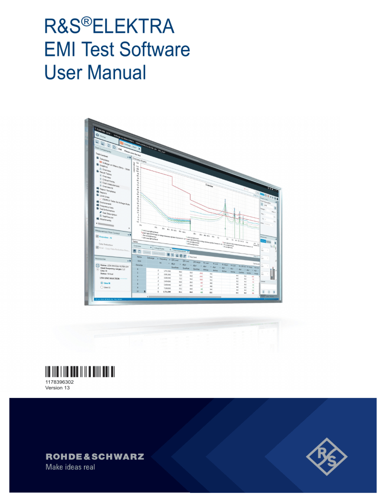 R&S®ELEKTRA EMI Test Software User Manual (;ÜWÍ2) 1178396302 Version 13 This user manual describes the R&S®ELEKTRA EMI Test Software, order no. 5601.0030.02, for electromagnetic interference (EMI) tests, software version V4.30 and later The software contained in this product uses several valuable open source software packages. For information, see the "Open Source Acknowledgment" document, which is available for download from the R&S ELEKTRA product page at "www.rohdeschwarz.com/product/elektra" > "Software". Rohde & Schwarz would like to thank the open source community for their valuable contribution to embedded computing. © 2021 Rohde & Schwarz GmbH & Co. KG Mühldorfstr. 15, 81671 München, Germany Phone: +49 89 41 29 - 0 Email: info@rohde-schwarz.com Internet: www.rohde-schwarz.com Subject to change – data without tolerance limits is not binding. R&S® is a registered trademark of Rohde & Schwarz GmbH & Co. KG. Trade names are trademarks of the owners. 1178.3963.02 | Version 13 | R&S®ELEKTRA Throughout this manual, products from Rohde & Schwarz are indicated without the ® symbol, for example R&S®ELEKTRA is indicated as R&S ELEKTRA. R&S®ELEKTRA Contents Contents 1 Welcome................................................................................................. 9 1.1 Key Features..................................................................................................................9 1.2 EMI Standards............................................................................................................. 10 1.3 Documentation Overview........................................................................................... 13 1.3.1 User Manual and Help.................................................................................................. 13 1.3.2 Brochures and Data Sheets.......................................................................................... 13 1.3.3 Release Notes and Open-Source Acknowledgment (OSA)..........................................13 1.3.4 Application Notes, White Papers, etc............................................................................14 1.3.5 Video Tutorials.............................................................................................................. 14 2 Software Installation............................................................................ 15 2.1 System Requirements................................................................................................ 15 2.2 Software Installation Procedure................................................................................ 16 2.3 License Dongle............................................................................................................19 2.3.1 Using the Smart Card Reader.......................................................................................20 2.4 Configuration Wizard for Creating Basic Data......................................................... 24 2.4.1 Recovering Data........................................................................................................... 26 2.5 Language Selection.................................................................................................... 27 2.6 Migration Tool - XML Data Converter........................................................................ 27 2.7 Network Firewall Settings.......................................................................................... 30 2.8 Modify, Repair or Remove Installation...................................................................... 31 3 Getting Started..................................................................................... 34 3.1 User Login................................................................................................................... 36 3.2 Graphical User Interface.............................................................................................36 3.3 Common Action Buttons............................................................................................38 3.4 Touch Operation..........................................................................................................43 3.5 Measurement Settings................................................................................................44 3.6 Performing a Test........................................................................................................ 45 3.7 Test Results................................................................................................................. 46 3.8 Verdict.......................................................................................................................... 48 3.8.1 Editing the Verdict......................................................................................................... 49 3.8.2 Unexpected Verdict....................................................................................................... 50 User Manual 1178.3963.02 ─ 13 3 R&S®ELEKTRA Contents 3.9 Reporting..................................................................................................................... 50 4 Configuration........................................................................................52 4.1 Home Menu..................................................................................................................52 4.2 Dashboard................................................................................................................... 54 4.3 Tests............................................................................................................................. 55 4.3.1 Configuring Tests.......................................................................................................... 56 4.3.2 Configuring Test Charts.................................................................................................58 4.3.2.1 Chart.................