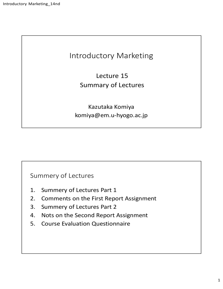 Introductory Marketing_14nd Introductory Marketing Lecture 15 Summary of Lectures Kazutaka Komiya komiya@em.u-hyogo.ac.jp Summery of Lectures 1. 2. 3. 4. 5. Summery of Lectures Part 1 Comments on the First Report Assignment Summery of Lectures Part 2 Nots on the Second Report Assignment Course Evaluation Questionnaire 1 Introductory Marketing_14nd 2. Summery of Lectures_ Part 1 Definition of Marketing • “Marketing is the activity, set of institutions, and processes for creating, communicating, delivering, and exchanging offerings that have value for customers, clients, partners, and society at large”(American Marketing Association 2013) • Essence of Marketing Key word: value To create, communicate and deliver value of offerings to customers Creating Value ① Satisfying a need But, in a competitive environment, simply satisfying a need is not enough to give high value ② Differentiation Creating distinct products from competitors Differentiate your products while satisfying a need Differentiate from competitors while meeting customer needs 2 Introductory Marketing_14nd Marketing Management (MM) • Activities and processes when implementing marketing Basic theory of marketing • Research Phase Research as a starting point Conduct research at each phase • Various data Internal Data, Marketing intelligence and Marketing research data Marketing Management Macro Environment Factor Political, Social, Economic, Technological factors Research Task Environment Factor Marketing is the activity for creating, communicating and delivering value of offerings to customers Marketing Mix Product, Price, Promotion & Place Consumer Own Company Segmentation & Targeting Competitors Positioning Value Proposition (or Concept) STPV Implementation & Evaluation 3 Introductory Marketing_14nd Data in Marketing Management Internal Data Marketing intelligence Marketing research data Data that the company has internally In-store and online sales data Web and social media site visits, etc. Data publicly available about consumers, competitors etc. Benchmarking competitors' products: competitor’s products as a criteria of product quality Monitoring social media, etc. Data collected proactively by companies Survey Interviewing Observation Analyzing Environment • Macro and Task Environment factors Macro: Political, Social, Economic, Technological factors Task: Consumers & partners, Competitors, Own company • Buyer Decision Process (BDP) Need recognition, Information search, Evaluation of alternatives, Purchase Decision, Post-purchase Behavior Consumer research along each stage of the BDP Processes are often simplified: familiar products 4 Introductory Marketing_14nd Macro Environment Factors Factors Examples Political Tax system, Subsidies Economical Economic trends, Currency exchange rates Social Environmental issues, Infectious diseases Technological SNS, AI, Flying car Nabe-cube case Aging Population Popularity of Japanese food overseas Task Environment Factors Factors Examples Nabe-cube case Consumers and partners Consumer characteristics and needs, Distribution system (Wholesale and retail) Heavy to carry, Difficult to adjust the amount per person Competitors Characteristics of competing companies and their products Only liquid-type products in the market Own company Management resources (money, technology, networks etc.) Technology to turn powder into solid, and easy to dissolve 5 Introductory Marketing_14nd Buyer Decision Process Process 1. Need Recognition 2. Information Search 3. Evaluation of Alternatives Buyers' actions • Buyers recognize a problem (lack something) or need • Buyers try (or do not try) to obtain information from several sources • Buyers evaluate alternative products depending on the situation 4. Purchase Decision • Buyers buy the product 5. Post-purchase Behavior Examples of consumer analysis • What are consumers’ needs? • Which media do consumers get information from? • What brands do consumers consider to be alternatives? • Where are consumers buying? • Buyers perceive satisfaction or • How satisfied are consumers dissatisfaction according to with the products? their prior level of expectations Segmentation and Targeting • Segmentation Divide diverse markets into smaller segments Consumers in a segment may have similar needs • Targeting Evaluate and decide which segments a company can target Segmentation is a preparation for targeting Segmentation and targeting as a single process 6 Introductory Marketing_14nd Example of Segmentation and Targeting: Age and Gender Over 50's Market (Set of Consumers) 30’s40’s 10’s20’s 10’s-20’s female Female Male Segmentation Targeting Positioning and Value Proposition • Positioning: Position the product as different from competitors Process for differentiation Often use positioning map • Value proposition: State clearly the benefits consumers get Guide the whole marketing activities Expressed as a slogan in advertising G-SHOCK: “Absolute toughness” 7 Introductory Marketing_14nd Easy to carry and handle Positioning Map: Nabe soup market Nabe-cube Liquid-type nabe soup Easy to adjust amount 2. Comments on the First Report Assignment • First Report Assignment Propose a marketing plan to increase the value of your hometown as a tourist destination • Important points Mechanism of creating value from marketing perspective Satisfying (target) needs and Differentiation Who is the target group and what are the areas of competition? How do you differentiate your homewon from competition areas? 8 Introductory Marketing_14nd First Report Assignment • Propose a marketing plan to increase the value of your hometown as a tourist destination First, briefly introduce your hometown. The subject should be a city (ex. Kobe city), town or village, but more limited areas such as "XX ward" or "YY district" are also acceptable. Then, propose measures to increase the value of the area as a tourist destination from a 