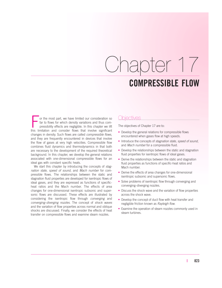 Chapter 17 COMPRESSIBLE FLOW F or the most part, we have limited our consideration so far to flows for which density variations and thus compressibility effects are negligible. In this chapter we lift this limitation and consider flows that involve significant changes in density. Such flows are called compressible flows, and they are frequently encountered in devices that involve the flow of gases at very high velocities. Compressible flow combines fluid dynamics and thermodynamics in that both are necessary to the development of the required theoretical background. In this chapter, we develop the general relations associated with one-dimensional compressible flows for an ideal gas with constant specific heats. We start this chapter by introducing the concepts of stagnation state, speed of sound, and Mach number for compressible flows. The relationships between the static and stagnation fluid properties are developed for isentropic flows of ideal gases, and they are expressed as functions of specificheat ratios and the Mach number. The effects of area changes for one-dimensional isentropic subsonic and supersonic flows are discussed. These effects are illustrated by considering the isentropic flow through converging and converging–diverging nozzles. The concept of shock waves and the variation of flow properties across normal and oblique shocks are discussed. Finally, we consider the effects of heat transfer on compressible flows and examine steam nozzles. Objectives The objectives of Chapter 17 are to: • Develop the general relations for compressible flows encountered when gases flow at high speeds. • Introduce the concepts of stagnation state, speed of sound, and Mach number for a compressible fluid. • Develop the relationships between the static and stagnation fluid properties for isentropic flows of ideal gases. • Derive the relationships between the static and stagnation fluid properties as functions of specific-heat ratios and Mach number. • Derive the effects of area changes for one-dimensional isentropic subsonic and supersonic flows. • Solve problems of isentropic flow through converging and converging–diverging nozzles. • Discuss the shock wave and the variation of flow properties across the shock wave. • Develop the concept of duct flow with heat transfer and negligible friction known as Rayleigh flow. • Examine the operation of steam nozzles commonly used in steam turbines. | 823 824 | Thermodynamics 17–1 ■ STAGNATION PROPERTIES When analyzing control volumes, we find it very convenient to combine the internal energy and the flow energy of a fluid into a single term, enthalpy, defined per unit mass as h ⫽ u ⫹ Pv. Whenever the kinetic and potential energies of the fluid are negligible, as is often the case, the enthalpy represents the total energy of a fluid. For high-speed flows, such as those encountered in jet engines (Fig. 17–1), the potential energy of the fluid is still negligible, but the kinetic energy is not. In such cases, it is convenient to combine the enthalpy and the kinetic energy of the fluid into a single term called stagnation (or total) enthalpy h0, defined per unit mass as h0 ⫽ h ⫹ FIGURE 17–1 Aircraft and jet engines involve high speeds, and thus the kinetic energy term should always be considered when analyzing them. (a) Photo courtesy of NASA, http://lisar.larc.nasa.gov/IMAGES/SMALL/EL1999-00108.jpeg, and (b) Figure courtesy of Pratt and Whitney. Used by permission. V2 ÉÉ1kJ>kg2 2 (17–1) When the potential energy of the fluid is negligible, the stagnation enthalpy represents the total energy of a flowing fluid stream per unit mass. Thus it simplifies the thermodynamic analysis of high-speed flows. Throughout this chapter the ordinary enthalpy h is referred to as the static enthalpy, whenever necessary, to distinguish it from the stagnation enthalpy. Notice that the stagnation enthalpy is a combination property of a fluid, just like the static enthalpy, and these two enthalpies become identical when the kinetic energy of the fluid is negligible. Consider the steady flow of a fluid through a duct such as a nozzle, diffuser, or some other flow passage where the flow takes place adiabatically and with no shaft or electrical work, as shown in Fig. 17–2. Assuming the fluid experiences little or no change in . its elevation and its potential energy, . the energy balance relation (Ein ⫽ Eout) for this single-stream steady-flow system reduces to h1 ⫹ V 21 V 22 ⫽ h2 ⫹ 2 2 (17–2) h01 ⫽ h02 (17–3) or h1 V1 h01 Control volume h2 V2 h02 = h 01 FIGURE 17–2 Steady flow of a fluid through an adiabatic duct. That is, in the absence of any heat and work interactions and any changes in potential energy, the stagnation enthalpy of a fluid remains constant during a steady-flow process. Flows through nozzles and diffusers usually satisfy these conditions, and any increase in fluid velocity in these devices creates an equivalent decrease in the static enthalpy of the fluid. If the fluid were brought to a complete stop, then the velocity at state 2 would be zero and Eq. 17–2 would become h1 ⫹ V 21 ⫽ h 2 ⫽ h 02 2 Thus the stagnation enthalpy represents the enthalpy of a fluid when it is brought to rest adiabatically. During a stagnation process, the kinetic energy of a fluid is converted to enthalpy (internal energy ⫹ flow energy), which results in an increase in the fluid temperature and pressure (Fig. 17–3). The properties of a fluid at the stagnation state are called stagnation properties (stagnation temperature, | Chapter 17 stagnation pressure, stagnation density, etc.). The stagnation state and the stagnation properties are indicated by the subscript 0. The stagnation state is called the isentropic stagnation state when the stagnation process is reversible as well as adiabatic (i.e., isentropic). The entropy of a fluid remains constant during an isentropic stagnation process. The actual (irreversible) a