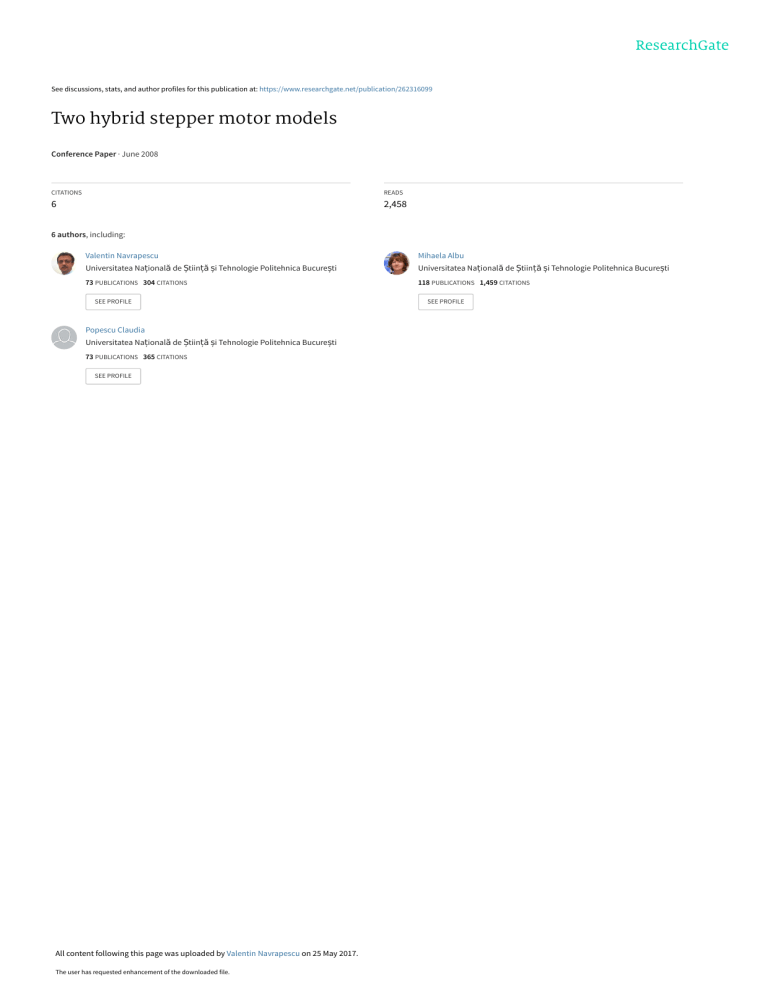 See discussions, stats, and author profiles for this publication at: https://www.researchgate.net/publication/262316099 Two hybrid stepper motor models Conference Paper · June 2008 CITATIONS READS 6 2,458 6 authors, including: Valentin Navrapescu Mihaela Albu Universitatea Națională de Știință și Tehnologie Politehnica București Universitatea Națională de Știință și Tehnologie Politehnica București 73 PUBLICATIONS 304 CITATIONS 118 PUBLICATIONS 1,459 CITATIONS SEE PROFILE Popescu Claudia Universitatea Națională de Știință și Tehnologie Politehnica București 73 PUBLICATIONS 365 CITATIONS SEE PROFILE All content following this page was uploaded by Valentin Navrapescu on 25 May 2017. The user has requested enhancement of the downloaded file. SEE PROFILE 9th WSEAS International Conference on AUTOMATION and INFORMATION (ICAI'08), Bucharest, Romania, June 24-26, 2008 Two Hybrid Stepper Motor Models Dragoş DEACONU, Aurel CHIRILĂ, Valentin NĂVRĂPESCU, Mihaela ALBU, Constantin GHIŢĂ and Claudia POPESCU University Politehnica of Bucharest – Electrical Engineering Department, 313, Splaiul Independenţei, Bucharest, Romania Abstract - The paper is focused on the modeling and simulation of a Hybrid Step Motor (HSM). Starting from a real life HSM and using information from technical literature two HSM models have been developed. The first of them is used to analyze HSM’s response to different types of commands. The second model is used for the HSM’s electromagnetic field analysis. Key-Words: - Stepper motor, hybrid steppers, modelling, simulation 1. Introduction Hybrid Step Motors (HSM) or Hybrid Stepper Motors as they are generally referred in the technical literature are commonly used in high precision dc electrical drives applications. A HSM combines the advantages of a Variable Reluctance Motor (VRM) and a Permanent Magnet Motor (PMM). As a result a HSM has the movement precision of a VRM and the torque of a PMM. The main components of a HSM are the stator and the rotor. Usually the stator is made of toothed magnetic poles on which windings are placed (wounded stator) and the rotor is made of different magnetic cores (also toothed) that are separated by permanent magnets. HSM manufacturers usually provide only a few of the motor’s parameters such as: rated power, rated voltage, rated current and the step angle. In order to properly design an industrial electrical drive a lot of other parameters are needed (such as: inertial moment, detent torque, electrical phase resistance, phase inductance etc.). In some cases it is difficult to identify these parameters therefore it is not easy to develop precise HSM models. This paper shows two HSM models. One refers to the dynamic behavior of the motor and the other one to the electromagnetic field quantities within the motor. provide an additive torque generation on the shaft [1], [2]. The HSM’s rated parameters (given by the manufacturer) are presented in Table I. Fig. 1. The modeled HSM. 2. Hybrid Step Motor Models A. The Modeled HSM In this case the modeled HSM is one of the main components of a large knitting equipment. Fig. 1 shows the modeled HSM. The main parts of this HSM are depicted in Fig. 2 and Fig. 3. It can be seen that the stator is made of toothed magnetic poles on which windings are placed and the rotor is made of two iron cores that are separated by a permanent magnet. The rotor iron cores are offset by one-half tooth pitch to ISBN: 978-960-6766-77-0 129 Fig. 2. The HSM’s main parts – general view. ISSN 1790-5117 9th WSEAS International Conference on AUTOMATION and INFORMATION (ICAI'08), Bucharest, Romania, June 24-26, 2008 d (L(ia ) ⋅ ia ) + ea dt d (L(ib ) ⋅ ib ) ub = R ⋅ ib + + eb dt u a = R ⋅ ia + dθ m dψ am = dt dt dψ bm π dθ eb (θ m ) = − p ⋅ ψ m ⋅ sin( p ⋅ θ m − ) ⋅ m = dt dt 2 Te = − p ⋅ ψ m ⋅ ia ⋅ sin( p ⋅ θ m ) − ea (θ m ) = − p ⋅ ψ m ⋅ sin( p ⋅ θ m ) ⋅ π dθ − p ⋅ ψ m ⋅ ib ⋅ sin( p ⋅ θ m − ) ⋅ m 2 dt Td = Tdm ⋅ sin( 2 ⋅ p ⋅ θ m ) dΩ m = Te − Td − TL − B ⋅ Ω m dt 360 p= 2 ⋅ m ⋅ θ m, n Fig. 3. The HSM’s stator and rotor parts. J⋅ TABLE 1 THE HSM’S RATED PARAMETERS Parameter Symbol Value Number of phases m 2 Excitation type – bipolar Voltage per phase Un 11 V Current per phase Mechanical step angle Electrical phase resistance Phase inductance In 0.71 A θ m, n 1.8° Rn 14.7 Ω Ln 40 mH Jn 300⋅10-7 kg⋅m2 Inertial moment (1) C. The HSM’s Electromagnetic Field Analysis Model The model that is used for the HSM’s electromagnetic field analysis was created in Infolytica MagNet 6.24.1 3D simulation software [4]. The starting point in the development of this model was the measurement of the HSM’s geometrical dimensions. Then the HSM’s main parts (the stator and the rotor) were drawn in MagNet. Fig. 4 and Fig. 5 depict these parts. B. The HSM’s Dynamic Behavior Model The mathematical model of the HSM [3] is described by the following equations (1). where: R – winding resistance/phase, L – winding inductance/phase, ψ m – maximum flux linkage, J – total inertial momentum, B – friction coefficient, Tdm – maximum detent torque, TL – load torque, ψ am , ψbm – the flux linkage generated by the permanent magnet into the stator’s phases. This mathematical model was implemented into MATLAB/Simulink environment. ISBN: 978-960-6766-77-0 Fig. 4. The HSM’s stator in MagNet. The next step in the development of the model was the defining of the materials. Three types of materials were used: one for the stator and rotor cores, one for the stator windings and one for the permanent magnet. The final step in the model’s development was the defining of the voltages that were applied on the stator windings. 130 ISSN 1790-5117 9th WSEAS International Conference on AUTOMATION and INFORMATION (ICAI'08), Bucharest, Romania, June 24-26, 2008 Based on this model three kinds of simulations