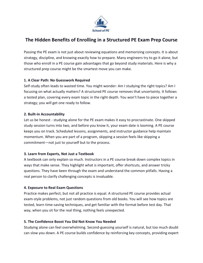 The Hidden Benefits of Enrolling in a Structured PE Exam Prep Course Passing the PE exam is not just about reviewing equations and memorizing concepts. It is about strategy, discipline, and knowing exactly how to prepare. Many engineers try to go it alone, but those who enroll in a PE course gain advantages that go beyond study materials. Here is why a structured prep course might be the smartest move you can make. 1. A Clear Path: No Guesswork Required Self-study often leads to wasted time. You might wonder: Am I studying the right topics? Am I focusing on what actually matters? A structured PE course removes that uncertainty. It follows a tested plan, covering every exam topic in the right depth. You won’t have to piece together a strategy; you will get one ready to follow. 2. Built-in Accountability Let us be honest - studying alone for the PE exam makes it easy to procrastinate. One skipped study session turns into two, and before you know it, your exam date is looming. A PE course keeps you on track. Scheduled lessons, assignments, and instructor guidance help maintain momentum. When you are part of a program, skipping a session feels like skipping a commitment—not just to yourself but to the process. 3. Learn from Experts, Not Just a Textbook A textbook can only explain so much. Instructors in a PE course break down complex topics in ways that make sense. They highlight what is important, offer shortcuts, and answer tricky questions. They have been through the exam and understand the common pitfalls. Having a real person to clarify challenging concepts is invaluable. 4. Exposure to Real Exam Questions Practice makes perfect, but not all practice is equal. A structured PE course provides actual exam-style problems, not just random questions from old books. You will see how topics are tested, learn time-saving techniques, and get familiar with the format before test day. That way, when you sit for the real thing, nothing feels unexpected. 5. The Confidence Boost You Did Not Know You Needed Studying alone can feel overwhelming. Second-guessing yourself is natural, but too much doubt can slow you down. A PE course builds confidence by reinforcing key concepts, providing expert support, and helping you see real progress. Instead of wondering if you are ready, you will know. And that confidence can make all the difference on exam day. Invest in Success Sure, you could try to prepare on your own. But why make the process harder than it needs to be? A structured PE course gives you a roadmap, expert guidance, and the discipline to stay on track. It is a smart investment - one that leads to better preparation, less stress, and a higher chance of passing. If you are serious about earning your PE license, consider enrolling in a structured PE study program and prepare the right way. School of PE offers expert-led PE courses in flexible live online and on-demand formats. Enroll now and march towards PE exam success. For more information visit: https://www.schoolofpe.com/pe
