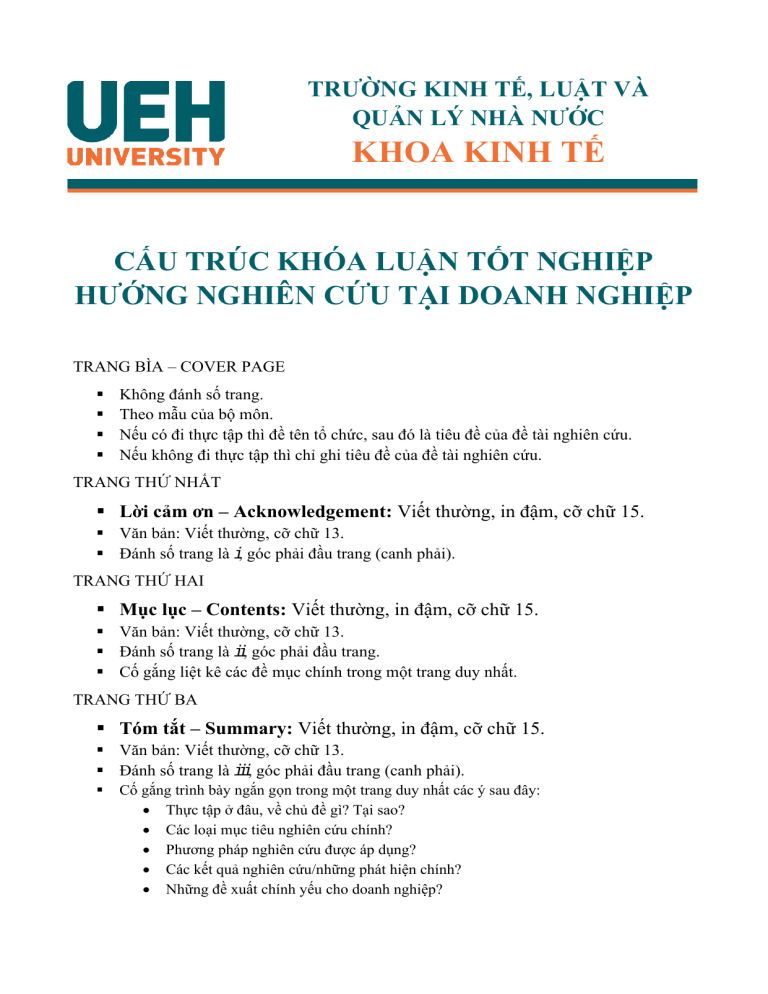 TRƯỜNG KINH TẾ, LUẬT VÀ QUẢN LÝ NHÀ NƯỚC KHOA KINH TẾ CẤU TRÚC KHÓA LUẬN TỐT NGHIỆP HƯỚNG NGHIÊN CỨU TẠI DOANH NGHIỆP TRANG BÌA – COVER PAGE ▪ ▪ ▪ ▪ Không đánh số trang. Theo mẫu của bộ môn. Nếu có đi thực tập thì đề tên tổ chức, sau đó là tiêu đề của đề tài nghiên cứu. Nếu không đi thực tập thì chỉ ghi tiêu đề của đề tài nghiên cứu. TRANG THỨ NHẤT ▪ Lời cảm ơn – Acknowledgement: Viết thường, in đậm, cỡ chữ 15. ▪ Văn bản: Viết thường, cỡ chữ 13. ▪ Đánh số trang là i, góc phải đầu trang (canh phải). TRANG THỨ HAI ▪ Mục lục – Contents: Viết thường, in đậm, cỡ chữ 15. ▪ Văn bản: Viết thường, cỡ chữ 13. ▪ Đánh số trang là ii, góc phải đầu trang. ▪ Cố gắng liệt kê các đề mục chính trong một trang duy nhất. TRANG THỨ BA ▪ Tóm tắt – Summary: Viết thường, in đậm, cỡ chữ 15. ▪ Văn bản: Viết thường, cỡ chữ 13. ▪ Đánh số trang là iii, góc phải đầu trang (canh phải). ▪ Cố gắng trình bày ngắn gọn trong một trang duy nhất các ý sau đây: • Thực tập ở đâu, về chủ đề gì? Tại sao? • Các loại mục tiêu nghiên cứu chính? • Phương pháp nghiên cứu được áp dụng? • Các kết quả nghiên cứu/những phát hiện chính? • Những đề xuất chính yếu cho doanh nghiệp? 1. GIỚI THIỆU – INTRODUCTION ▪ Thực tập về chủ đề gì? Ở đâu? Tại sao? Trong thời gian nào? ▪ Các kết quả/mục tiêu học tập kỳ vọng – learning outcomes ▪ Bối cảnh nghiên cứu (để xác định vấn đề nghiên cứu, và vấn đề nghiên cứu đó có ý nghĩa như thế nào đói với doanh nghiệp) – Background of the study (to identify the research problem). ▪ Sơ lược lý thuyết liên quan đến vấn đề nghiên cứu – An overview of existing literature related to the research problem. ▪ Các mục tiêu/câu hỏi nghiên cứu – Research objectives/questions. ▪ Dàn ý cho phần còn lại của báo cáo – Outline of the rest ▪ Lưu ý trích dẫn. ▪ Đánh số trang là 1, 2, … góc phải đầu trang (canh phải). ▪ Tối đa 5 trang A4. 2. PHƯƠNG PHÁP NGHIÊN CỨU/PHÂN TÍCH VẤN ĐỀ – RESEARCH METHODS/PROBLEM ANALYSIS ▪ Trình bày khung phân tích (mô hình và các biến số liên quan đến vấn đề nghiên cứu) – The analytical framework (models and relevant variables). ▪ Hoặc cách phân tích vấn đề cho vấn đề của doanh nghiệp – Problem analysis methods ▪ Trình bày phương pháp thu thập số liệu/thông tin (loại dữ liệu, cách thức thu thập dữ liệu) – Data/information collection (kind of data, data collection methods). ▪ Trình bày các kỹ thuật phân tích/xử lý số liệu – Data analysis techniques. ▪ Nếu có bảng câu hỏi phỏng vấn thì bạn nên đưa vào phụ lục. ▪ Đánh số trang là tiếp theo phần trên ở góc phải đầu trang (canh phải). ▪ Tối đa 5 trang A4. 3. KẾT QUẢ – RESULTS ▪ ▪ ▪ ▪ ▪ ▪ ▪ Thống kê mô tả (đồ thị, bảng biểu, kiểm định thống kê) – Descriptive statistics Hoặc các kết quả kinh doanh của công ty – Performance results of the company Kết quả ước lượng/Kết quả phân tích vấn đề của công ty – Estimated results Giải thích kết quả – Result interpretations Nếu các bảng có kích cỡ lớn thì bạn nên đưa vào phụ lục. Đánh số trang là tiếp theo phần trên ở góc phải đầu trang (canh phải). Tối đa 12 trang A4. 4. THẢO LUẬN – DISCUSSION ▪ Thảo luận và so sánh với các nghiên cứu trước đây về vấn đề nghiên cứu –Discussion and contextualization of the results. ▪ Hoặc so sánh và đánh giá vấn đề/kết quả của công ty với các doanh nghiệp trong cùng lĩnh vực, trong và ngoài nước – Comparing and evaluating the company’s problem/results with others. ▪ Lưu ý, bạn cần dựa các kết quả từ nghiên cứu trước đây ở phần giới thiệu để làm cơ sở so sánh với các kết quả từ nghiên cứu của bạn. Nếu có sự khác biệt thì bạn phải giải thích tại sao có sự khác biệt đó. ▪ Đánh số trang là tiếp theo phần trên ở góc phải đầu trang (canh phải). ▪ Tối đa 5 trang A4. 5. KẾT LUẬN VÀ RECOMMENDATIONS KIẾN NGHỊ – CONCLUSION AND ▪ Tóm tắt các kết quả chính – A summary of main findings. ▪ Các hàm ý chính sách/Đề xuất cho doanh nghiệp – Policy implimentations/recommendations for the company. ▪ Các hạn chế cần nghiên cứu tiếp theo/Cách thức giải quyết vấn đề cho doanh nghiệp – Further research/Solutions for the company. ▪ Đánh số trang là tiếp theo phần trên ở góc phải đầu trang (canh phải). ▪ Tối đa 3 trang A4. Tài liệu tham khảo – References (phải có) ▪ Theo kiểu APA (Hiệp hội tâm lý học Hoa Kỳ) và xếp tài liệu tham khảo theo thứ tự alphabet, không đánh số thứ tự 1, 2, 3, ... ▪ Đánh số trang tiếp theo phần trên như 36, 37, … ở góc phải đầu trang (canh phải). Phụ lục – Annexes ▪ Tóm lược các hoạt động thực tập hàng từng của bạn (nếu có) – Weekly overview of the internship activities. ▪ Các bảng biểu/số liệu thống kê sử dụng làm minh chứng cho từng hoạt động – Tables of statistical data related to each task (nếu có). ▪ Các bài trình bày, báo cáo, hoặc sản phẩm bạn đã làm hoặc tham gia liên quan đến các công