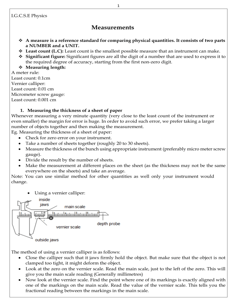 1 I.G.C.S.E Physics Measurements ❖ A measure is a reference standard for comparing physical quantities. It consists of two parts a NUMBER and a UNIT. ❖ Least count (L.C): Least count is the smallest possible measure that an instrument can make. ❖ Significant figure: Significant figures are all the digit of a number that are used to express it to the required degree of accuracy, starting from the first non-zero digit. ❖ Measuring length: A meter rule: Least count: 0.1cm Vernier calliper: Least count: 0.01 cm Micrometer screw gauge: Least count: 0.001 cm 1. Measuring the thickness of a sheet of paper Whenever measuring a very minute quantity (very close to the least count of the instrument or even smaller) the margin for error is huge. In order to avoid such error, we prefer taking a larger number of objects together and then making the measurement. Eg. Measuring the thickness of a sheet of paper: • Check for zero error on your instrument. • Take a number of sheets together (roughly 20 to 30 sheets). • Measure the thickness of the bunch using appropriate instrument (preferably micro meter screw gauge). • Divide the result by the number of sheets. • Make the measurement at different places on the sheet (as the thickness may not be the same everywhere on the sheets) and take an average. Note: You can use similar method for other quantities as well only your instrument would change. • Using a vernier calliper: The method of using a vernier calliper is as follows: • Close the calliper such that it jaws firmly hold the object. But make sure that the object is not clamped too tight, it might deform the object. • Look at the zero on the vernier scale. Read the main scale, just to the left of the zero. This will give you the main scale reading (Generally millimetres) • Now look at the vernier scale. Find the point where one of its markings is exactly aligned with one of the markings on the main scale. Read the value of the vernier scale. This tells you the fractional reading between the markings in the main scale. 2 • The value of the length is given by adding ‘(vernier scale reading x Least count)’ to the main scale. Below diagram illustrates the same. • Measuring volume: 1. Measuring the volume of a liquid: The apparatus used in measuring the volume of a liquid is a measuring cylinder. The following are the steps involved in measuring the volume of the liquid • Take a measuring cylinder of appropriate size (Depending on the volume that you want to measure) • Carefully pour the liquid into the measuring cylinder without splashing or spilling any. • Read the marking on the measuring cylinder which is touched by the lower meniscus of the liquid, this is the volume of the liquid. • View the reading keeping your eyes perpendicular to the measuring cylinder in order to avoid parallax/ line of sight error. 2. Measuring volume of solids: • Regular solids: If the solid is regular in shape, we measure the dimensions of the object and use respective formula to find its volume. Eg: for a cube you measure its sides and the use ‘V= length x breath x height’. For a sphere find 4 the radius and use 𝑉 = 𝜋𝑟 3 3 3 • Measuring volume of irregular solids: For measuring the volume of an irregular solid following step should be followed: o Take a measuring cylinder or a displacement jar of appropriate size. o Fill it with a known volume of water (enough for the object to be completely submerged without spilling the water out). o Slowly immerse the object into the liquid, without spilling or splashing the water out. o Read the volume of the water after the object is completely immersed. o The difference between the original volume and final volume after immersion will give us the volume of the object. • o o o o If the object floats in water: If the object floats in water, e.g. Wood, you use a sinker (Any heavy load that can sink your object because of its weight). The following steps are supposed to be followed: Immerse the sinker carefully into the water and read the volume. Tie the object to the sinker and immerse it again reading the second volume. The difference between both the volumes will give us the volume of the object. Calculate the density of the object using the formula, Density = Mass/volume.