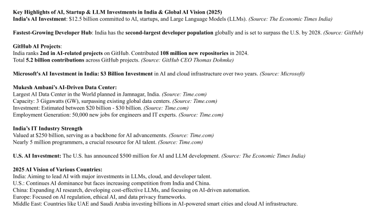 Key Highlights of AI, Startup & LLM Investments in India & Global AI Vision (2025) India's AI Investment: $12.5 billion committed to AI, startups, and Large Language Models (LLMs). (Source: The Economic Times India) Fastest-Growing Developer Hub: India has the second-largest developer population globally and is set to surpass the U.S. by 2028. (Source: GitHub) GitHub AI Projects: India ranks 2nd in AI-related projects on GitHub. Contributed 108 million new repositories in 2024. Total 5.2 billion contributions across GitHub projects. (Source: GitHub CEO Thomas Dohmke) Microsoft's AI Investment in India: $3 Billion Investment in AI and cloud infrastructure over two years. (Source: Microsoft) Mukesh Ambani’s AI-Driven Data Center: Largest AI Data Center in the World planned in Jamnagar, India. (Source: Time.com) Capacity: 3 Gigawatts (GW), surpassing existing global data centers. (Source: Time.com) Investment: Estimated between $20 billion - $30 billion. (Source: Time.com) Employment Generation: 50,000 new jobs for engineers and IT experts. (Source: Time.com) India’s IT Industry Strength Valued at $250 billion, serving as a backbone for AI advancements. (Source: Time.com) Nearly 5 million programmers, a crucial resource for AI talent. (Source: Time.com) U.S. AI Investment: The U.S. has announced $500 million for AI and LLM development. (Source: The Economic Times India) 2025 AI Vision of Various Countries: India: Aiming to lead AI with major investments in LLMs, cloud, and developer talent. U.S.: Continues AI dominance but faces increasing competition from India and China. China: Expanding AI research, developing cost-effective LLMs, and focusing on AI-driven automation. Europe: Focused on AI regulation, ethical AI, and data privacy frameworks. Middle East: Countries like UAE and Saudi Arabia investing billions in AI-powered smart cities and cloud AI infrastructure. Key Highlights of AI, Startup & LLM Investments in India & Global AI Vision (2025) India's AI Investment: $12.5 billion committed to AI, startups, and Large Language Models (LLMs). (Source: The Economic Times India) Fastest-Growing Developer Hub: India has the second-largest developer population globally and is set to surpass the U.S. by 2028. (Source: GitHub) GitHub AI Projects: India ranks 2nd in AI-related projects on GitHub. Contributed 108 million new repositories in 2024. Total 5.2 billion contributions across GitHub projects. (Source: GitHub CEO Thomas Dohmke) Microsoft's AI Investment in India: $3 Billion Investment in AI and cloud infrastructure over two years. (Source: Microsoft) Mukesh Ambani’s AI-Driven Data Center: Largest AI Data Center in the World planned in Jamnagar, India. (Source: Time.com) Capacity: 3 Gigawatts (GW), surpassing existing global data centers. (Source: Time.com) Investment: Estimated between $20 billion - $30 billion. (Source: Time.com) Employment Generation: 50,000 new jobs for engineers and IT experts. (Source: Time.com) India’s IT Industry Strength Valued at $250 billion, serving as a backbone for AI advancements. (Source: Time.com) Nearly 5 million programmers, a crucial resource for AI talent. (Source: Time.com) U.S. AI Investment: The U.S. has announced $500 million for AI and LLM development. (Source: The Economic Times India) 2025 AI Vision of Various Countries: India: Aiming to lead AI with major investments in LLMs, cloud, and developer talent. U.S.: Continues AI dominance but faces increasing competition from India and China. China: Expanding AI research, developing cost-effective LLMs, and focusing on AI-driven automation. Europe: Focused on AI regulation, ethical AI, and data privacy frameworks. Middle East: Countries like UAE and Saudi Arabia investing billions in AI-powered smart cities and cloud AI infrastructure.