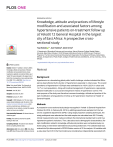 PLOS ONE RESEARCH ARTICLE Knowledge, attitude and practices of lifestyle modification and associated factors among hypertensive patients on-treatment follow up at Yekatit 12 General Hospital in the largest city of East Africa: A prospective crosssectional study a1111111111 a1111111111 a1111111111 a1111111111 a1111111111 Taye Kebede ID1*, Zaid Taddese2, Abiot Girma3 1 Department of Biomedical Sciences and Immunology, Natural Sciences College, Madda Walabu University, Bale-Robe, Ethiopia, 2 ICAP Ethiopia (International Center for AIDS Care and Treatment Programs), The Non-Governmental and Development Organization Home-Based in Ethiopia, Addis Ababa, Ethiopia, 3 Department of Public Health, College of Health Sciences and Medicine, Jimma University, Jimma, Ethiopia * tayekebede2012@gmail.com, taye.kebede@aau.edu.et OPEN ACCESS Citation: Kebede T, Taddese Z, Girma A (2022) Knowledge, attitude and practices of lifestyle modification and associated factors among hypertensive patients on-treatment follow up at Yekatit 12 General Hospital in the largest city of East Africa: A prospective cross-sectional study. PLoS ONE 17(1): e0262780. https://doi.org/ 10.1371/journal.pone.0262780 Editor: Tariq Jamal Siddiqi, The University of Mississippi Medical Center, UNITED STATES Received: June 30, 2021 Accepted: December 20, 2021 Published: January 27, 2022 Copyright: © 2022 Kebede et al. This is an open access article distributed under the terms of the Creative Commons Attribution License, which permits unrestricted use, distribution, and reproduction in any medium, provided the original author and source are credited. Data Availability Statement: All relevant data are within the paper. Funding: The author(s) received no specific funding for this work. Competing interests: The authors have declared that no competing interests exist. Abbreviations: AU, Africa Union; BMI, Body Mass Index; BP, Blood Pressure; CI, Confidence Interval; Abstract Background Hypertension is a devastating global public health challenge; studies indicated that Ethiopia has been affected by the burden of hypertension especially in urban areas. The overall prevalence of hypertension in Ethiopia was estimated to be 19.6% (23.5% in urban and 14.7% in rural population). Along with medical management of hypertension, appropriate lifestyle modification is a crucial and inexpensive means of hypertension control. The main purpose of the study was therefore to assess knowledge, attitude and practice of lifestyle modification among patients on follow up for hypertension treatment at Yekatit 12 General Hospital. Methods A prospective cross-sectional study design was applied in Yekatit 12 General Hospital from October 28, 2018, to February 28, 2019, by allotting proportionate samples from the two chronic outpatients departments (OPD). Using single proportion sampling techniques, the study participants were selected and the total sample size calculated was 405. Primarily, clinical measurements were made according to the international standard set to verify true hypertensive patient’s inclusions. Then, data about socio-demographic characteristics, lifestyle modification related to knowledge, attitude and practices were comprehensively collected using an interviewer-administered structured questionnaire. The collected data was entered into Epi-data exported to SPSS Window version of 22 for analysis. All variables with ρ-value less than 0.05 in the final model were considered as independently associated with PLOS ONE | https://doi.org/10.1371/journal.pone.0262780 January 27, 2022 1 / 28 PLOS ONE CVD, Cardio Vascular Disease; DBP, Diastolic Blood Pressure; ECA, The United Nations Economic Commission for Africa; HBP, High Blood Pressure; HTN, Hypertension; ICAP Ethiopia, International Center for AIDS Care and Treatment Programs in Ethiopia; IRB, Institutional Review Board; JU, Jimma University; KAP, Knowledge, Attitude and Practices; MWU, Madda Walabu University; NCDs, Non-Communicable Diseases; OPD, Out Patients Department; SBP, Systolic Blood Pressure; SPSS, Statistical Packaging for Social Science; UN, United Nations; USAID, The United States Agency for International Development; WHO, World Health Organization. Knowledge, attitude and practices of lifestyle modification among hypertensive patients knowledge, attitude and practices of patients’ lifestyle modification. The strength of association was described by Odds Ratio (OR) at the corresponding CI of 95%. Results The overall sampled hypertensive patients as compared to the planned sample size was 95.5% (n = 387), out of which 53.5% (n = 207) was male patients. The mean age was 50 years with a standard deviation of 14.4. The study revealed that 67.7% [95% CI (65.32%, 70.08%)] were knowledgeable; and 54.0% [95% CI (51.34%, 56.6%)] were reported to have favorable attitude towards lifestyle modification. Regarding their practices, 38% [95% CI (19.91%, 57.49%] of the respondents had good practices. Their monthly income [AOR = 2.39, 95% CI (1.12, 5.11)] and duration on-treatment follow up since diagnosed with hypertension [AOR = 4.39, 95% CI (1.20, 16.03)] were independently associated with knowledge. Concerning their damned practices, age [AOR = 7.71, 95% CI (2.4, 24.8)] and knowledge [AOR = 3.94, 95% CI (2.01, 7.72)] were independently associated with the practices. Conclusion Though the encouraging high knowledge status and favourable attitudes towards lifestyle modification among hypertensive patients, the practices are among the lowest findings report in all standards. Hence, older patients, jobless patients, and low-income patients and patients on long-term treatment follow up who were diagnosed with hypertension before 10 years needs special attention and interventions by the country NCDs policy formulators to rise their non-pharmacological practices to control high blood pressure and its consequences. 1. Introduction In recent years, Non-Communicable Diseases (NCDs) are also one of the b