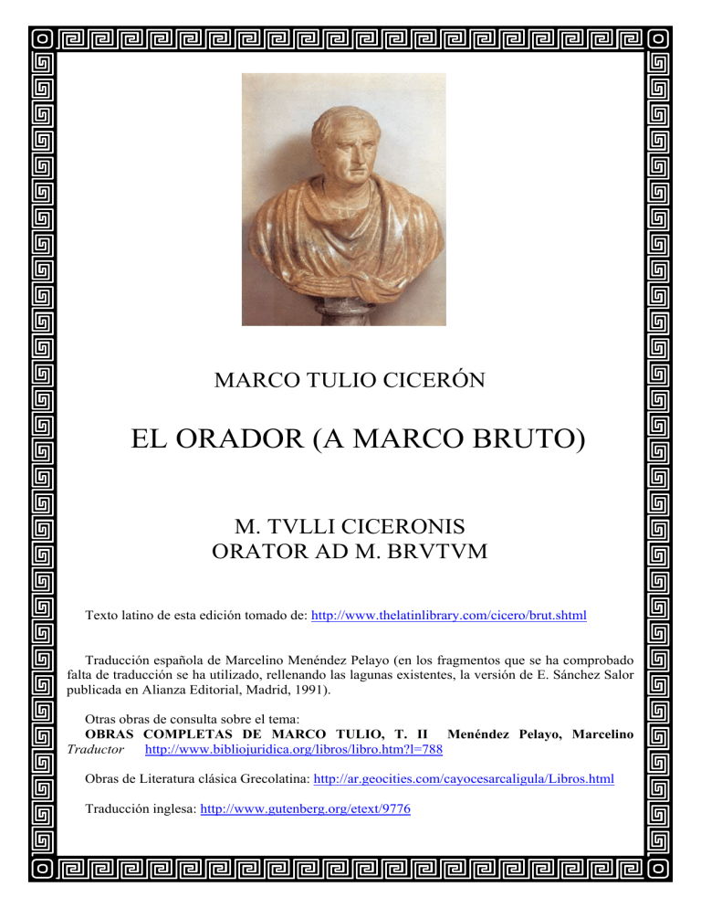 MARCO TULIO CICERÓN EL ORADOR (A MARCO BRUTO) M. TVLLI CICERONIS ORATOR AD M. BRVTVM Texto latino de esta edición tomado de: http://www.thelatinlibrary.com/cicero/brut.shtml Traducción española de Marcelino Menéndez Pelayo (en los fragmentos que se ha comprobado falta de traducción se ha utilizado, rellenando las lagunas existentes, la versión de E. Sánchez Salor publicada en Alianza Editorial, Madrid, 1991). Otras obras de consulta sobre el tema: OBRAS COMPLETAS DE MARCO TULIO, T. II Menéndez Pelayo, Marcelino Traductor http://www.bibliojuridica.org/libros/libro.htm?l=788 Obras de Literatura clásica Grecolatina: http://ar.geocities.com/cayocesarcaligula/Libros.html Traducción inglesa: http://www.gutenberg.org/etext/9776 Marco Tulio Cicerón El orador (a Marco Bruto) 1 EN TORNO AL ORATOR: MODERNIDAD DE CICERÓN En este artículo el autor demuestra que la escuela aticista de Roma no puede ser disociada de este movimiento neo-ático que se dio en Grecia, Asia e Italia en ese siglo. Sus pretensiones eran la imitación del arte ático en su pureza original, estableciendo los modelos que debían ser seguidos. 1. Composición del tratado: su estructura En el año 46 a. C., apartado Cicerón de la vida pública en un retiro forzoso bajo la dictadura de César, escribe entre otras dos obras fundamentales sobre teoría retórica: el Brutus y el Orator, que junto con el De oratore, publicado nueve años antes, en el 55, constituyen la trilogía fundamental en la teoría ciceroniana de la elocuencia. Si en el De oratore había compuesto un diálogo a la manera aristotélica donde plasmar sus planteamientos sobre la mejor educación y cultura del orador, y en el Brutus realiza un inteligente repaso a la oratoria romana, analizando sus principales figuras, en esta tercera obra intenta indagar cuál es el orador ideal (en el sentido platónico). Pero al mismo tiempo la redacción de esta obra obedecía a motivos más prácticos e inmediatos. La corriente estética aticista, que había recorrido Grecia, Asia e Italia en el siglo I a. C. y que se había manifestado tanto en las artes plásticas como en las literarias, amenazaba con imponerse en la oratoria romana 1 . Los aticistas propugnaban una elocuencia caracterizada por la sobriedad y la selección de los modelos y sus acerbas críticas al estilo del Arpinate nos son conocidas gracias al testimonio de Quintiliano 2 . En lugar de una diatriba contra sus detractores, Cicerón escribió un tratado en el que defendía su estilo y sobre todo definía aquello que más lo caracterizaba, el ritmo en prosa 3 ; además, la obra debe entenderse también como un intento de convencer al dedicatario, Bruto, buen amigo de Cicerón y al que éste veía como su posible sucesor en la oratoria romana, de que abandonase la escuela aticista y acogiese una prosa más elaborada y con mayor fuerza, aunque sus esfuerzos en este sentido fueron vanos 4 . La obra ha sido acusada en numerosas ocasiones de anarquía compositiva. A ello han contribuido en gran medida las frecuentes repeticiones del texto, en el que incluso se pueden hallar varias introducciones. Una explicación ingeniosa y elaborada a la aparente desorganización de este tratado fue propuesta por Remigio Sabbadini 5 . De los 236 parágrafos en que se divide la obra, los 97 últimos (140-236) corresponden a la teoría del ritmo en prosa, y por lo tanto constituyen una pieza aparte dentro de la estructura general. Según Sabbadini, si dividimos los primeros 139 en seis fragmentos 6 y se suprimen los pares nos encontramos con que se eliminan las contradicciones y repeticiones; estas tres partes encajarían perfectamente en una hipotética carta a Bruto que constituiría la primera redacción de la obra. Posteriormente Cicerón habría añadido los otros fragmentos para elaborar así un tratado sobre el mejor estilo oratorio; el ensamblaje de distintas redacciones o la inclusión de nuevos temas habría originado la aparente desorganización estructural. Esta teoría resulta atractiva y por ello ha gozado de crédito durante 1 Cf. Desmouliez, A., «Sur la polémique de Cicéron et des atticistes», Revue des Études Latines, 30 (1952) Quintiliano (Inst. orat., XII, 10, 12) dice a propósito de la opinión que los aticistas tenían de Cicerón: «tumidiorem et Asianum et redundantem et in repetitionibus nimium et in salibus aliquando frigidum et in compositione fractum, exultantem ac paene, quod procul absit, uiro molliorem». 3 G.M.A. Grube (The Greek and Roman Critics, London 1924, p.184) ha puesto de relieve que se debe entender el Orator como una defensa de Cicerón ante los ataques de los aticistas y que en este sentido hay que comprender la extensa discusión sobre la prosa rítmica. 4 Así se lo comenta Cicerón a Ático (Ad Att., XIV, 20, 3): «Cum ipsius precibus paene adductus scripsissem ad eum de optimo genere dicendi, non modo mihi sed etiam tibi scripsit sibi illud quod mihi placeret non probari». 5 En «La composizione dell’Orator ciceroniano», Rivista di Filologia e d’Istruzione Classica, 44 (1916) 1-22. 6 Que serían: I=§§ 3-19; II=§§ 20-35; III=§§ 36-42; IV=§§ 43-68; V=§§ 69-111; VI=§§ 112-139. 2 Marco Tulio Cicerón El orador (a Marco Bruto) 2 mucho tiempo, siendo recogida por la mayoría de editores del Orator 7 . Pero recientemente Sánchez Salor 8 ha puesto de relieve ciertas incongruencias en la argumentación de Sabbadini. En primer lugar, ha demostrado que el hilo conductor de la obra es doble: por un lado el concepto de decorum, por otro, la crítica a los neoáticos. Las partes eliminadas en la supuesta primera redacción evitan, es cierto, muchas repeticiones, pero también gran parte de los elementos que suponen la polémica con los neoáticos, con lo que uno de dichos hilos conductores queda truncado. Pero sobre todo lo que le parece inaceptable son ciertas agrupaciones y ciertos cortes, como el hecho de que una parte, la segunda, termine con una dedicatoria