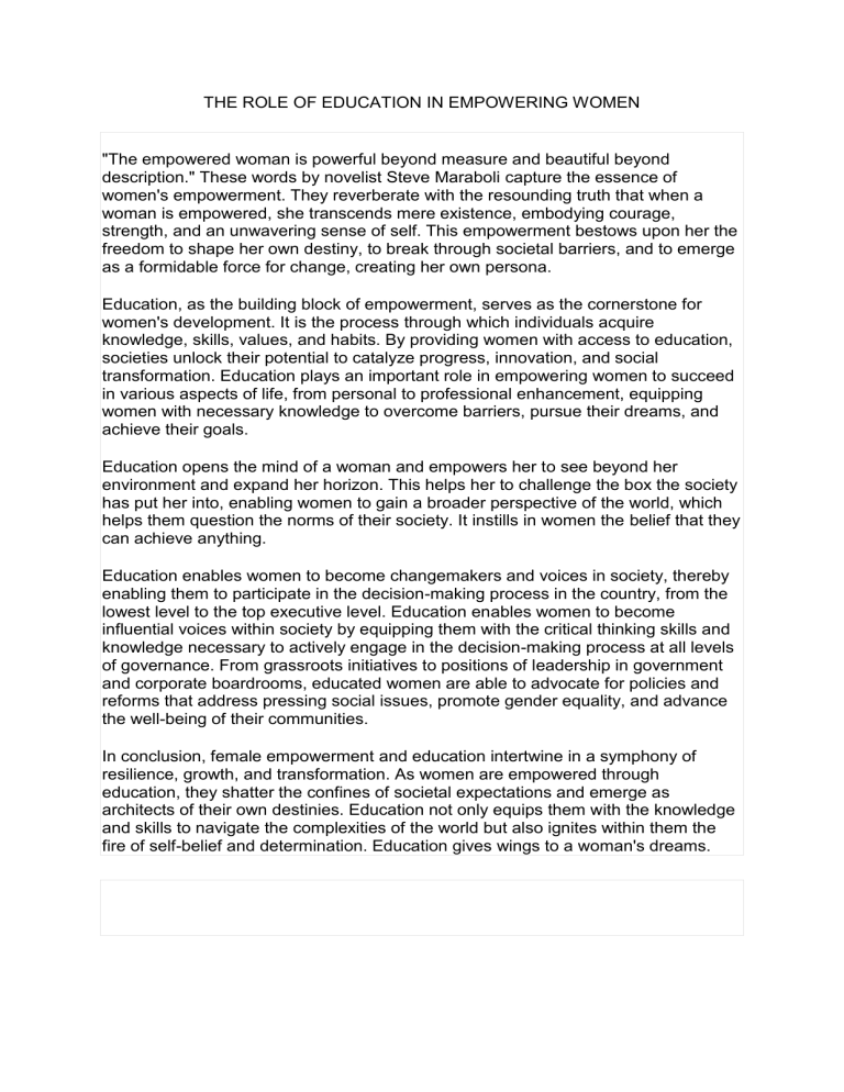 THE ROLE OF EDUCATION IN EMPOWERING WOMEN "The empowered woman is powerful beyond measure and beautiful beyond description." These words by novelist Steve Maraboli capture the essence of women's empowerment. They reverberate with the resounding truth that when a woman is empowered, she transcends mere existence, embodying courage, strength, and an unwavering sense of self. This empowerment bestows upon her the freedom to shape her own destiny, to break through societal barriers, and to emerge as a formidable force for change, creating her own persona. Education, as the building block of empowerment, serves as the cornerstone for women's development. It is the process through which individuals acquire knowledge, skills, values, and habits. By providing women with access to education, societies unlock their potential to catalyze progress, innovation, and social transformation. Education plays an important role in empowering women to succeed in various aspects of life, from personal to professional enhancement, equipping women with necessary knowledge to overcome barriers, pursue their dreams, and achieve their goals. Education opens the mind of a woman and empowers her to see beyond her environment and expand her horizon. This helps her to challenge the box the society has put her into, enabling women to gain a broader perspective of the world, which helps them question the norms of their society. It instills in women the belief that they can achieve anything. Education enables women to become changemakers and voices in society, thereby enabling them to participate in the decision-making process in the country, from the lowest level to the top executive level. Education enables women to become influential voices within society by equipping them with the critical thinking skills and knowledge necessary to actively engage in the decision-making process at all levels of governance. From grassroots initiatives to positions of leadership in government and corporate boardrooms, educated women are able to advocate for policies and reforms that address pressing social issues, promote gender equality, and advance the well-being of their communities. In conclusion, female empowerment and education intertwine in a symphony of resilience, growth, and transformation. As women are empowered through education, they shatter the confines of societal expectations and emerge as architects of their own destinies. Education not only equips them with the knowledge and skills to navigate the complexities of the world but also ignites within them the fire of self-belief and determination. Education gives wings to a woman's dreams.