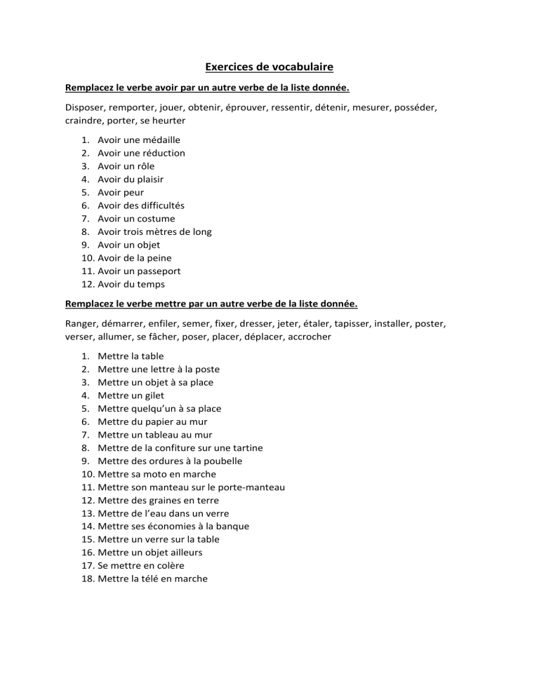 Exercices de vocabulaire Remplacez le verbe avoir par un autre verbe de la liste donnée. Disposer, remporter, jouer, obtenir, éprouver, ressentir, détenir, mesurer, posséder, craindre, porter, se heurter 1. Avoir une médaille 2. Avoir une réduction 3. Avoir un rôle 4. Avoir du plaisir 5. Avoir peur 6. Avoir des difficultés 7. Avoir un costume 8. Avoir trois mètres de long 9. Avoir un objet 10. Avoir de la peine 11. Avoir un passeport 12. Avoir du temps Remplacez le verbe mettre par un autre verbe de la liste donnée. Ranger, démarrer, enfiler, semer, fixer, dresser, jeter, étaler, tapisser, installer, poster, verser, allumer, se fâcher, poser, placer, déplacer, accrocher 1. Mettre la table 2. Mettre une lettre à la poste 3. Mettre un objet à sa place 4. Mettre un gilet 5. Mettre quelqu’un à sa place 6. Mettre du papier au mur 7. Mettre un tableau au mur 8. Mettre de la confiture sur une tartine 9. Mettre des ordures à la poubelle 10. Mettre sa moto en marche 11. Mettre son manteau sur le porte-manteau 12. Mettre des graines en terre 13. Mettre de l’eau dans un verre 14. Mettre ses économies à la banque 15. Mettre un verre sur la table 16. Mettre un objet ailleurs 17. Se mettre en colère 18. Mettre la télé en marche