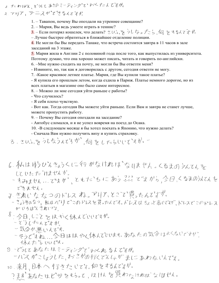 1. – Тавапон, почему Вы опоздали на утреннее совещание? 2. – Мария, Вы ведь умеете играть в теннис? 3. – Если потерял кошелек, что делать? – Лучше быстрее обратиться в ближайшее отделение полиции. 4. Не могли бы Вы передать Танаке, что встреча состоится завтра в 11 часов в зале заседаний на 3 этаже. 5. Мария жила в Англии 2 с половиной года после того, как выпустилась из университета. Поэтому думаю, что она хорошо может писать, читать и говорить по-английски. 6. –Мне нужно сходить на почту, не могли бы Вы отвезти меня? - Извините, но, так как я договорилась с другом, сегодня отвезти не могу. 7. -Какое красивое летнее платье. Мария, где Вы купили такое платье? - Я купила его прошлым летом, когда ездила в Париж. Платье немного дорогое, но из всех платьев в магазине оно было самое интересное. 8. – Можно ли мне сегодня уйти раньше с работы? - Что случилось? - Я себя плохо чувствую. - Вот как. Тогда сегодня Вы можете уйти раньше. Если Вам и завтра не станет лучше, можете пропустить работу. 9. – Почему Вы сегодня опоздали на заседание? - Автобус сломался, и я не успел вовремя на поезд до Осака. 10. -В следующем месяце я бы хотел поехать в Японию, что нужно делать? - Сначала Вам нужно получить визу и купить страховку.