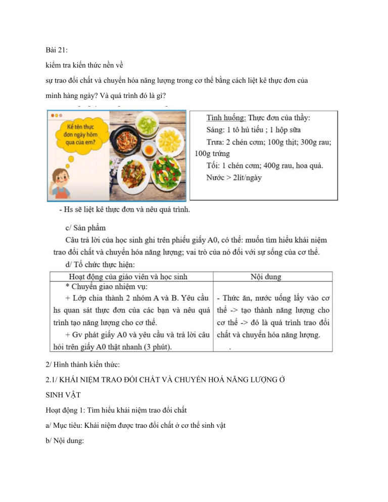 Bài 21: kiểm tra kiến thức nền về sự trao đổi chất và chuyển hóa năng lượng trong cơ thể bằng cách liệt kê thực đơn của mình hàng ngày? Và quá trình đó là gì? 2/ Hình thành kiến thức: 2.1/ KHÁI NIỆM TRAO ĐỔI CHẤT VÀ CHUYỂN HOÁ NĂNG LƯỢNG Ở SINH VẬT Hoạt động 1: Tìm hiểu khái niệm trao đổi chất a/ Mục tiêu: Khái niệm được trao đổi chất ở cơ thể sinh vật b/ Nội dung: - GVchia HS trong lớp thành bốn nhóm. Học sinh làm việc nhóm cặp đôi nghiên cứu thông tin trong SGK, quan sát hình ảnh tìm hiểu sự trao đổi chất ở cơ thể và trả lời các câu hỏi sau: H1/ Quan sát hình 22.1 trong SGK: a) Cơ thể người lấy những chất gì từ môi trường và thải những chất gì ra khỏi cơ thể? b) Các chất được lấy từ môi trường được sử dụng để làm gì? c) Trao đổi chất ở sinh vật gồm những quá trình nào? d) Thế nào là trao đổi chất? H2/ Quá trình nào sau đây thuộc trao đổi chất ở sinh vật? a) Phân giải protein trong tế bào. b) Bài tiết mồ hôi. c) Vận chuyển thức ăn từ miệng xuống dạ dày. d) Lấy carbon dioxide và thải oxygen ở thực vật. H3/ Thế nào là quá trình chuyển hoá các chất trong tế bào? Cho ví dụ Hoạt động 2: Tìm hiểu khái niệm chuyển hoá năng lượng a/ Mục tiêu: Khái niệm được chuyển hóa năng lượng ở cơ thể sinh vật b/ Nội dung: - Quang năng -> Hoá năng: ......................... - Điện năng -> Nhiệt năng: .......................... - Hoá năng -> Nhiệt năng: ......................... - Điện năng -> Cơ năng: .......................... b/ Điện năng -> Nhiệt năng: (ngoài cơ thể). c/ Hoá năng -> Nhiệt năng: (trong cơ thể). d/ Điện năng -> Cơ năng: (ngoài cơ thể) 2/ VAI TRÒ CỦA TRAO ĐỔI CHẤT VÀ CHUYỂN HÓA NĂNG LƯỢNG TRONG CƠ THỂ Hoạt động 3: Tìm hiểu vai trò của trao đổi chất và chuyển hoá năng lượng trong cơ thể. a/ Mục tiêu: Nêu được vai trò của trao đổi chất và chuyển hóa năng lượng trong cơ thể. b/ Nội dung PHIẾU HỌC TẬP SỐ 1 1/ Quan sát hình 22.1 trong SGK: a/ Cơ thể người lấy những chất gì từ môi trường và thải những chất gì ra khỏi cơ thể?........................................................................................................................... b/ Các chất được lấy từ môi trường được sử dụng để làm gì? ................................................................................................................................... c/ Trao đổi chất ở sinh vật gồm những quá trình nào? ................................................................................................................................... d/ Thế nào là trao đổi chất? ................................................................................................................................... 2/ Quá trình nào sau đây thuộc trao đổi chất ở sinh vật? a/ Phân giải protein trong tế bào -> ........................ b/ Bài tiết mồ hôi -> ............................... c/ Vận chuyển thức ăn từ miệng xuống dạ dày -> ................................. d/ Lấy carbon dioxide và thải oxygen ở thực vật -> ............................. 3/ Thế nào là quá trình chuyển hoá các chất trong tế bào? Cho ví dụ. ................................................................................................................................... ................................................................................................................................... PHIẾU HỌC TẬP SỐ 2 H4/ Thế nào là chuyển hoá năng lượng? ................................................................................................................................... H5/ Sự biến đổi nào sau đây là chuyển hoá năng lượng trong cơ thể sinh vật? - Quang năng -> Hoá năng: ......................... - Điện năng -> Nhiệt năng: .......................... - Hoá năng -> Nhiệt năng: ......................... - Điện năng -> Cơ năng: .......................... PHIẾU HỌC TẬP SỐ 3 H6/ Quá trình trao đổi chất và chuyển hoá năng lượng có vai trò gì đối với cơ thể sinh vật? Cho ví dụ. ................................................................................................................................... ................................................................................................................................... ................................................................................................................................... Recommended for you Document continues below 22 ĐỀ CƯƠNG TÁC PHẨM VĂN 12 ewefwefwefwefwgwgergergergreeeeeeeeeeeeeeeeeeeeeeeggggggggggggggggggggggggggggggg ggggggggggggggggggPhùng, toán học 100%(17) 7 [thuvientoan.net] Đinh ̣ lý Reim toán học 100%(5) 16 MOT SO CONG THUC SINH HOC Nguyen PHAN LOP 10 toán học 90%(10) 5 Vũ Nương - bài văn cảm nhận về nhân vật Vũ Nương và Trương Sinh trong tác phẩm "Chuyện toán học 100%(3) 3 CHỦ ĐỀ SỐ HỌC 2022 - Phi hàm Euler toán học 100%(2) 1 Hàm chuẩn hóa string C++ toán học 100%(2) - Lao động nhẹ: Nhân viên hành chính, các nghề laođộng trí óc, nghề tự do, nội trợ, giáo viên. -Lao động trung bình: Công nhân xây dựng , nông dân,nghề cá, quân nhân, sinh viên. -Lao động nặng. Một số nghề nông nghiệp, công nhâncông nghiệp nặng, nghề mỏ, vận động viên thể thao, quân nhân thời k