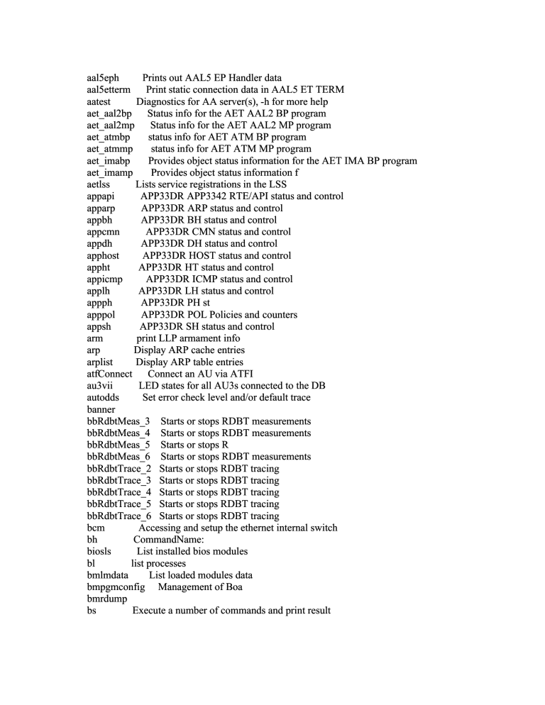 aal5eph Prints out AAL5 EP Handler data aal5etterm Print static connection data in AAL5 ET TERM aatest Diagnostics for AA server(s) !h for more help aet"aal#$p %tatus info for the AET AAL# &P program aet"aal#mp %tatus info for the AET AAL# MP program aet"atm$p status info for AET ATM &P program aet"atmmp status info for AET ATM MP program aet"ima$p Provides o$'ect status information for the AET MA &P program aet"imamp Provides o$'ect status information f aetlss Lists service registrations in the L%% appapi APPDR APP*# RTE+AP status and control apparp APPDR ARP status and control app$h APPDR &H status and control appcmn APPDR ,M- status and control appdh APPDR DH status and control apphost APPDR H.%T status and control appht APPDR HT status and control appicmp APPDR ,MP status and control applh APPDR LH status and control appph APPDR PH st apppol APPDR P.L Policies and counters appsh APPDR %H status and control arm print LLP armament info arp Displa/ ARP cache entries arplist Displa/ ARP ta$le entries atf,onnect ,onnect an A0 via AT1 auvii LED states for all A0s connected to the D& autodds %et error chec2 level and+or default trace $anner $$Rd$tMeas" %tarts or stops RD&T measurements $$Rd$tMeas"* %tarts or stops RD&T measurements $$Rd$tMeas"5 %tarts or stops R $$Rd$tMeas"3 %tarts or stops RD&T measurements $$Rd$tTrace"# %tarts or stops RD&T tracing $$Rd$tTrace" %tarts or stops RD&T tracing $$Rd$tTrace"* %tarts or stops RD&T tracing $$Rd$tTrace"5 %tarts or stops RD&T tracing $$Rd$tTrace"3 %tarts or stops RD&T tracing $cm Accessing and setup the ethernet internal s4itch $h ,ommand-ame $iosls List installed $ios modules $l list processes $mlmdata List loaded modules data $mpgmconfig Management of &oa $mrdump $s E6ecute a num$er of commands and print result $uffel Displa/ $uffel configuration and usage $vl7 8et value from &9L: &9L"AREA default name if no area!name capi cat cop/ files to stdout cease cease ::: chcmeasf4trace %elective Tracing for measurements in ,hcMeas14&lu ch2ds2 Re7uest a chec2dis2 on given volume chmod change access mode of files cls clear screen (using A-% codes) connfss This command has $een di cp cop/ files: f multiple names are given the last name must $e a director/: .ption !R means recursive: cpridump Dumps related info on all non!idle ,PR lin2s: create.$' ,reates an o$'ect: csti csti ! csti %erver status cv ,onfiguration version command dda %end DDA command delete.$' Delete an o$'ect: devinfo Displa/ real and virtual device info disa$le&PArestart"; Disa$les the Restart &oard Procedure (-o dumpsno stopping of DPs and no $oard $ oard restart) disa$le&PArestart"# Disa$les the Restart &oard Procedure (-o dumpsno stopping of DPs and no $oard $ oard restart) disa$le&PArestart" Disa$les the Restart &oard Procedure (-o dumpsno stopping of DPs and no $oard $ oard restart) disa$le&PArestart"* Disa$les the Restart &oard Procedure (-o dumpsno stopping of DPs and no $oard $ oard restart) disa$le&PArestart"5 Disa$les the Restart &oard Procedure (-o dumpsno stopping of DPs and no $oard $ oard restart) disa$le&PArestart"3 Disa$les the Restart &oard Proc of DPs and no $oard $ oard restart) disa$le,&,restart"; Disa$les the Restart &oard Procedure (Dump stop and no $oa rd restart) disa$le,&,restart"# Disa$les the Restart &oard Procedure (Dump stop and no $oa rd restart) disa$le,&,restart" Disa$les the Restart &oard Procedure (Dump stop and no $oa rd restart) disa$le,&,restart"* Disa$les the Restart &oard Procedure (Dump stop and no $oa rd restart) disa$le,&,restart"5 Disa$les the Restart &oard Procedure (Dump stop and no $oa rd restart) disa$le,&,restart"3 Disa$les the Restart &oard Procedure (Dump stop and no $oa rd restart) domlist list all regions in one+all domain(s) optionall/ sho4ing used p h/sical memor/ fragments: dp%etMemDumpAreas %et user memor/ area to $e dumped for <snid= dpcmd"; E6ecutes a list of commands dpcmd"# E6ecutes a list of commands dpcmd" E6ecutes a list of commands dpcmd"* E6ecutes a list of commands dpcmd"5 E6ecutes a list of commands dpcmd"3 E6ecutes a list of dspMem,hange >rite D%P Memor/ dspMemDump Read D%P Memor/ dsp"nmi trigger -M for D%P 4ith given snid num$er dspload Load is presented as mean ?min ma6@ ::: dspmem Memor/ is presented as Pool; Pool# ::: dspstat This command prints statistics counters and states from the D%P: duil1aultn'ect n'ects a fault to %R.! &, duil.penTestPort Activate %R. test ports dump Print a post mortem dump:%ee dump !h for more options: dumpcap dumps .AM P!communi dumpecncr Dumping Ec-cr-ode,onfigurationRepositor/(-,R) component residing at MP%>!E, level dumpelg dumpelg 4ill print the error and repair logs to screen dumph dump heap info or list all heaps echo echo arguments (!n no ne4line) ecodes List the entries in the error code log: efcdump filter B anpCgdlCgulCoilCrfcCsu$Ct6mCall efhreset resetLea2/&uc2et component residing at MP%>!E, level eraseh4log eraseh4log 4ill erase all h4 error logs in flash ero Ero commands errno print description of errno num$er errorlist Print all registrered error codes: ethernet ethernet shell command ethmode Ethernet speed+duple6 control cmds ethtraceroute Determine the the P net4or2 route to a specified destination destination fault fault ::: file Displa/ and manage o$'ects in #nd files/stem: flcdr 1L,DR status and control format format local flash volume formathd 1ormat the Hard Dis2 fssls list fss o$'ects ftl 1lash Translation La/er commands getAttr.$' 8et attri$utes for an o$'ect: getDis2Data.$' 8et attri$utes for dis2 for for an o$'ect: getProcessorLoad 8et processor load for a P0: get"itdhpmcnt 8et PM counters for for the internal distri$ution handler get"ithostpmcnt 8et PM counters for the internal host getpri This command has $een disa$led g2Drv,md <g2Drv,md = for description hdinfo Hard dis2 parameter information hdpartition chec2s or harmoniFes the dis2 partitions as per ta$le hdreadtest Hard dis2 read test of HD hdstat Hard dis2 statistics printout heapinfo Heap information (for pro
