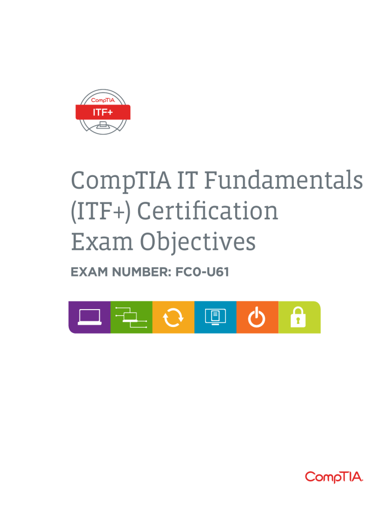 CompTIA IT Fundamentals (ITF+) Certification Exam Objectives EXAM NUMBER: FC0-U61 About the Exam The CompTIA IT Fundamentals (ITF+) FC0-U61 exam will certify the successful candidate has the knowledge and skills required to identify and explain the basics of: • Computing • IT infrastructure • Software development • Database use In addition, candidates will demonstrate their knowledge of: • Installing software • Establishing basic network connectivity • Identifying/preventing basic security risks Further, this exam will assess the candidate’s knowledge in the areas of troubleshooting theory and preventive maintenance of devices. This exam is intended for candidates who are advanced end users, considering a career in IT, and interested in pursuing professional-level certifications, such as A+. Note: This is a pre-professional certification for candidates seeking a career in IT. EXAM DEVELOPMENT CompTIA exams result from subject-matter expert workshops and industry-wide survey results regarding the skills and knowledge required of an entry-level IT professional. CompTIA AUTHORIZED MATERIALS USE POLICY CompTIA Certifications, LLC is not affiliated with and does not authorize, endorse or condone utilizing any content provided by unauthorized third-party training sites (aka “brain dumps”). Individuals who utilize such materials in preparation for any CompTIA examination will have their certifications revoked and be suspended from future testing in accordance with the CompTIA Candidate Agreement. In an effort to more clearly communicate CompTIA’s exam policies on use of unauthorized study materials, CompTIA directs all certification candidates to the CompTIA Certification Exam Policies. Please review all CompTIA policies before beginning the study process for any CompTIA exam. Candidates will be required to abide by the CompTIA Candidate Agreement. If a candidate has a question as to whether study materials are considered unauthorized (aka “brain dumps”), he/she should contact CompTIA at examsecurity@comptia.org to confirm. PLEASE NOTE The lists of examples provided in bulleted format are not exhaustive lists. Other examples of technologies, processes or tasks pertaining to each objective may also be included on the exam although not listed or covered in this objectives document. CompTIA is constantly reviewing the content of our exams and updating test questions to be sure our exams are current and the security of the questions is protected. When necessary, we will publish updated exams based on existing exam objectives. Please know that all related exam preparation materials will still be valid. CompTIA IT Fundamentals (ITF+) Certification Exam Objectives Version 3.0 (Exam Number: FC0-U61) TEST DETAILS Required exam FCO-U61 Number of questions 75 Type of questions Multiple choice Length of test 60 minutes Recommended experience No prior experience necessary Passing score 650 (on a scale of 900) EXAM OBJECTIVES (DOMAINS) The table below lists the domains measured by this examination and the extent to which they are represented. DOMAIN PERCENTAGE OF EXAMINATION 1.0 IT Concepts and Terminology 2.0 Infrastructure 3.0 Applications and Software 4.0 Software Development 5.0 Database Fundamentals 6.0 Security Total 17% 22% 18% 12% 11% 20% 100% CompTIA IT Fundamentals+ (ITF+) Certification Exam Objectives Version 3.0 (Exam Number: FCO-U61) 1.0 IT Concepts and Terminology 1.1 Compare and contrast notational systems. • Binary • Hexadecimal • Decimal 1.2 Compare and contrast fundamental data types and their characteristics. • Char • Strings 1.3 • Numbers - Integers - Floats • Boolean Illustrate the basics of computing and processing. • Input • Processing 1.4 • Data representation - ASCII - Unicode • Output • Storage Explain the value of data and information. • Data and information as assets • Importance of investing in security • Relationship of data to creating information • Intellectual property - Trademarks - Copyright - Patents • Digital products CompTIA IT Fundamentals+ (ITF+) Certification Exam Objectives Version 3.0 (Exam Number: FC0-U61) • Data-driven business decisions - Data capture and collection - Data correlation - Meaningful reporting 1.0 IT Concepts and Terminology 1.5 Compare and contrast common units of measure. • Storage unit - Bit - Byte - KB - MB - GB 1.6 - TB - PB • Throughput unit - bps - Kbps - Mbps Explain the troubleshooting methodology. • Identify the problem - Gather information - Duplicate the problem, if possible - Question users - Identify symptoms - Determine if anything has changed - Approach multiple problems individually • Research knowledge base/ Internet, if applicable • Establish a theory of probable cause - Question the obvious - Consider multiple approaches - Divide and conquer • Test the theory to determine the cause - Once the theory is confirmed (confirmed root cause), determine the next steps to resolve the problem - If the theory is not confirmed, establish a new theory or escalate • Establish a plan of action to resolve the problem and identify potential effects • Implement the solution or escalate as necessary • Verify full system functionality and, if applicable, implement preventive measures • Document findings/lessons learned, actions, and outcomes CompTIA IT Fundamentals+ (ITF+) Certification Exam Objectives Version 3.0 (Exam Number: FC0-U61) - Gbps - Tbps • Processing speed - MHz - GHz 2.0 Infrastructure 2.1 Classify common types of input/output device interfaces. • Networking - Wired - Telephone connector (RJ-11) - Ethernet connector (RJ-45) - Wireless - Bluetooth - NFC 2.2 - Camera - External hard drive - Speakers - Display • Installation types - Plug-and-play vs. driver installation - Other required steps - IP-based peripherals - Web-based configuration steps Explain the purpose of common internal computing components. • Motherboard/system board • Firmware/BIOS