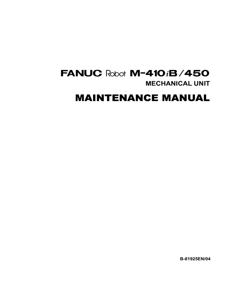 FANUC > M-410i B/450 MECHANICAL UNIT MAINTENANCE MANUAL B-81925EN/04 Before using the Robot, be sure to read the "FANUC Robot Safety Manual (B-80687EN)" and understand the content. This manual can be used with controllers labeled R-30iA or R-J3iC. If you have a controller labeled R-J3iC, you should read R-30iA as R-J3iC throughout this manual. • No part of this manual may be reproduced in any form. • All specifications and designs are subject to change without notice. The products in this manual are controlled based on Japan’s “Foreign Exchange and Foreign Trade Law”. The export from Japan may be subject to an export license by the government of Japan. Further, re-export to another country may be subject to the license of the government of the country from where the product is re-exported. Furthermore, the product may also be controlled by re-export regulations of the United States government. Should you wish to export or re-export these products, please contact FANUC for advice. In this manual we have tried as much as possible to describe all the various matters. However, we cannot describe all the matters which must not be done, or which cannot be done, because there are so many possibilities. Therefore, matters which are not especially described as possible in this manual should be regarded as ”impossible”. B-81925EN/04 1 SAFETY PRECAUTIONS SAFETY PRECAUTIONS For the safety of the operator and the system, follow all safety precautions when operating a robot and its peripheral devices installed in a work cell. s-1 SAFETY PRECAUTIONS 1.1 B-81925EN/04 OPERATOR SAFETY Operator safety is the primary safety consideration. Because it is very dangerous to enter the operating space of the robot during automatic operation, adequate safety precautions must be observed. The following lists the general safety precautions. consideration must be made to ensure operator safety. Careful (1) Have the robot system operators attend the training courses held by FANUC. FANUC provides various training courses. details. Contact our sales office for (2) Even when the robot is stationary, it is possible that the robot is still ready to move state and is waiting for a signal. In this state, the robot is regarded as still in motion. To ensure operator safety, provide the system with an alarm to indicate visually or aurally that the robot is in motion. (3) Install a safety fence with a gate so that no operator can enter the work area without passing through the gate. Equip the gate with an interlock that stops the robot when the gate is opened. The controller is designed to receive this interlock signal. When the gate is opened and this signal received, the controller stops the robot in an emergency. For connection, see Fig.1.1 (a), (b) and (c). (4) Provide the peripheral devices with appropriate grounding (Class 1, Class 2, or Class 3). (5) Try to install the peripheral devices outside the work area. (6) Draw an outline on the floor, clearly indicating the range of the robot motion, including the tools such as a hand. (7) Install a mat switch or photoelectric switch on the floor with an interlock to a visual or aural alarm that stops the robot when an operator enters the work area. (8) If necessary, install a safety lock so that no one except the operator in charge can turn on the power of the robot. The circuit breaker installed in the controller is designed to disable anyone from turning it on when it is locked with a padlock. s-2 SAFETY PRECAUTIONS B-81925EN/04 (9) When adjusting each peripheral device independently, be sure to turn off the power of the robot. Limit swith which operates when the gate is opened. Fig. 1.1 (a) Safety Fence and Safety gate Panel board パネルボード FENCE1 FENCE1 Note) Terminals FENCE1 and FENCE2 are on the PC board in the operator’s panel. FENCE2 FENCE2 Fig. 1.1 (b) Limit switch circuit diaram of the safety fence (For R-J3iB CONTROLLER) Panel board パネルボード EAS1 EAS1 EAS11 EAS11 EAS2 EAS2 Note) Terminals EAS1, EAS11 and EAS2, 21 are on the PC board in the operator’s panel. Refer to the R-30iA CONTROLLER MAINTENANCE MANUAL. EAS21 EAS21 Fig. 1.1 (c) Limit switch circuit diaram of the safety fence (For R-30iA CONTROLLER) s-3 SAFETY PRECAUTIONS 1.1.1 B-81925EN/04 Operator Safety The operator is a person who operates the robot system. In this sense, a worker who operates the teach pendant is also an operator. However, this section does not apply to teach pendant operators. (1) If it is not necessary for the robot to operate, turn off the power of the robot controller or press the EMERGENCY STOP button, and then proceed with necessary work (2) Operate the robot system at a location outside the work area. (3) Install a safety fence with a safety gate to prevent any worker other than the operator from entering the work area unexpectedly and also to prevent the worker from entering a dangerous area. (4) Install an EMERGENCY STOP button within the operator's reach. The robot controller is designed to be connected to an external EMERGENCY STOP button. With this connection, the controller stops the robot operation when the external EMERGENCY STOP button is pressed. See the diagram below for connection. External EMERGENCY STOP button Panel PC board Note) Connect between EMGIN1 and EMGIN 2. Terminals EMGIN1 and EMGIN2 are on the Panel PC board Fig. 1.1.1 (a) Connection Diagram for External Emergency Stop Switch (For R-J3iB CONTROLLER) External EMERGENCY STOP button 外部非常停止スイッチ Panel board パネルボード EES1 EES11 EES2 EES21 Note) Connect between EES1 and EES11 and between EES2 and EES21. (注) EES1-EES11間、 EES2-EES21間に接続します。 Terminals EES1, EES11, EES2 and EES21 are on the Panel EES1,EES11、EES2,EES21はパネルボード上にあり board. ます。 Refer to R-30iA CONTROLLER MAINTENANCE MANUAL. 詳細はR-J3iC制御部保守説明書をご参照下さい。 Fig. 1.1.1 (b) Connection Diagram for External Emergency S