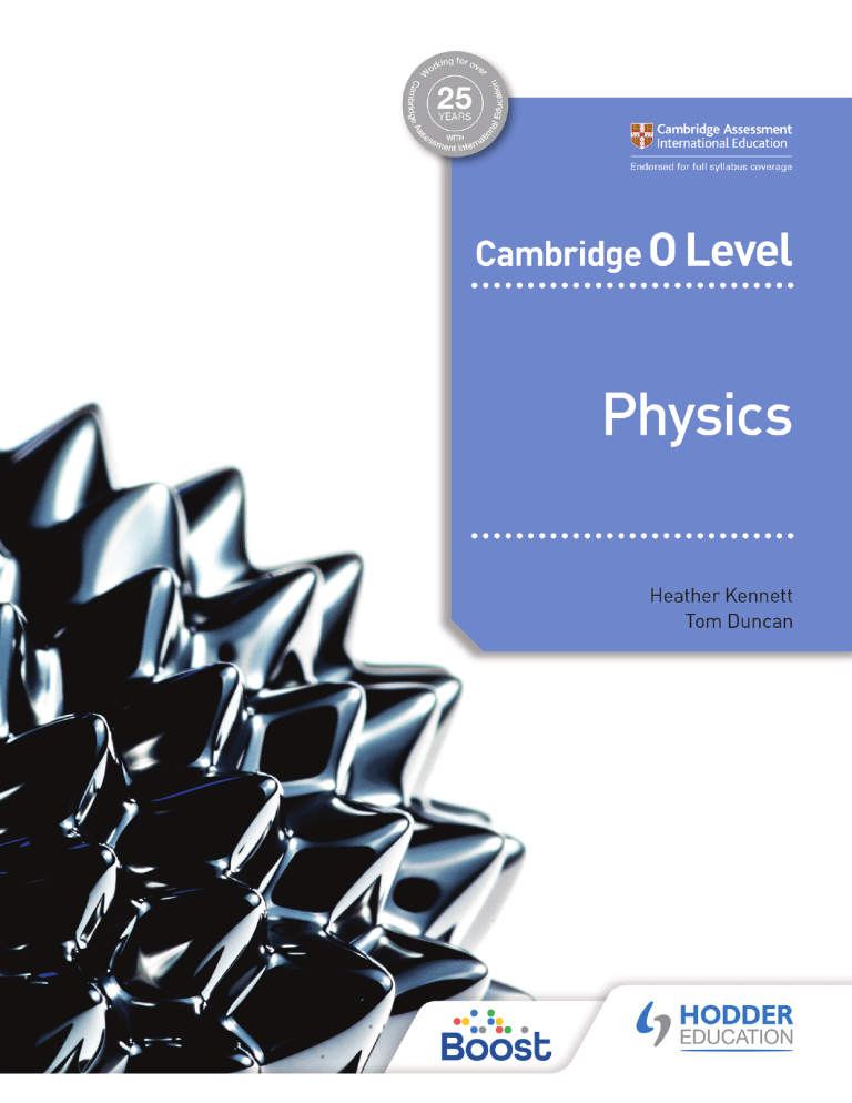 The Cambridge O Level Physics series consists of a Student’s Book and Boost eBook. Cambridge O Level Physics 9781398310605 Cambridge O Level Physics Boost eBook 9781398311015 Cambridge O Level Physics 9781398310605_FM.indd 1 30/03/21 12:15 PM This page intentionally left blank 9781398310605_FM.indd 2 30/03/21 12:15 PM Cambridge O Level Physics Tom Duncan, Heather Kennett 9781398310605_FM.indd 3 30/03/21 12:15 PM Cambridge International copyright material in this publication is reproduced under licence and remains the intellectual property of Cambridge Assessment International Education. Past paper questions reproduced by permission of Cambridge Assessment International Education. Exam-style questions [and sample answers] have been written by the authors. In examinations, the way marks are awarded may be different. References to assessment and/or assessment preparation are the publisher’s interpretation of the syllabus requirements and may not fully reflect the approach of Cambridge Assessment International Education. Cambridge Assessment International Education bears no responsibility for the example answers to questions taken from its past question papers which are contained in this publication. Third-party websites and resources referred to in this publication have not been endorsed by Cambridge Assessment International Education. Although every effort has been made to ensure that website addresses are correct at time of going to press, Hodder Education cannot be held responsible for the content of any website mentioned in this book. It is sometimes possible to find a relocated web page by typing in the address of the home page for a website in the URL window of your browser. We have carried out a health and safety check of this text and have attempted to identify all recognised hazards and suggest appropriate cautions. However, the publishers and the authors accept no legal responsibility on any issue arising from this check; whilst every effort has been made to carefully check the instructions for practical work described in this book, it is still the duty and legal obligation of schools to carry out their own risk assessments for each practical in accordance with local health and safety requirements. For further health and safety information (e.g. Hazcards), please refer to CLEAPSS at www.cleapss.org.uk. Hachette UK’s policy is to use papers that are natural, renewable and recyclable products and made from wood grown in well-managed forests and other controlled sources. The logging and manufacturing processes are expected to conform to the environmental regulations of the country of origin. Orders: please contact Hachette UK Distribution, Hely Hutchinson Centre, Milton Road, Didcot, Oxfordshire, OX11 7HH. Telephone: +44 (0)1235 827827. Email education@hachette.co.uk Lines are open from 9 a.m. to 5 p.m., Monday to Friday. You can also order through our website: www.hoddereducation.com ISBN: 978 1 3983 1060 5 © Tom Duncan and Heather Kennett 2021 First published in 2021 by Hodder Education, An Hachette UK Company Carmelite House 50 Victoria Embankment London EC4Y 0DZ www.hoddereducation.com Impression number 10 9 8 7 6 5 4 3 2 1 Year 2024 2023 2022 2021 All rights reserved. Apart from any use permitted under UK copyright law, no part of this publication may be reproduced or transmitted in any form or by any means, electronic or mechanical, including photocopying and recording, or held within any information storage and retrieval system, without permission in writing from the publisher or under licence from the Copyright Licensing Agency Limited. Further details of such licences (for reprographic reproduction) may be obtained from the Copyright Licensing Agency Limited, www.cla.co.uk Cover photo © Zffoto – stock.adobe.com Illustrations by Fakenham Prepress Solutions, Wearset and Integra Software Services Pvt. Ltd., Pondicherry, India Typeset by Integra Software Services Pvt. Ltd., Pondicherry, India Printed in Slovenia A catalogue record for this title is available from the British Library. 9781398310605_FM.indd 4 30/03/21 12:15 PM Contents How to use this book Using scientific skills 1 Motion, forces and energy 1.1 Physical quantities and measurement techniques 1.2 Motion 1.3 Mass and weight 1.4 Density 1.5 Forces 1.6 Momentum 1.7 Energy, work and power 1.8 Pressure 2 Thermal physics 2.1 Kinetic particle model of matter 2.2 Thermal properties and temperature 2.3 Transfer of thermal energy 3 Waves 3.1 General properties of waves 3.2 Light 3.3 Electromagnetic spectrum 3.4 Sound 4 Electricity and magnetism 4.1 Simple magnetism and magnetic fields 4.2 Electrical quantities 4.3 Electric circuits 4.4 Practical electricity 4.5 Electromagnetic effects 4.6 Uses of an oscilloscope 5 Nuclear physics 5.1 The nuclear model of the atom 5.2 Radioactivity 6 Space physics 6.1 Earth and the Solar System 6.2 Stars and the Universe Mathematics for physics Additional exam-style questions Theory past paper questions Practical Test past paper questions Alternative to Practical past paper questions 9781398310605_FM.indd 5 vii viii 1 2 11 22 26 30 54 59 77 85 86 100 115 127 128 135 159 166 175 176 184 209 222 229 250 253 254 262 277 278 287 295 299 304 320 331 30/03/21 12:15 PM List of equations Symbols and units for physical quantities Glossary Acknowledgements Index 9781398310605_FM.indd 6 338 339 340 349 350 30/03/21 12:15 PM How to use this book To make your study of Physics for Cambridge O Level as rewarding and successful as possible, this textbook, endorsed by Cambridge Assessment International Education, offers the following important features: FOCUS POINTS Each topic starts with a bullet point summary of what you will encounter within each topic. This is followed by a short outline of the topic so that you know what to expect over the next few pages. Test yourself These questions appear regularly throughout the topic so you can check your understanding as you progress. Revision checklist At