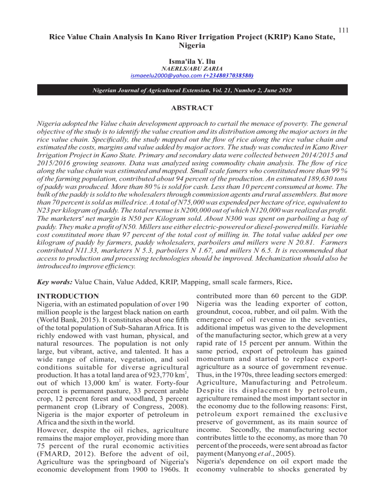 111 Rice Value Chain Analysis In Kano River Irrigation Project (KRIP) Kano State, Nigeria Isma'ila Y. Ilu NAERLS/ABU ZARIA ismaeelu2000@yahoo.com (+2348037038580) Nigerian Journal of Agricultural Extension, Vol. 21, Number 2, June 2020 ABSTRACT Nigeria adopted the Value chain development approach to curtail the menace of poverty. The general objective of the study is to identify the value creation and its distribution among the major actors in the rice value chain. Specifically, the study mapped out the flow of rice along the rice value chain and estimated the costs, margins and value added by major actors. The study was conducted in Kano River Irrigation Project in Kano State. Primary and secondary data were collected between 2014/2015 and 2015/2016 growing seasons. Data was analyzed using commodity chain analysis. The flow of rice along the value chain was estimated and mapped. Small scale famers who constituted more than 99 % of the farming population, contributed about 94 percent of the production. An estimated 189,630 tons of paddy was produced. More than 80 % is sold for cash. Less than 10 percent consumed at home. The bulk of the paddy is sold to the wholesalers through commission agents and rural assemblers. But more than 70 percent is sold as milled rice. A total of N75,000 was expended per hectare of rice, equivalent to N23 per kilogram of paddy. The total revenue is N200,000 out of which N120,000 was realized as profit. The marketers' net margin is N50 per Kilogram sold. About N300 was spent on parboiling a bag of paddy. They make a profit of N50. Millers use either electric-powered or diesel-powered mills. Variable cost constituted more than 97 percent of the total cost of milling in. The total value added per one kilogram of paddy by farmers, paddy wholesalers, parboilers and millers were N 20.81. Farmers contributed N11.33, marketers N 5.3, parboilers N 1.67, and millers N 6.5. It is recommended that access to production and processing technologies should be improved. Mechanization should also be introduced to improve efficiency. Key words: Value Chain, Value Added, KRIP, Mapping, small scale farmers, Rice. INTRODUCTION Nigeria, with an estimated population of over 190 million people is the largest black nation on earth (World Bank, 2015). It constitutes about one fifth of the total population of Sub-Saharan Africa. It is richly endowed with vast human, physical, and natural resources. The population is not only large, but vibrant, active, and talented. It has a wide range of climate, vegetation, and soil conditions suitable for diverse agricultural 2 production. It has a total land area of 923,770 km , out of which 13,000 km2 is water. Forty-four percent is permanent pasture, 33 percent arable crop, 12 percent forest and woodland, 3 percent permanent crop (Library of Congress, 2008). Nigeria is the major exporter of petroleum in Africa and the sixth in the world. However, despite the oil riches, agriculture remains the major employer, providing more than 75 percent of the rural economic activities (FMARD, 2012). Before the advent of oil, Agriculture was the springboard of Nigeria's economic development from 1900 to 1960s. It contributed more than 60 percent to the GDP. Nigeria was the leading exporter of cotton, groundnut, cocoa, rubber, and oil palm. With the emergence of oil revenue in the seventies, additional impetus was given to the development of the manufacturing sector, which grew at a very rapid rate of 15 percent per annum. Within the same period, export of petroleum has gained momentum and started to replace exportagriculture as a source of government revenue. Thus, in the 1970s, three leading sectors emerged: Agriculture, Manufacturing and Petroleum. Despite its displacement by petroleum, agriculture remained the most important sector in the economy due to the following reasons: First, petroleum export remained the exclusive preserve of government, as its main source of income. Secondly, the manufacturing sector contributes little to the economy, as more than 70 percent of the proceeds, were sent abroad as factor payment (Manyong et al., 2005). Nigeria's dependence on oil export made the economy vulnerable to shocks generated by 112 Rice Value Chain Analysis In Kano River Irrigation Project (KRIP) Kano State, Nigeria international oil prices. The collapse of oil prices of the 1980s was the beginning of Nigeria's economic problems. The economy, which was weakened by corruption and mismanagement, sunk into recession (Alkali, 1997). Nigeria's food import bill rose steadily from N2 billion in 1980s to N7 billion in 1990s. In 2010, the imports bill of Wheat, Rice, Sugar and Fish put together, had reached N1.31trillion (FMARD, 2011). Nigeria accounts for nearly a quarter of sub-Saharan Africa's poor (IFAD, 2009). Poverty alleviation and curbing youth unemployment became part of Nigeria's economic development efforts. Several interventions were initiated and implemented. The cumulative effect of which led to an impressive economic growth of about 6.9 percent and an agricultural growth of 8.2 percent (FMAWR, 2008), but failed to reduce poverty and youth unemployment to any appreciable level. By 2010, poverty was by any measure, more severe and devastating than it was thirty years ago (NBS, 2012). This led the Federal Ministry of Agriculture and Rural Development to adopt the value chain approach as the operational strategy for the implementation of the agricultural transformation agenda (ATA) (FMARD, 2011). The value chain approach has gained tremendous acclaim as a tool for addressing poverty problems in developing economies. It does this by focussing on major constraints and opportunities faced not only by farmers, but also by processors, traders and other business operators at multiple levels and points along the value chain. The process not only include more actors, but it also covers wider range of activities such as, facilitating access to inputs, strengthening t