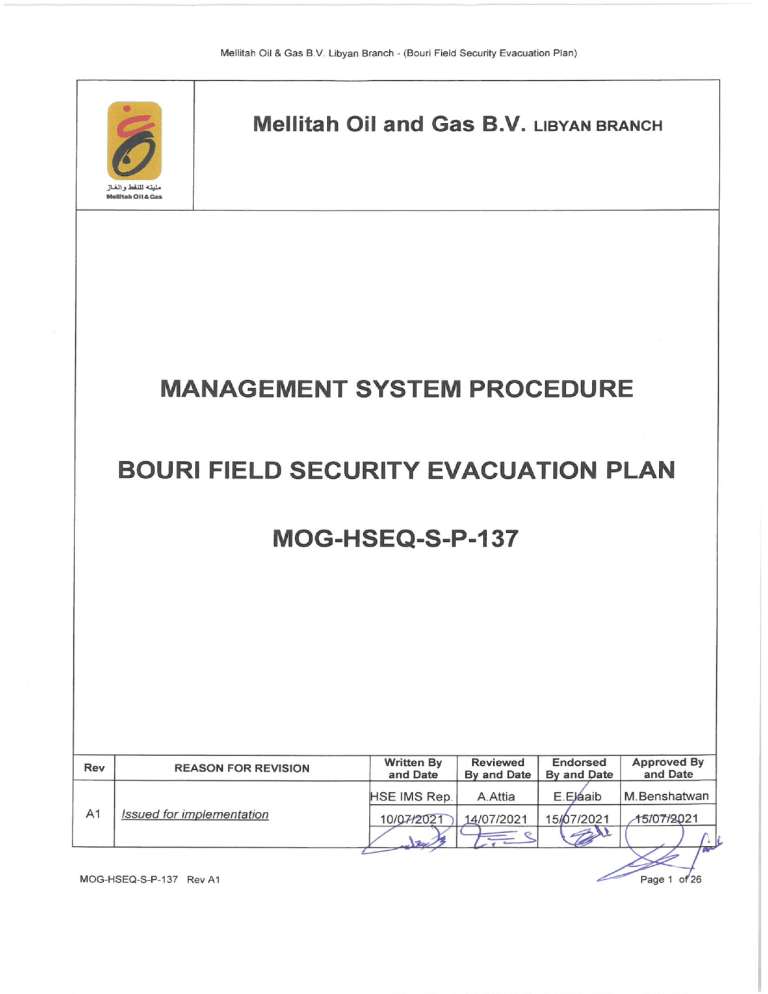Mellitah Oil & Gas B.V. Libyan Branch - (Bouri Field Security Evacuation Plan) Revision History Rev P2 P1 REASON FOR REVISION Written By and Date Reviewed By Endorsed By and Date and Date W.Fandi Abdunasser Attia NA NA 12/06/2021 15/06/2021 - - W.Fandi NA NA NA 12/06/2021 - - - Issued for departmental review Draft MOG-HSEQ-S-P-137 Rev A1 Approved By and Date Page 2 of 26 Mellitah Oil & Gas B.V. Libyan Branch - (Bouri Field Security Evacuation Plan) TABLE OF CONTENT 1 INTRODUCTION ........................................................................................................................................... 5 1.1 OVERVIEW ......................................................................................................................................... 5 1.2 AIM ...................................................................................................................................................... 5 1.3 SCOPE ................................................................................................................................................ 5 1.4 TERMS AND DEFINITIONS ........................................................................................................... 8 1.5 SECURITY ALERT STAGES ......................................................................................................... 9 1.6 TYPE OF EVACUATION ............................................................................................................... 10 2 EVACUATION PLANNING ........................................................................................................................ 11 2.1 INTRODUCTION ............................................................................................................................... 11 2.2 EVACUATION COORDINATION ............................................................................................................ 11 2.3 ROLES AND RESPONSIBILITIES OF THE ERT ................................................................................... 11 2.4 MAINTENANCE OF THE PLAN .............................................................................................................. 13 2.5 EVACUATION TRIGGERS ...................................................................................................................... 13 2.6 EVACUATION DECISION ..................................................................................................................... 14 2.7 EMERGENCY MANAGEMENT SCENARIO ......................................................................................... 14 2.7.1 Draw Down ........................................................................................................................................ 14 2.7.2 Evacuation ................................................................................................................................. 15 2.8 PLATFORMS EMERGENCY MANAGEMENT STRUCTURE ................................................................ 15 2.9 RADAR SURVEILLANCE SYSTEM ........................................................................................................ 17 3 EVACUATION FROM BOURI FIELD PLATFORMS ................................................................................. 18 3.1 EVACUATION STAGES .................................................................................................................... 18 3.2 EVACUATION OPTIONS .................................................................................................................. 18 3.2.1 Primary Option: Air Evacuation ................................................................................................. 18 3.2.2 Secondary Option: Sea Evacuation........................................................................................... 18 4 COORDINATION MEASURES-COMMUNICATIONS ............................................................................... 19 4.1 INITIAL NOTIFICATION .................................................................................................................... 19 4.2 COMMUNICATIONS EQUIPMENT .................................................................................................. 19 4.3 ERT ROSTER.................................................................................................................................... 19 4.4 LOST COMMUNICATION PROCEDURES ...................................................................................... 19 5 COORDINATION OF EXTERNAL SUPPORT ........................................................................................... 19 5.1 COMMERCIAL AVIATION ....................................................................................................................... 19 6 ADMINISTRATIONS .................................................................................................................................. 20 6.1 FINANCE - CONTINGENCY FUNDS ...................................................................................................... 20 6.2 PASSPORTS .......................................................................................................................................... 20 6.3 MANDATORY EVACUATION EQUIPMENT ........................................................................................... 20 7 USEFUL CONTACTS ................................................................................................................................ 21 7.5 EXPATRIATE PERSONNEL ................................................................................................................... 23 ANNEX .............................................................................................................................................................. 24 ANNEX 1: EVACUATION CONTACT LIST................................................................................................. 24 ANNEX 2: BOURI 