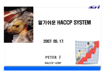 알기쉬운 HACCP SYSTEM 2007. 05. 17. PETER J HACCP-GMP 한국식품정보원 1 주요 목 차 기업의 정의 SYSTEM 활동의 원류관리 HACCP목적과 추진의미 HACCP System의 학술적 근거와 추진의지 HACCP SYSTEM 이란 HACCP 추진 목표 & 필요성 HACCP SYSTEM 고시해설 HACCP System 적용 추진절차 선행요건 추진의 이해 HACCP 구축 절차 알기쉬운 HACCP SYSTEM 결론 한국식품정보원 2 기업(제조활동)이란 무엇인가 ? 기업의 경영 목표 이익창출 = 이윤의 극대화 기업의 존재 가치 제품(기업활동)을 통해 21C 인류생활을 풍요롭게 하기 위한 기여 ★일본 토요다 사 의 이념★ 『지구와 인류에 공헌하는 차 만들기』 한국식품정보원 3 SYSTEM 활동의 원류관리 IN-PUT Man Machine 기업 MANAGEMENT SKILL 생산활동 OUT-PUT Productivity Quality Material SYSTEM활동 Method HACCP-GMP-5S Delivery Market 변환과정 Safety Morale Money 기업 생산혁신의 역활 한국식품정보원 Cost Environment 4 HACCP 추진 의미 습관화 MIND 혁신 – 의식의 전환 부정적 → 긍정적 사고 교육 : 모르는 것을 알게 가르치는것 한국식품정보원 행동혁신 – 실천적 변화 수동적 → 능동적 실천 훈련 : 이미 알고있는 사실(원칙) 을 반복 실천 하는 것 5 생산혁신(HACCP) 활동의 학술적 근거 ⇒ 원점으로 돌아가기 위한 운동 : 기본 & 원칙의 준수 이 원 론 리 기 불 본 변 공통 기술 고유 기술 원 칙 원 칙 약 약 속 속 관리 기술 한국식품정보원 6 HACCP 추진 의지 習 得 體 得 骨 得 血 得 한국식품정보원 7 HACCP System 이란? A FOOD SAFETY HACCP RISK MANAGEMENT SYSTEM 한국식품정보원 8 HACCP System이란? Hazard Analysis and Critical Control Point [ 식 품 위 해 요 소 중 점 관 리 기 준 ] 식품의 원재료부터 제조, 가공, 보존, 유통, 조리단계를 거쳐 최종소비자가 섭취하기 전까지의 각 단계에서 발생할 우려가 있는 위해요소를 규명하고, 이를 중점적으로 관리하기 위한 중요관리점을 결정하여 자율적, 체계적, 효율적인 관리로 식품의 안전성을 확보하기 위한 과학적인 위생관리체계 CODEX A system which identifies evaluates, and controls hazards which are significant for food safety. 한국식품정보원 9 HACCP System이란? HACCP는 HACCP는 ‘Hazard ‘Hazard Analysis Analysis Critical Critical Control Control Points’의 Points’의 머리글자로서, 머리글자로서, ‘식품위해요소중점관리기준’으로 ‘식품위해요소중점관리기준’으로 일반적으로 일반적으로 일명 일명 ‘햇썹’이라 ‘햇썹’이라 함. 함. HACCP = HA 위해요소분석 + CCP 중점관리기준 즉, 식품위생 안전의 체계적 표현 한국식품정보원 10 생산혁신(HACCP) 목표 HACCP 기업가치 극대화 유지관리 HACCP PLAN 기업의 system 운영 선행요건 프로그램 GMP, ISO, SSOP 5S – TPM 생산혁신 활동 기업 기반 구축 한국식품정보원 11 HACCP(식품위생법 32조의 2) • 적용대상식품(3조 관련) 적용대상품목 어육가공품 중 어묵류 냉동수산식품 중 어류, 연체류, 패류, 갑각류, 조미가공품 냉동식품 중 기타 빵 및 떡류, 면류, 일반가공식품의 기타 가공품 유가공품,특수영양식품,묵류 빙과류 집단급식소, 식품접객업소의 조리식품, 도시락류 비가열음료 레토르트 식품 기타 자율 적용 희망 식품 한국식품정보원 의무적용대상품목 어육가공품 중 어묵류 냉동수산식품 중 어류, 연체류, 조미가공품 냉동식품 중 피자류, 만두류, 면류 빙과류 비가열음료 레토르트 식품 김치류(포기김치) 12 HACCP추진의 필요성 기업의 환경변화 시대적 요구사항 • 소비자의 안전인식 강화 ⇒ 기업의 식품위생 투명성 강조 • 정부의 법적 우대조치 및 우선순위 부여 ⇒ 의무적용 확대 • 국제적 수입제품의 HACCP PLAN 요구 확대 ⇒ 국제적 추세 순응 • 새로운 위해요소 증가 ⇒ 환경오염, 수질악화, 기상이변 소비자 안전과 고객만족 한국식품정보원 13 5. 국제식품산업 안전 동향 농약 Food Supply 비료 Chains 동물사료 포장 화학적 처리 유틸리티 기계설비 사육 어업 낙농 재배 어류 우유 과일/채소 /곡류 도축 화학제품 육류 서비스 화학제품 신선/ 냉동육 신선/ 냉동어류 신선유제품 수송 및 보관 가공 식품 한국식품정보원 유통 / 판매 / 소비 14 신선/냉동 과일 및 채소 HACCP고시 사항 해설 주요 개정 사항 김치,절임식품 등 7개품목류를 개별고시중 의무적용 품목으로 추가 CODEX기준등과의 조화(2005년 10월 20일 개정) ⊙ 용어의 재 정의 ⊙ HACCP 12절차의 구체적 정의 제시 ⊙선행요건 강화 – 회수프로그램 + α 추가 법적사항 시행을 위한 구체적 세분화 – 본문 별표 등 ⊙ 17조, 별표 3개 → 4장 26조 별표 6개 제 1장 : 총칙 제 2장 : HACCP 적용체계 및 운영 관리 제 3장 : 교육 훈련 제 4장 : 기술지원 및 우대조치사항 ★ 선행요건 프로그램 강화( 회수프로그램 추가) ★ 51개 항목 → 84개 항목(제조업소용) 100개 항목(단체급식용) 한국식품정보원 15 HACCP SYSTEM 이해 선행 요건 PROGRAM ( P R P ) HACCP MANAGEMENT 한국식품정보원 16 선행 요건의 운영 방향(84개 항목) 개발 기준서 : 1. 영업장 관리 기준서(1~27) 영업장-작업장의 주변 및 시설에대한 환경 적합성 관리 2. 위생관리 기준서(28~48) 개인위생 – 작업장 내 구역별 설비 기구류 세척 소독관리 3. 제조 시설.설비관리 기준서(49~53) 설비. 검사기구류 유지,보수 및 세척-소독 관리 4. 냉장. 냉동관리 기준서 (54~55) 온도 – 