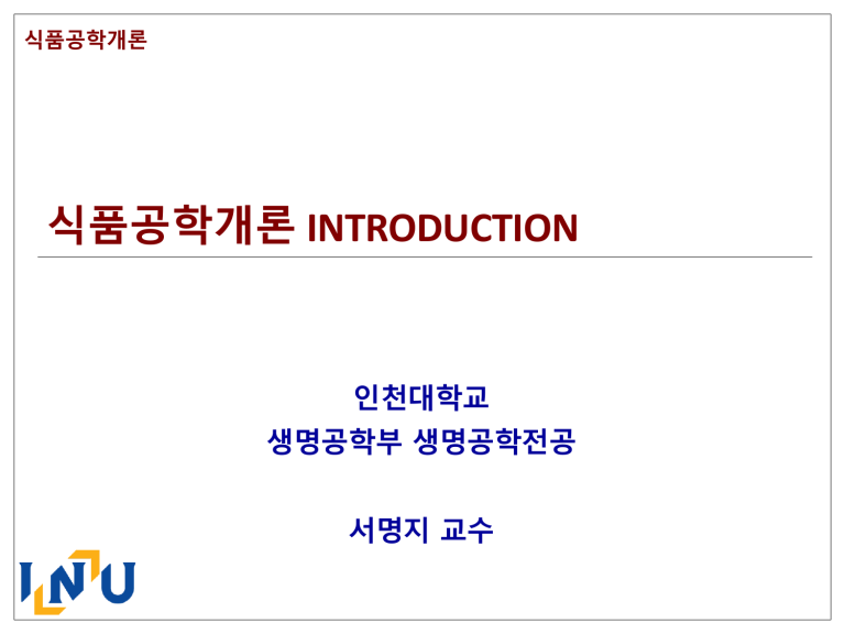 식품공학개론 식품공학개론 INTRODUCTION 인천대학교 생명공학부 생명공학전공 서명지 교수 식품공학개론 INTRODUCTION 식품과 생명 분자결합: 공유결합 • 식품의 섭취: 영양학적, 신경행동학적, 생리학적 요소 A B • 식품의 섭취를 통해 질병 예방 및 homeostasis 유지 C • 식품의 molecular formation: 공유 / 비공유 / 공유-비공유 결합 • Polar covalent bond • Nonpolar covalent bond 1. 전자 친화도의 차이 1. 전자 친화도 유사 2. 전기적 차이 2. 전기적 중립 분자결합: 비공유결합 • Noncovalent bond 1. 생명 현상의 중요한 역할 담당 2. 낮은 A 결합에너지 ① Hydrogen bond ② Ionic bond ③ Hydrophobic interaction ④ van der Waals interaction http://galleryhip.com/non-covalent-bond-examples.html 분자결합: 공유-비공유결합 식품과 기본 분자 FOODS Water 동물성 식품 Carbohydrate 식물성 식품 CELL Lipid Protein Nucleic acid 식품과 에너지 DEGRADATION 화학적 결합력이 깨지면서 화학에너지 형태의 ATP A 생산 FOOD & OMICS Food Regulation Carbohydrate DNA Gene Lipid Biosynthesis Amino acid FOOD & OMICS • 체학(體學)은 영어의 -omics를 번역한 용어이다. • 영어의 접미사 -ome은 '체'(體)로 번역되며, 현대 생명과학에서 많은 A 전부를 뜻한다. 분자들이나 세포 등의 집합체 • 체학은 체에 대해 연구하는 학문으로서, 체학에서는 생물정보학적 기법을 활용하여 기존의 단편적인 연구에서 탈피하여 복합적이고 총체적인 패러다임을 시도함으로써 대량의 생물정보와 이들간의 상호관계를 종합적으로 연구한다. • 유전체학 (GENOMICS), 전사체학 (TRANSCRIPTOMICS), 단백체학 (PROTEOMICS), 대사체학 (METABOLOMICS), 영양유전체학, 독성유전체학, 약물유전체학, 화학유전체학 등 https://ko.wikipedia.org/wiki/%EC%B2%B4%ED%95%99 FOOD & OMICS Food Regulation DNA Transcription Nutrigenomics Gene Transcriptomics mRNA Translation Proteomics Amino acid Protein (Enzyme) Metabolomics Metabolites FOOD & OMICS: EXAMPLE Food PUFAs (polyunsaturated fatty acids) Regulation DNA Transcription Reduced mRNA level Gene mRNA Translation Fatty acid synthase Amino acid Protein (Enzyme) Fat Metabolism Metabolites