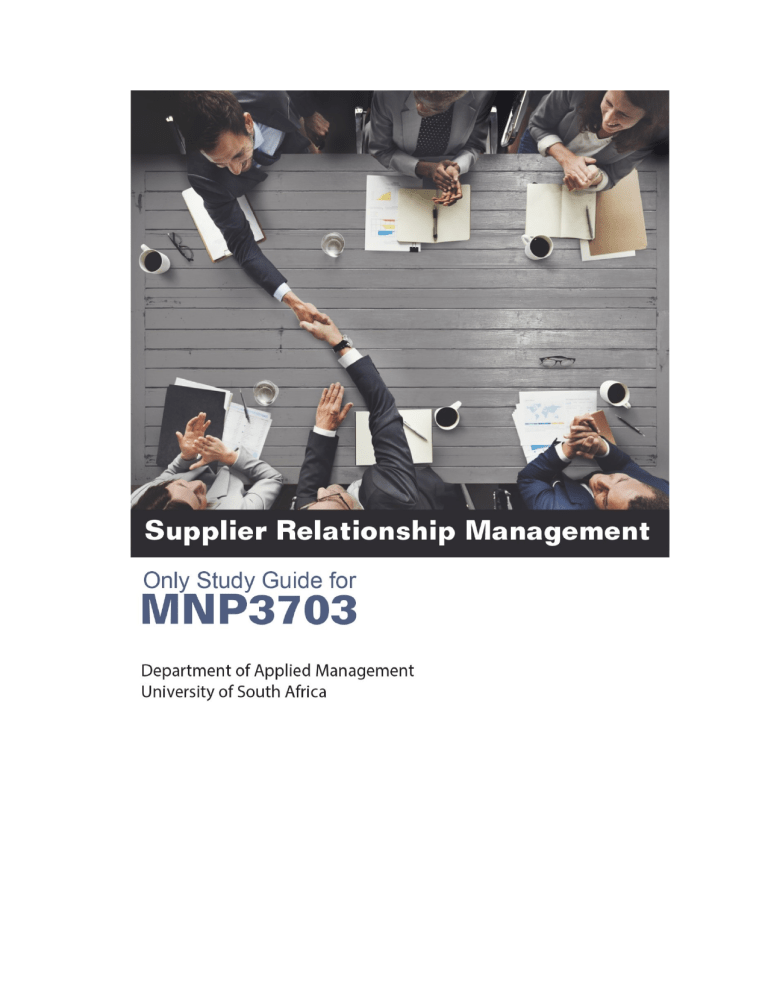 Page i Page ii © 2022 University of South Africa All rights reserved Printed and published by the University of South Africa Muckleneuk, Pretoria MNP3703/2023 Ms Word, Florida 10034072 Page iii CONTENTS Page Lesson 0: Orientation to MNP3703 iv Lesson 1: What is supplier relationship management? 1 Lesson 2: Forming buyer/supplier relationships 17 Lesson 3: Structuring buyer/supplier relationships 41 Lesson 4: Managing change 64 Lesson 5: Managing buyer/supplier contracts 78 Lesson 6: Managing supplier performance 101 Lesson 7: Negotiating with suppliers 124 Lesson 8: Terminating buyer/supplier relationships 149 Lesson 9: A generic supplier relationship management process 162 Page iv LESSON 0: ORIENTATION TO THE MNP3703 WELCOME TO THE MODULE Welcome We hope you will enjoy this module, MNP3703 and wish you all the best. If you experience any difficulties with the content of this module, do not hesitate to email your lecturer. We hope you will find MNP3703 exciting, interesting and rewarding. Siyakwemukela Siyathemba ukuthi uzowuthakasela lo mojuli MNP3703 kanti sikufisela okuhle kuphela. Uma ngabe kukhona ubunzima ohlangabezana nabo mayelana nokungaphakathi kwalo mojuli, ungathandabuzi, kodwa thumela i-imeyili kuthisha wakho. Siyathemba lokhu ku MNP3703 kuzokujabulisa futhi kuzoba yinzuzo kuwe. O amogetšwe Re holofela gore o tla ipshina ka motšule wo wa, MNP3703 gomme re go lakaletša mahlogonolo. Ge e le gore o na le mathata afe goba afe ka ga diteng tša motšule wo, o se ke wa dikadika go emeilela mofahloši wa gago. Re holofela gore o tla hwetša MNP3703 e kgahliša ebile e go putsa. Verwelkoming Ons hoop dat u hierdie module, MNP3703, sal geniet en ons wens u alles van die beste toe. Stuur gerus ʼn e-pos aan u dosent indien u enige probleme met die inhoud van hierdie module ondervind. Ons vertrou dat u MNP3703 as interessant en lonend sal ervaar. We trust that you will find this module interesting, meaningful and enriching. This module is offered by the Department of Applied Management, which is part of the College of Economic and Management Sciences at Unisa. The module carries a weighting of 12 credits and is offered as a semester module. Page v WHY STUDY THIS MODULE? Undergraduate degrees at the College of Economic and Management Sciences provide graduates with a wide range of knowledge and skills that will equip them to work in the business community. This module builds on the second-year module: Purchasing Management (MNP2601). While MNP2601 serves as a basis for understanding purchasing management in organisations as an upstream process towards suppliers, MNP3703 will show you the importance of building relationships with suppliers and how to manage these relationships. When considering your work environment, you will realise the importance of having reliable relationships with suppliers and understand the obstacles that may arise in building such relationships. You will also appreciate the effort that your organisation may put into building, developing, evaluating and managing supplier relationships. PURPOSE OF THIS MODULE Supplier Relationship Management has become increasingly popular, as buyer and supplier networks have become more global and interdependent. Consequently, companies are becoming more reliant on strategic suppliers for their overall growth and success. Hence, the purpose of this module is to equip you with knowledge, skills, attitudes and values to analyse the dynamics of supplier relationships and examine the processes and procedures to foster positive relations with suppliers. Therefore, from a buying perspective, organisations set objectives to leverage their supply base in order to improve their competitive position, both locally and globally. The module is designed for those who will have the responsibility of building, maintaining and managing relationships with suppliers. Page vi MODULE OUTCOMES On completion of this module, you should be able to: • Critically discuss the relevant key terms, concepts, models, principles and processes and their applicability within the field of supplier relationship management. • Analyse supplier relationship models that guide the formation of a buyer/supplier relationship. • Analyse the characteristics and functions of different types of buyer/supplier relationships. • Identify and critically discuss the factors that influence change in supplier relationship management. • Apply appropriate procedures and processes in supplier contract management. • Evaluate the impact of supplier performance on supplier relationship management. • Critically discuss the applicability of negotiations as a supplier relationship management tool. • Discuss the key processes for terminating stakeholder relationships. • Evaluate a generic supplier relationship management process with the aid of a diagram. • Solve problems for the management of supplier relationships. STUDY MATERIALS To successfully complete MNP3703, you will have to use the following study materials: Lessons: You need to work through nine lessons for MNP3703. The lessons are available on myUnisa. The lessons include all online material for MNP3703. Page vii Tutorial Letters: Tutorial Letter 101 will be available on the MNP3703 module site on registration. Tutorial Letter 101 contains essential information, such as general information about Unisa and important module-specific details. Throughout the semester other tutorial letters may communicate important information, such as assignment due dates. These tutorial letters will be available on the MNP3703 module site. Definitions of key terms There are several key terms that are used in all Purchasing and Supply Chain Management modules at Unisa. A document has been drawn up that includes definitions for these key terms, as well as further explanatory notes. The definitions are available on myUnisa. The definitions also form part of Tutorial Letter 101. FRAMEWORK OF THE MODULE The following table presents a