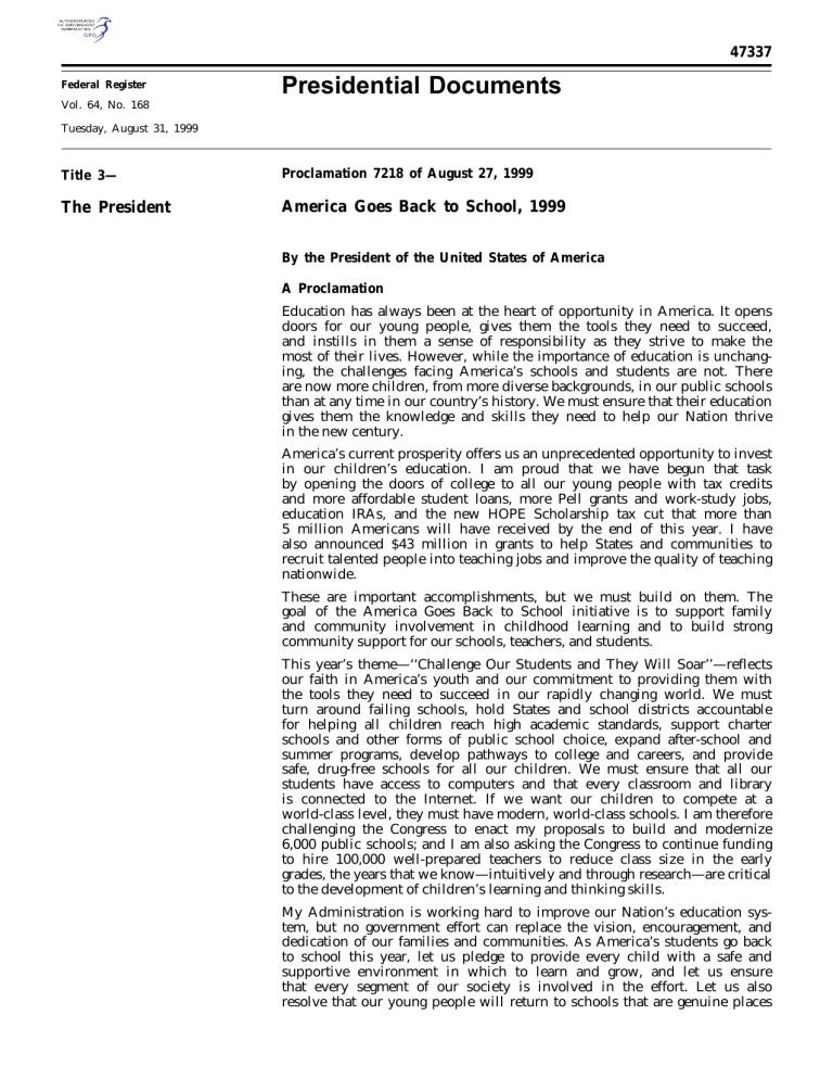 47337 Federal Register Presidential Documents Vol. 64, No. 168 Tuesday, August 31, 1999 Title 3— Proclamation 7218 of August 27, 1999 The President America Goes Back to School, 1999 By the President of the United States of America A Proclamation Education has always been at the heart of opportunity in America. It opens doors for our young people, gives them the tools they need to succeed, and instills in them a sense of responsibility as they strive to make the most of their lives. However, while the importance of education is unchanging, the challenges facing America’s schools and students are not. There are now more children, from more diverse backgrounds, in our public schools than at any time in our country’s history. We must ensure that their education gives them the knowledge and skills they need to help our Nation thrive in the new century. America’s current prosperity offers us an unprecedented opportunity to invest in our children’s education. I am proud that we have begun that task by opening the doors of college to all our young people with tax credits and more affordable student loans, more Pell grants and work-study jobs, education IRAs, and the new HOPE Scholarship tax cut that more than 5 million Americans will have received by the end of this year. I have also announced $43 million in grants to help States and communities to recruit talented people into teaching jobs and improve the quality of teaching nationwide. These are important accomplishments, but we must build on them. The goal of the America Goes Back to School initiative is to support family and community involvement in childhood learning and to build strong community support for our schools, teachers, and students. This year’s theme—‘‘Challenge Our Students and They Will Soar’’—reflects our faith in America’s youth and our commitment to providing them with the tools they need to succeed in our rapidly changing world. We must turn around failing schools, hold States and school districts accountable for helping all children reach high academic standards, support charter schools and other forms of public school choice, expand after-school and summer programs, develop pathways to college and careers, and provide safe, drug-free schools for all our children. We must ensure that all our students have access to computers and that every classroom and library is connected to the Internet. If we want our children to compete at a world-class level, they must have modern, world-class schools. I am therefore challenging the Congress to enact my proposals to build and modernize 6,000 public schools; and I am also asking the Congress to continue funding to hire 100,000 well-prepared teachers to reduce class size in the early grades, the years that we know—intuitively and through research—are critical to the development of children’s learning and thinking skills. My Administration is working hard to improve our Nation’s education system, but no government effort can replace the vision, encouragement, and dedication of our families and communities. As America’s students go back to school this year, let us pledge to provide every child with a safe and supportive environment in which to learn and grow, and let us ensure that every segment of our society is involved in the effort. Let us also resolve that our young people will return to schools that are genuine places 47338 Federal Register / Vol. 64, No. 168 / Tuesday, August 31, 1999 / Presidential Documents of learning, where they receive the care, attention, and education they need to reach their full potential. NOW, THEREFORE, I, WILLIAM J. CLINTON, President of the United States of America, by virtue of the authority vested in me by the Constitution and laws of the United States, do hereby proclaim August 29 through September 11, 1999, as a time when America Goes Back to School. I encourage parents, schools, community and State leaders, businesses, civic and religious organizations, and the people of the United States to observe this period with appropriate ceremonies and activities expressing support for high academic standards and promoting family and community involvement in providing a quality education for every child. IN WITNESS WHEREOF, I have hereunto set my hand this twenty-seventh day of August, in the year of our Lord nineteen hundred and ninety-nine, and of the Independence of the United States of America the two hundred and twenty-fourth. œ– [FR Doc. 99–22777 Filed 8–30–99; 8:45 am] Billing code 3195–01–P