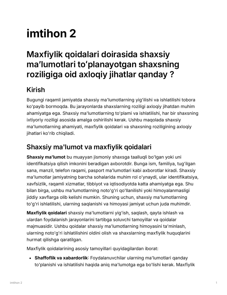 imtihon 2 Maxfiylik qoidalari doirasida shaxsiy maʼlumotlari toʻplanayotgan shaxsning roziligiga oid axloqiy jihatlar qanday ? Kirish Bugungi raqamli jamiyatda shaxsiy ma'lumotlarning yig'ilishi va ishlatilishi tobora ko'payib bormoqda. Bu jarayonlarda shaxslarning roziligi axloqiy jihatdan muhim ahamiyatga ega. Shaxsiy ma'lumotlarning to'plami va ishlatilishi, har bir shaxsning ixtiyoriy roziligi asosida amalga oshirilishi kerak. Ushbu maqolada shaxsiy ma'lumotlarning ahamiyati, maxfiylik qoidalari va shaxsning roziligining axloqiy jihatlari ko'rib chiqiladi. Shaxsiy ma'lumot va maxfiylik qoidalari Shaxsiy ma'lumot bu muayyan jismoniy shaxsga taalluqli bo'lgan yoki uni identifikatsiya qilish imkonini beradigan axborotdir. Bunga ism, familiya, tug'ilgan sana, manzil, telefon raqami, pasport ma'lumotlari kabi axborotlar kiradi. Shaxsiy ma'lumotlar jamiyatning barcha sohalarida muhim rol o'ynaydi, ular identifikatsiya, xavfsizlik, raqamli xizmatlar, tibbiyot va iqtisodiyotda katta ahamiyatga ega. Shu bilan birga, ushbu ma'lumotlarning noto'g'ri qo'llanilishi yoki himoyalanmasligi jiddiy xavflarga olib kelishi mumkin. Shuning uchun, shaxsiy ma'lumotlarning to'g'ri ishlatilishi, ularning saqlanishi va himoyasi jamiyat uchun juda muhimdir. Maxfiylik qoidalari shaxsiy ma'lumotlarni yig'ish, saqlash, qayta ishlash va ulardan foydalanish jarayonlarini tartibga soluvchi tamoyillar va qoidalar majmuasidir. Ushbu qoidalar shaxsiy ma'lumotlarning himoyasini ta'minlash, ularning noto'g'ri ishlatilishini oldini olish va shaxslarning maxfiylik huquqlarini hurmat qilishga qaratilgan. Maxfiylik qoidalarining asosiy tamoyillari quyidagilardan iborat: Shaffoflik va xabardorlik: Foydalanuvchilar ularning ma'lumotlari qanday to'planishi va ishlatilishi haqida aniq ma'lumotga ega bo'lishi kerak. Maxfiylik imtihon 2 1 siyosati tushunarli va oson kirish mumkin bo'lishi lozim. Rozilik: Shaxsiy ma'lumotlarni yig'ish va qayta ishlash uchun foydalanuvchilarning aniq va ongli roziligi olinishi kerak. Minimal ma'lumot yig'ish: Tashkilotlar faqat zarur bo'lgan ma'lumotlarni yig'ishi kerak, ortiqcha va nomaqbul ma'lumotlar yig'ish cheklanishi lozim. Ma'lumotlarni himoya qilish: Shaxsiy ma'lumotlar xavfsizlik choralariga ega bo'lishi va ruxsatsiz kirishdan himoyalanishi kerak. Foydalanuvchi huquqlari: Foydalanuvchilar o'z ma'lumotlariga kirish, ularni o'zgartirish yoki o'chirish huquqiga ega bo'lishi lozim. Shaxsning roziligining axloqiy jihatlari Shaxsning shaxsiy ma'lumotlariga nisbatan roziligi axloqiy jihatdan quyidagi asoslar bilan taqdim etiladi: O'zaro hurmat: Insonning shaxsiy ma'lumotlariga nisbatan rozilik olish orqali tashkilotlar va boshqa subyektlar shaxsni hurmat qilganliklarini namoyon etadilar. Bu, shuningdek, odamning xohishiga qarab ma'lumotlar yig'ilishini ta'minlashga yordam beradi. Ixtiyoriylik va tanlov: Foydalanuvchi o'z ma'lumotlarini to'plashga yoki ulardan foydalanishga rozilik berishda ixtiyoriy ravishda tanlov qiladi. Boshqacha aytganda, odamni majbur qilish orqali ma'lumotlarni olish axloqiy nuqtai nazardan noto'g'ri bo'ladi. Shaxsiy hayotga hurmat: Rozilik olish, shaxsiy hayotning maxfiyligiga hurmat ko'rsatishning bir shakli hisoblanadi. Agar shaxsiy ma'lumotlar unga rozilik bilan olinmasa, bu uning shaxsiy hayotiga tajovuz qilish sifatida ko'rilishi mumkin. Xabardorlik: Rozilik olish jarayonida shaxslar o'z ma'lumotlarining qanday to'planishi, ishlatilishi va himoya qilinishi haqida to'liq xabardor bo'lishlari kerak. Bu ularning ongli va erkin tanlov qilishlariga yordam beradi. Ma'lumotlarning adolatli ishlatilishi: Shaxslar o'z ma'lumotlarining faqat ilgari bildirilgan maqsadlar uchun ishlatilishini kutadilar. Rozilik olish jarayonida bu maqsadlar aniq va tushunarli tarzda taqdim etilishi lozim. imtihon 2 2 Xulosa Shaxsiy ma'lumotlarning yig'ilishi va ishlatilishi jarayonida shaxslarning roziligi axloqiy jihatdan muhim ahamiyatga ega. Bu nafaqat shaxslarning huquqlarini himoya qilish, balki jamiyatda ishonch va xavfsizlikni ta'minlashga ham xizmat qiladi. Shaxsiy ma'lumotlarni yig'ish va ishlatishda maxfiylik qoidalariga rioya qilish, shaxslarning roziligini olish va ularning huquqlarini hurmat qilish jamiyatning axloqiy va huquqiy barqarorligini ta imtihon 2 3