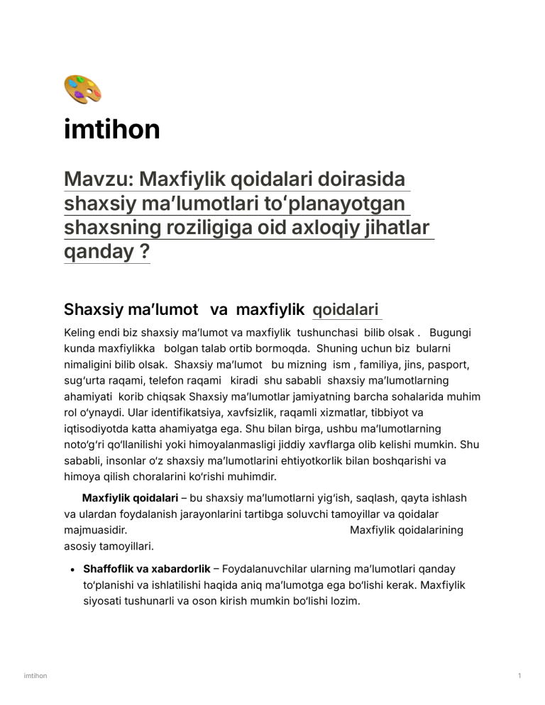🎨 imtihon Mavzu: Maxfiylik qoidalari doirasida shaxsiy maʼlumotlari toʻplanayotgan shaxsning roziligiga oid axloqiy jihatlar qanday ? Shaxsiy ma’lumot va maxfiylik qoidalari Keling endi biz shaxsiy ma’lumot va maxfiylik tushunchasi bilib olsak . Bugungi kunda maxfiylikka bolgan talab ortib bormoqda. Shuning uchun biz bularni nimaligini bilib olsak. Shaxsiy ma’lumot bu mizning ism , familiya, jins, pasport, sug‘urta raqami, telefon raqami kiradi shu sababli shaxsiy ma’lumotlarning ahamiyati korib chiqsak Shaxsiy ma’lumotlar jamiyatning barcha sohalarida muhim rol o‘ynaydi. Ular identifikatsiya, xavfsizlik, raqamli xizmatlar, tibbiyot va iqtisodiyotda katta ahamiyatga ega. Shu bilan birga, ushbu ma’lumotlarning noto‘g‘ri qo‘llanilishi yoki himoyalanmasligi jiddiy xavflarga olib kelishi mumkin. Shu sababli, insonlar o‘z shaxsiy ma’lumotlarini ehtiyotkorlik bilan boshqarishi va himoya qilish choralarini ko‘rishi muhimdir. Maxfiylik qoidalari – bu shaxsiy ma’lumotlarni yig‘ish, saqlash, qayta ishlash va ulardan foydalanish jarayonlarini tartibga soluvchi tamoyillar va qoidalar majmuasidir. Maxfiylik qoidalarining asosiy tamoyillari. Shaffoflik va xabardorlik – Foydalanuvchilar ularning ma’lumotlari qanday to‘planishi va ishlatilishi haqida aniq ma’lumotga ega bo‘lishi kerak. Maxfiylik siyosati tushunarli va oson kirish mumkin bo‘lishi lozim. imtihon 1 Rozilik – Shaxsiy ma’lumotlarni yig‘ish va qayta ishlash uchun foydalanuvchilarning aniq va ongli roziligi olinishi kerak. Minimal ma’lumot yig‘ish – Tashkilotlar faqat zarur bo‘lgan ma’lumotlarni yig‘ishi kerak, ortiqcha va nomaqbul ma’lumotlar yig‘ish cheklanishi lozim. Ma’lumotlarni himoya qilish – Shaxsiy ma’lumotlar xavfsizlik choralariga ega bo‘lishi va ruxsatsiz kirishdan himoyalanishi kerak. Foydalanuvchi huquqlari – Foydalanuvchilar o‘z ma’lumotlariga kirish, ularni o‘zgartirish yoki o‘chirish huquqiga ega bo‘lishi lozim. Maxfiylik qoidalarini xalqaro qonunlar bir nechtasini ko’rib chiqsak bular qaysilar. GDPR (General Data Protection Regulation-Yevropa Ittifoqi) – 2018-yilda kuchga kirgan ushbu qonun shaxsiy ma’lumotlarni himoya qilishga qaratilgan. U foydalanuvchilarga o‘z ma’lumotlarini nazorat qilish huquqini beradi va qonunbuzarliklarga katta jarimalar belgilaydi. CCPA (California Consumer Privacy Act-Kaliforniya, AQSh) – Ushbu qonun foydalanuvchilarga o‘z shaxsiy ma’lumotlarini nazorat qilish, ma’lumotlar sotilishiga qarshilik bildirish huquqini beradi. PDPA (Personal Data Protection Act-Osiyo mamlakatlari) – Singapur, Malayziya va boshqa davlatlarda shaxsiy ma’lumotlarni qonuniy himoya qilish bo‘yicha qabul qilingan qonunlar. Shaxsiy ma'lumotlarning to‘plami va ishlatilishi, har bir shaxsning ixtiyoriy roziligi asosida amalga oshirilishi kerak. Bu axloqiy jihatdan juda muhim, chunki insonning o‘z shaxsiy ma'lumotlariga nisbatan egallagan huquqlari ularning tanlovi va xavfsizligini ta'minlaydi. Rozilik axloqiy jihatdan quyidagi asoslar bilan taqdim etiladi: O‘zaro hurmat: Insonning shaxsiy ma'lumotlariga nisbatan rozilik olish orqali tashkilotlar va boshqa subyektlar shaxsni hurmat qilganliklarini namoyon etadilar. Bu, shuningdek, odamning xohishiga qarab ma'lumotlar yig‘ilishini ta'minlashga yordam beradi. Ixtiyoriylik va tanlov: Foydalanuvchi o‘z ma'lumotlarini to‘plashga yoki ulardan foydalanishga rozilik berishda ixtiyoriy ravishda tanlov qiladi. Boshqacha imtihon 2 aytganda, odamni majbur qilish orqali ma'lumotlarni olish axloqiy nuqtai nazardan noto‘g‘ri bo‘ladi. Shaxsiy hayotga hurmat: Rozilik olish, shaxsiy hayotning maxfiyligiga hurmat ko‘rsatishning bir shakli hisoblanadi. Agar shaxsiy ma'lumotlar unga rozilik bilan olinmasa, bu uning shaxsiy hayotiga tajovuz qilish sifatida ko‘rilishi mumkin. Rozilik, shuningdek, maxfiylik siyosatiga nisbatan shaxsning to‘liq xabardorligini ta'minlaydi. Bu, foydalanuvchining qanday ma'lumotlari yig‘ilayotganini, ular qanday ishlatilishini va ular qanday himoya qilinishini tushunishini ta'minlashga yordam beradi. imtihon 3