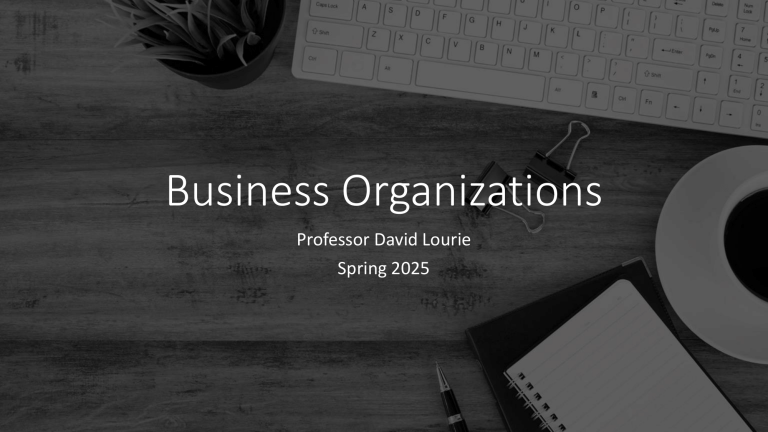 Business Organizations Professor David Lourie Spring 2025 WELCOME! • Expectations – you are all adults, and I treat this class as if it were a professional job (great for the diligent; bad for the others). • Course and Syllabus Review Agency • An agency relationship involves the delegation of responsibility or authority by one person, the “principal,” to another person, the “agent.” • Agent acts in a representative capacity, on behalf of the principal. • Business associations can only act through agents. • Ex. – partnership, corporation, or LLC – a partner or representative must sign K on behalf of the entity. -Agency law applies to individuals as well as business associations. -ex. – sports agent, real estate agent Requirements for Establishing Agency Relationship 1.) Consent -both the principal and the agent must consent to the agent’s acting on the principal’s behalf. -The consent of the principal alone or the agent alone is not sufficient. -Consent may be oral, written or implied from a party’s conduct. 2.) Control -an agency relationship requires the agent to be subject to the principal’s control. -Many courts have construed this requirement to mean that the principal must have the right to control the way the agent performs the task, not that the principal must actually exercise control over the agent’s performance. NOT Required for an Agency Relationship 1.) Consideration -agency law does not require that an agent receive consideration (payment) for their services. 2.) Signed Writing -agreement between principal and agent does not need to be in writing, unless it falls within the statute of frauds. Agency – Tort and Contract • Agency Issues may arise in tort or contract. Tort • A typical case involves a tort committed by an employee. Thus, the question is usually whether the employer will also be liable to the injured third party for the employee’s tort. Contract • When an agent enters a contract with a third party, the primary issue is whether the principal is liable to the third party on that contract. Partnership Law • Uniform Partnership Act (“UPA”) has been adopted by most states to uniformize state partnership law. • Forming a general partnership entails far fewer formalities than forming other types of business associations. • The UPA § 6 defines a partnership as “an association of two or more persons to carry on as co-owners a business for profit.” Partnership Definition Elements • Association • even if those persons did not intend to form a partnership, a court may find that a partnership exists regardless of their intent. Persons • “person,” as defined in the UPA § 2, includes entities as well. “To carry on” • a partnership may have a limited duration or be formed to accomplish a specific purpose. Partnership, cont. • “Business for profit” • A partnership must involve a business as opposed to a hobby and must be established as a profit-making enterprise. • Thus, you cannot have a non-profit partnership, even though you can have a non-profit corporation under state corporate law. “Co-owners” • Under the UPA § 7(4), a person who has a right to share in profits is presumed to be a partner. • Can be rebutted with contrary evidence. Limited Liability Entities • One of the most important ways in which transactional lawyers can create value their clients is by helping them choose appropriate organizational structures for their businesses. • Until recently, the only important standard form contracts provided were the corporation and the general partnership. • In the last decade or so, a third standard form contract has been added to this short list of options: the LLC. LLCs have been around for a couple of decades. • Prior to 1988, however, only a few states had adopted LLC statutes and very few had been formed. In 1988, the situation changed dramatically. • The Internal Revenue Service concluded that LLCs could be classified as a partnership for federal tax purposes. • With that development, the concept took off. Many states adopted LLC statutes and numerous LLCs have been formed. LLCs • popularity of LLCs. • They provide a standard form contract that incorporates many of the most attractive features of partnerships and corporations. • The LLC is a unincorporated business organization that can provide its members with pass through tax treatment, limited liability, and the ability to actively participate in firm management. LLCs • The LLC differs from a partnership—and resembles a corporation—in that an LLC can only be created by filing articles of organization with the Secretary of State. • The articles of organization are comparable to corporate articles of incorporation and are treated as such by the statute with respect to such questions as amendment and filing. • In addition, the LLC may adopt an operating agreement, which fulfills many of the same functions as a partnership agreement or corporate bylaws. LLCs • Typical LLC statutes provide flexibility. • The default rule is comparable to the general partnership form, vesting management in the LLC’s members. • In some states, the number of votes cast by each member is voting is determined by their proportional share in the book value of the membership interests; in others, the partnership rule of one person one vote is used. • In general, both of these rules are subject to any contrary provisions of the articles of organization and operating agreement. • The LLC thus provides substantial flexibility in structuring the firm’s decisionmaking processes. CORPORATIONS • distinction between publicly traded corporations and those that are closely held. • of the 5 million or so corporations in the United States, only about 50,000 are publicly traded and of those, only about 10,000 are on a major exchange. • most lawyers who represent corporations will represent closely held companies, no