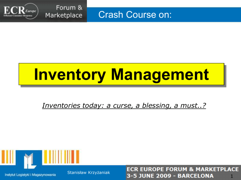 Crash Course on: Inventory Management Inventories today: a curse, a blessing, a must..? Stanisław Krzyżaniak 1 Course programme: 1. Why do we keep inventories? 2. Typical demand classifications and analyses helpful in inventory management. 3. Why high quality forecasting is so important for inventory management? 4. Cost aspects of inventory management. 5. Material Decoupling Point - dependent and independent demands, deterministic and stochastic approaches to inventory management. Stanisław Krzyżaniak 2 Course programme: 6. Calculation of safety and cycle stock. 7. Classical stock replenishment systems (Reorder Point and Cycle Review) and their typical combinations. 8. Safety stock in case of dispersed inventories (square-root law). 9. Information Decoupling Point concept and its role in reduction of stock levels. 10. Review of selected logistics concepts and solutions oriented on stock reduction/rationalisation . Stanisław Krzyżaniak 3 Course programme: 1. Why do we keep inventories? 2. Typical demand classifications and analyses helpful in inventory management. 3. Why high quality forecasting is so important for inventory management? 4. Cost aspects of inventory management. 5. Material Decoupling Point - dependent and independent demands, deterministic and stochastic approaches to inventory management. Stanisław Krzyżaniak 4 Crash Course on Inventories Why do we keep inventories? Stanisław Krzyżaniak 5 Why do we keep inventories? Inventory (stock) - materials in a supply chain or in a segment of a supply chain, expressed in quantities, locations and/or values, not used at present, but kept for the future use (consumption/ /sale). Based on ELA Terminology Stanisław Krzyżaniak 6 THROUGHPUT TIME IN A SUPPLY CHAIN Why do we keep inventories? 5% Utility value 95% Stanisław Krzyżaniak Among others, keeping inventories is also here. ? 7 Why do we keep inventories? Income - Costs Customer service = Profit Working capital Return on Investment Inventories Stanisław Krzyżaniak 8 Why do we keep inventories? Income - Costs Customer service = Profit Working Assets capital Return on Investment Assests Inventories Stanisław Krzyżaniak 9 Why do we keep inventories? Stock classification By type and position in a pipeline Materials stock (raw materials, components) Work-in-progress stock Finished products stock Spare parts and auxiliary materials stock Stanisław Krzyżaniak 10 Why do we keep inventories? Deliveries Raw materials and components Production Raw materials and components Work-in-progress Distribution Finished products Consumer goods Work-in-progress Auxillary materials, spare parts Stanisław Krzyżaniak 11 Why do we keep inventories? Do you keep a stock of bread in your household? Stanisław Krzyżaniak 12 Why do we keep inventories? Do you keep a stock of bread in your household? Stanisław Krzyżaniak 13 Why do we keep inventories? Stock classification By the reasons for keeping Cycle stock Safety stock Seasonal stock „Speculation” stock Strategic stock Stanisław Krzyżaniak 14 Why do we keep inventories? Stock classification By rotation Fast moving (rotating) stock Slow moving (rotating) stock Not moving (rotating) stock • Obsolete stock • Emergency stock Stanisław Krzyżaniak 15 Why do we keep inventories? Stock structure Q Cycle stock SC SS Safety stock Surplus stock Ssp Stanisław Krzyżaniak 16 Why do we keep inventories? Stock maintaining, replenishment and its quantity result from: uncertainty of real demand, uncertainty of real quantity, quality and timing of deliveries, seasonal access to some materials and goods, service level required by a customer, expected difficulties with an access to some goods (expected rise of prices), discounts offered for purchases of larger quantities, some technical and/or organisational conditions of deliveries. Stanisław Krzyżaniak 17 Why do we keep inventories? Cycle stock: Lack of possibilities to fully synchronise supplies with consumption, Technical and/or organisational conditions (limitations), Economic incentives (discounts). Safety stock: Random fluctuations of demand, Forecast errors, Long replenishment lead times, Unpredictable delays, Required service level. Surplus stock: Miscalculation of factors influencing safety stock, Wrong estimation of the required service level, Excessive safety measures taken to avoid stock-outs. Stanisław Krzyżaniak 18 Why do we keep inventories? So, is this good or bad to have inventories? Good, because they: Bad, because they: Guarantee a continuous access to all Take space (warehouses), kinds of goods when supplies are discontinues, Guarantee access to goods in periods when they are not available, Ensure required service level compensating random variations of demand, Ensure required service level compensating delays of deliveries random variations of replenishment lead time. Cost money (space, losses, capital); Stanisław Krzyżaniak carrying stock may cost annually up to 30% of its value. 19 Course programme: 1. Why do we keep inventories? 2. Typical demand classifications and analyses helpful in inventory management. 3. Why high quality forecasting is so important for inventory management? 4. Cost aspects of inventory management. 5. Material Decoupling Point - dependant and independent demands, deterministic and stochastic approaches to inventory management. Stanisław Krzyżaniak 20 Crash Course on Inventories Demand analyses Stanisław Krzyżaniak 21 Demand analyses • ABC analysis, • XYZ analysis, • Customer and supplier related analyses, • Trends & Seasonality, • Random deviations - demand profile, • Life-cycle analysis, • Identification of „wild” demand . Stanisław Krzyżaniak 22 Demand analyses - ABC classification No Item code 1 10-01 2 3 No of used/sold items Unit price Value of used/sold items Cummulated value of used/sold items 15344 3,5 53 704,00 53 704,00 7,0% 10-02 23 76,1 1 750,30 55 454,30 7,2% 10-03 557 11 6 127,00 61 581,30 8,0% 4 10-04 1
