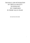 THE ROLE AND INTEGRATION OF VIRTUAL REALITY TECHNOLOGY BY COMPANIES IN THEIR VALUE CHAIN ESCARAVAGE HELOISE i TABLE OF CONTENTS: 1)Literature review: 1.1 - VR ..…………………………………………………………………………p.1 1.2 - Primary/secondary activities theories……………...………………………..p.6 1.3 - Deductive qualitative method……………………………………………….p.7 2) Sources and Methods of Collecting Data & Limitations 2.1 - Research questions and sub research questions……………………...…..…p.8 2.2 - Explanations on how the thesis will be conducted……………………..…..p.9 2.3 - Method…………………………………………………………………..…p.10 3) Analysis/ recommendations/conclusions 3.1- Results, data analysis……………………………………...………………..p.12 3.2 -Discussions…………………………………………………..………….….p.19 4) Sources…………………………………………………………...…...……p.20 ii 1)Literature review: Before jumping into the sources and methods of collecting data, a literature review of core elements of the research is necessary to better apprehend and define them. These already existing definitions, more or less technical of VR technology, VR market situation, Primary and Support activities theories in a business, and the Deductive method, strengthen a theoretical view of such core elements and feeds us with knowledge to better apprehend data gathering, and to have a deeper and more interesting discussion that will answer to the research question. 1.1 - Virtual Reality definition overview: The authors William R. Sherman, Alan B. Craig (2018) define Virtual Reality by combining both virtual and reality definitions from Webster New Universal Unabridged dictionary in 1989. Virtual: “being in essence or effect, not in fact”, is directly related to computers and data storage hardware. Reality is:“Something that exists independently of ideas concerning it. Something that constitutes a real or actual thing as distinguished from something that is merely apparent”. Reality is a place that exists and we can experience. Their final definition of Virtual Reality is “A medium composed of interactive computer simulation that senses the participant’s position and action and replace or argument the feedback to one or more senses, giving the feeling of being mentally immersed or present in the simulation (a virtual world).” VR indeed gives users a sense of activity (Grigore C. Burdea, Philippe Coiffet, Wiley Interscience, 2013). Virtual reality (VR) terminology constitutes a paradox. Indeed, this reality isn’t real because programed and virtual. But the system and technologies allowing a VR experience make this fake virtual reality as realistic and immersive as possible. This is why William R. Sherman and Alan B. Craig, 2003, state the four basic features of VR: “immersion, interaction, collaboration, and flexible narrative.” Two basic distinctions of input to a VR application also exist: user monitoring and world monitoring. Grigore C. Burdea, Philippe Coiffet and Wiley Interscience, (2013) teach us that VR’s essence can be summarized by three conceptual core elements, named as the three “I’s”: “Immersion” (the experience has to look real to users for them to be captivated), “Interaction” (responsive to users’ input) and “Imagination” (user ability to interpret VR elements and their VR experience as real through their own imagination) (www.virsabi.com). Grigore C. Burdea, Philippe Coiffet, Wiley Interscience (2013) further add that VR is “a simulation in which computer graphics is used to create a realistic-looking world”. VR makes an unreal environment look real, to confuse human brain with graphics and details. The VR universe created is moreover reactive to the users’ “input” thanks to sensors technology. This is “real-time interactivity”, core to VR. This enables users be the actors of their experience in this virtual universe, just like they are the actors of their own life. VR gives them an impression and a sense of control. It “captivates” their attention. VR however is a computer simulation, programmed and fully controlled by engineers other than the users. VR also is a new form of media, used to deliver a message. It can have multiple forms: the system transmission of a physical act of resistance over a surface (surgery in medicine), persuasive (in marketing to convince buyers to purchase a product) or more subtle (admire the beauty of virtual graphics and enjoy a unique VR experience). VR terminology is still young and rapidly evolving. It is sometimes mentioned without really knowing its meaning. Practitioners and scholars’ definition of VR isn’t the same as marketing specialists and the mass media. They solely consider its potential to increase productivity. Little we know about VR, bigger misinterpretation and unclear understanding of it we hold. 1 The author William R. Sherman, Alan B. Craig (2018) further list additional key VR components: “the medium”, “the human participant”, “physical immersion technology”, “virtual world presentation” and “interaction”. Human participant and virtual world presentation constitute respectively the human input and output on both medium side. Those people as human input (human input force that interacts and experiences VR technology in different unique ways) and output (designers of the VR world who want to communicate to VR users their own idea of VR experience, sensitivity, interpretation and meaning of VR) are key to define VR. VR is the response of a computer program to the user’s inputs through connected sensor objects, which are the communication medium between the user and the computer program. All in all, VR is the communication between human inputs with pre