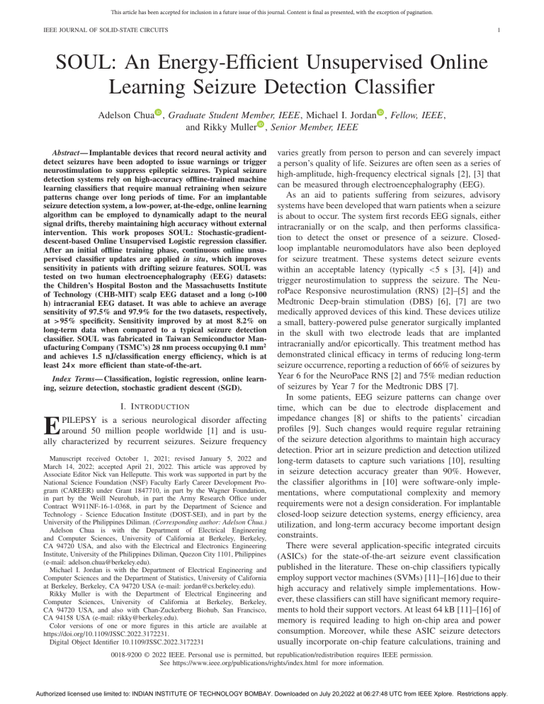 This article has been accepted for inclusion in a future issue of this journal. Content is final as presented, with the exception of pagination. IEEE JOURNAL OF SOLID-STATE CIRCUITS 1 SOUL: An Energy-Efficient Unsupervised Online Learning Seizure Detection Classifier Adelson Chua , Graduate Student Member, IEEE, Michael I. Jordan , Fellow, IEEE, and Rikky Muller , Senior Member, IEEE Abstract— Implantable devices that record neural activity and detect seizures have been adopted to issue warnings or trigger neurostimulation to suppress epileptic seizures. Typical seizure detection systems rely on high-accuracy offline-trained machine learning classifiers that require manual retraining when seizure patterns change over long periods of time. For an implantable seizure detection system, a low-power, at-the-edge, online learning algorithm can be employed to dynamically adapt to the neural signal drifts, thereby maintaining high accuracy without external intervention. This work proposes SOUL: Stochastic-gradientdescent-based Online Unsupervised Logistic regression classifier. After an initial offline training phase, continuous online unsupervised classifier updates are applied in situ, which improves sensitivity in patients with drifting seizure features. SOUL was tested on two human electroencephalography (EEG) datasets: the Children’s Hospital Boston and the Massachusetts Institute of Technology (CHB-MIT) scalp EEG dataset and a long (>100 h) intracranial EEG dataset. It was able to achieve an average sensitivity of 97.5% and 97.9% for the two datasets, respectively, at >95% specificity. Sensitivity improved by at most 8.2% on long-term data when compared to a typical seizure detection classifier. SOUL was fabricated in Taiwan Semiconductor Manufacturing Company (TSMC’s) 28 nm process occupying 0.1 mm2 and achieves 1.5 nJ/classification energy efficiency, which is at least 24× more efficient than state-of-the-art. Index Terms— Classification, logistic regression, online learning, seizure detection, stochastic gradient descent (SGD). I. I NTRODUCTION E PILEPSY is a serious neurological disorder affecting around 50 million people worldwide [1] and is usually characterized by recurrent seizures. Seizure frequency Manuscript received October 1, 2021; revised January 5, 2022 and March 14, 2022; accepted April 21, 2022. This article was approved by Associate Editor Nick van Helleputte. This work was supported in part by the National Science Foundation (NSF) Faculty Early Career Development Program (CAREER) under Grant 1847710, in part by the Wagner Foundation, in part by the Weill Neurohub, in part the Army Research Office under Contract W911NF-16-1-0368, in part by the Department of Science and Technology - Science Education Institute (DOST-SEI), and in part by the University of the Philippines Diliman. (Corresponding author: Adelson Chua.) Adelson Chua is with the Department of Electrical Engineering and Computer Sciences, University of California at Berkeley, Berkeley, CA 94720 USA, and also with the Electrical and Electronics Engineering Institute, University of the Philippines Diliman, Quezon City 1101, Philippines (e-mail: adelson.chua@berkeley.edu). Michael I. Jordan is with the Department of Electrical Engineering and Computer Sciences and the Department of Statistics, University of California at Berkeley, Berkeley, CA 94720 USA (e-mail: jordan@cs.berkeley.edu). Rikky Muller is with the Department of Electrical Engineering and Computer Sciences, University of California at Berkeley, Berkeley, CA 94720 USA, and also with Chan-Zuckerberg Biohub, San Francisco, CA 94158 USA (e-mail: rikky@berkeley.edu). Color versions of one or more figures in this article are available at https://doi.org/10.1109/JSSC.2022.3172231. Digital Object Identifier 10.1109/JSSC.2022.3172231 varies greatly from person to person and can severely impact a person’s quality of life. Seizures are often seen as a series of high-amplitude, high-frequency electrical signals [2], [3] that can be measured through electroencephalography (EEG). As an aid to patients suffering from seizures, advisory systems have been developed that warn patients when a seizure is about to occur. The system first records EEG signals, either intracranially or on the scalp, and then performs classification to detect the onset or presence of a seizure. Closedloop implantable neuromodulators have also been deployed for seizure treatment. These systems detect seizure events within an acceptable latency (typically <5 s [3], [4]) and trigger neurostimulation to suppress the seizure. The NeuroPace Responsive neurostimulation (RNS) [2]–[5] and the Medtronic Deep-brain stimulation (DBS) [6], [7] are two medically approved devices of this kind. These devices utilize a small, battery-powered pulse generator surgically implanted in the skull with two electrode leads that are implanted intracranially and/or epicortically. This treatment method has demonstrated clinical efficacy in terms of reducing long-term seizure occurrence, reporting a reduction of 66% of seizures by Year 6 for the NeuroPace RNS [2] and 75% median reduction of seizures by Year 7 for the Medtronic DBS [7]. In some patients, EEG seizure patterns can change over time, which can be due to electrode displacement and impedance changes [8] or shifts to the patients’ circadian profiles [9]. Such changes would require regular retraining of the seizure detection algorithms to maintain high accuracy detection. Prior art in seizure prediction and detection utilized long-term datasets to capture such variations [10], resulting in seizure detection accuracy greater than 90%. However, the classifier algorithms in [10] were software-only implementations, where computational complexity and memory requirements were not a design consideration. For implantable closed-loop seizure detection systems, energy efficiency, area utilization, and long-term accuracy become important design constraints. T